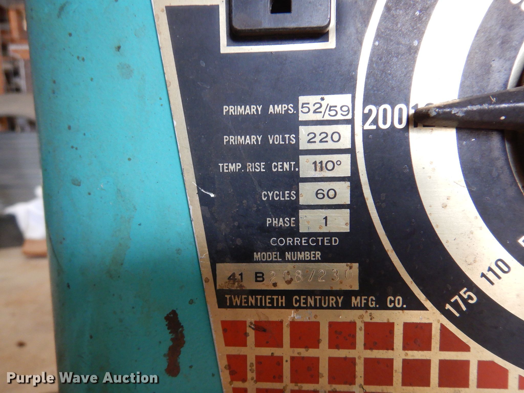 Purple Wave is selling a used Welder (Manual) in Kansas. This item is a Twentieth Century 41B208/230 welder with the following: Volts: 220, Phase: Single, Amps: 250