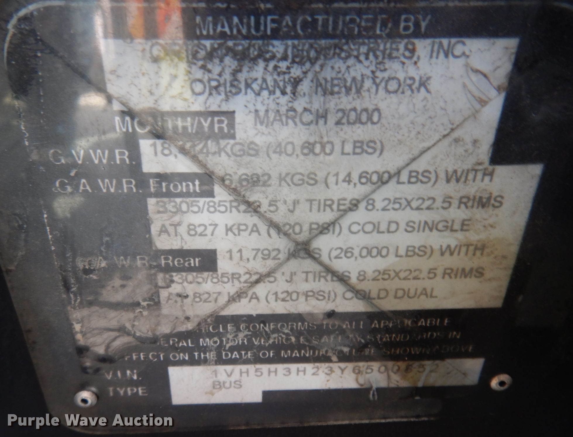 2000 Orion transit bus. Miles: 499,025 on odometer, VIN: 1VH5H3H23Y6500852, Unit #: 37. Engine Cylinders: 6, Fuel type: Diesel. Transmission Automatic. Chassis Axles: Single, Brakes: Air, GVWR: 40,600 lbs. Interior Heat, Seats Adult seats: 36, Wheelchair lift. Tires Size: 12R22.5. Notes Bike racks, hangover displays, two-way radios, and driver camera not included, Non-operational unit. Colorado title. Town of Winter Park Public Works Dept.. 1471 Winter Park Dr. Winter Park, CO 80482
