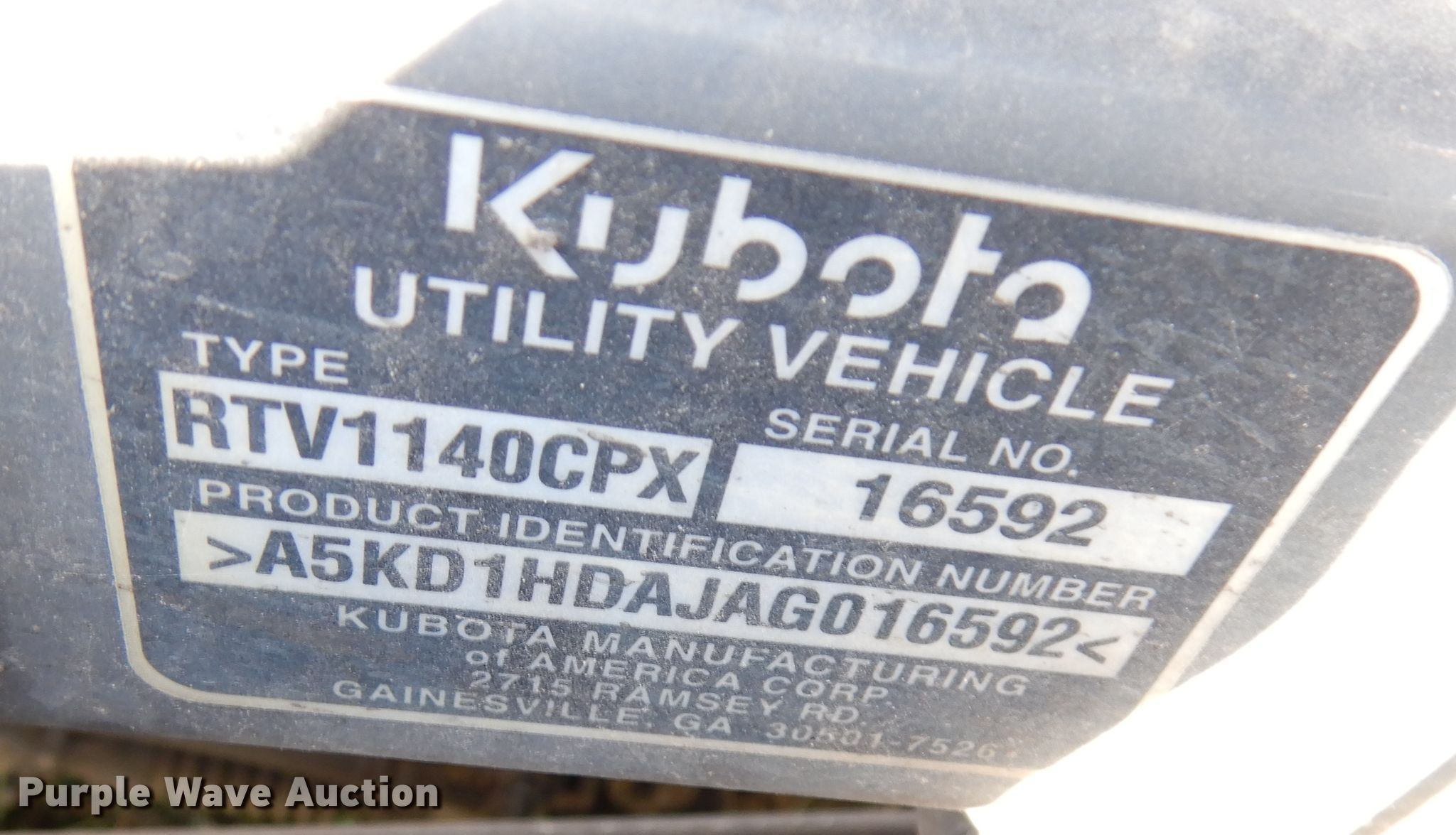Purple Wave is selling a used Utility Vehicle in Kansas. This item is a 2010 Kubota RTV11400CPX utility vehicle with the following: Hours: 1,930 on meter, VIN: A5KD1HDAJAG016592, Serial: 16592