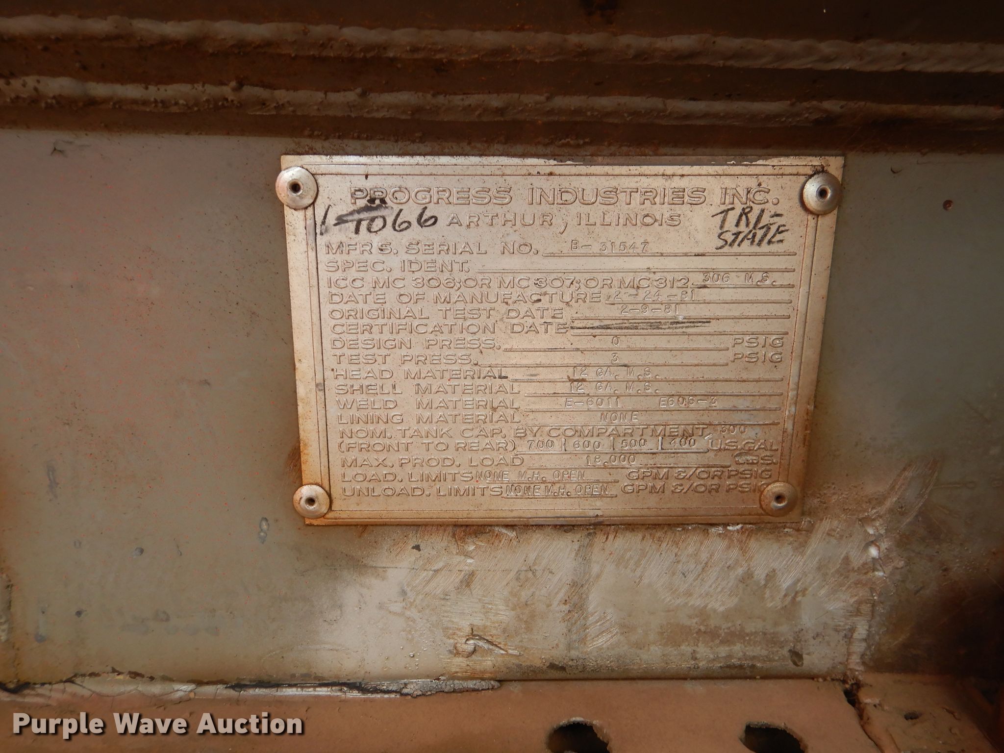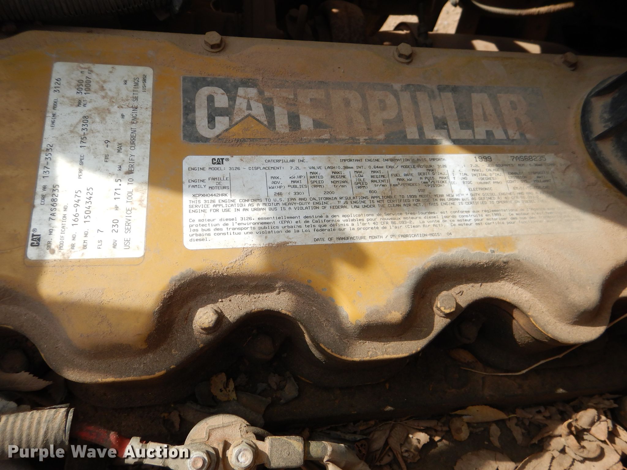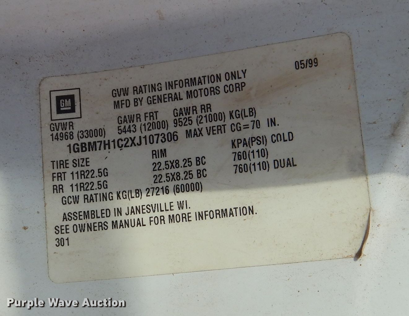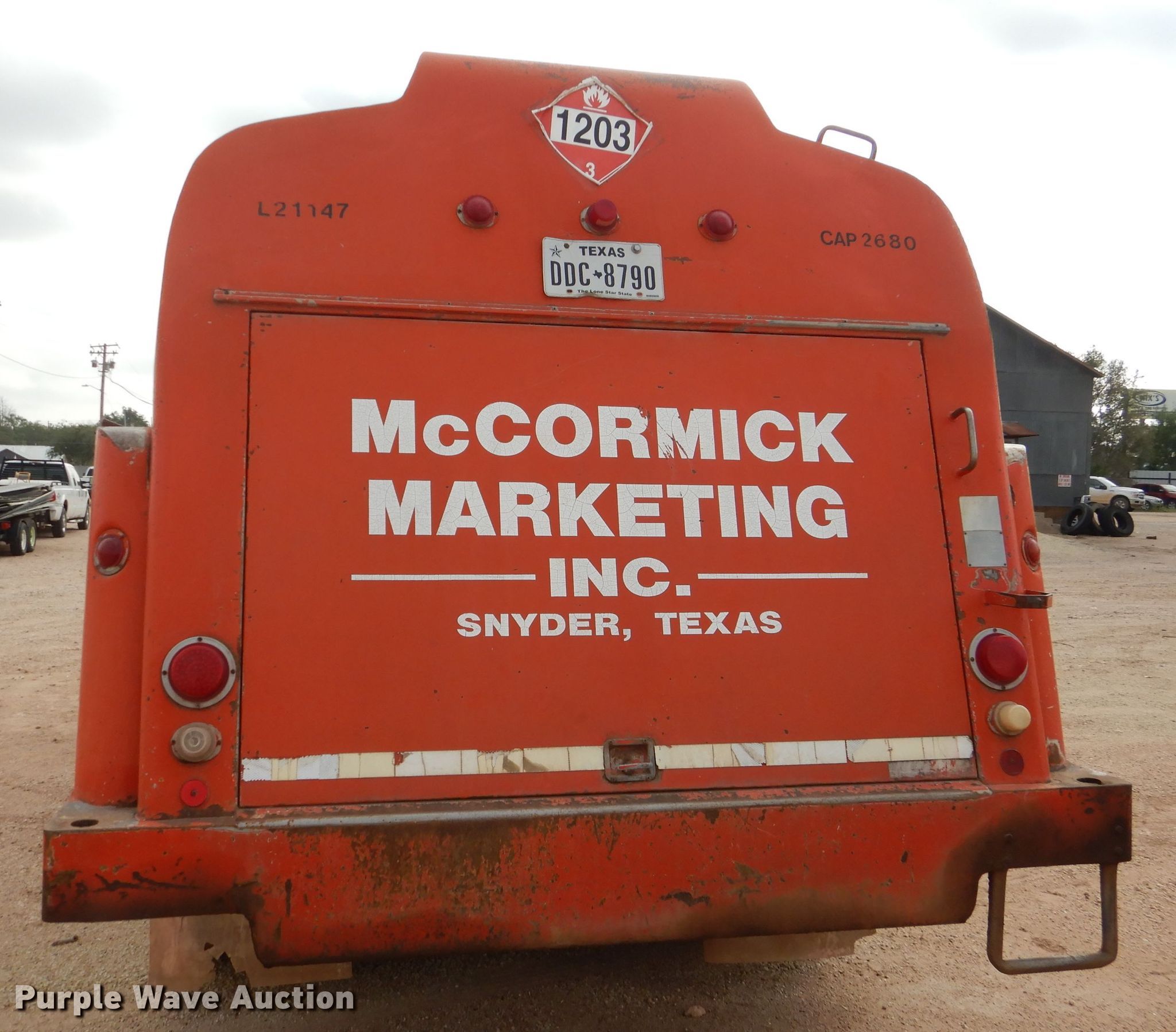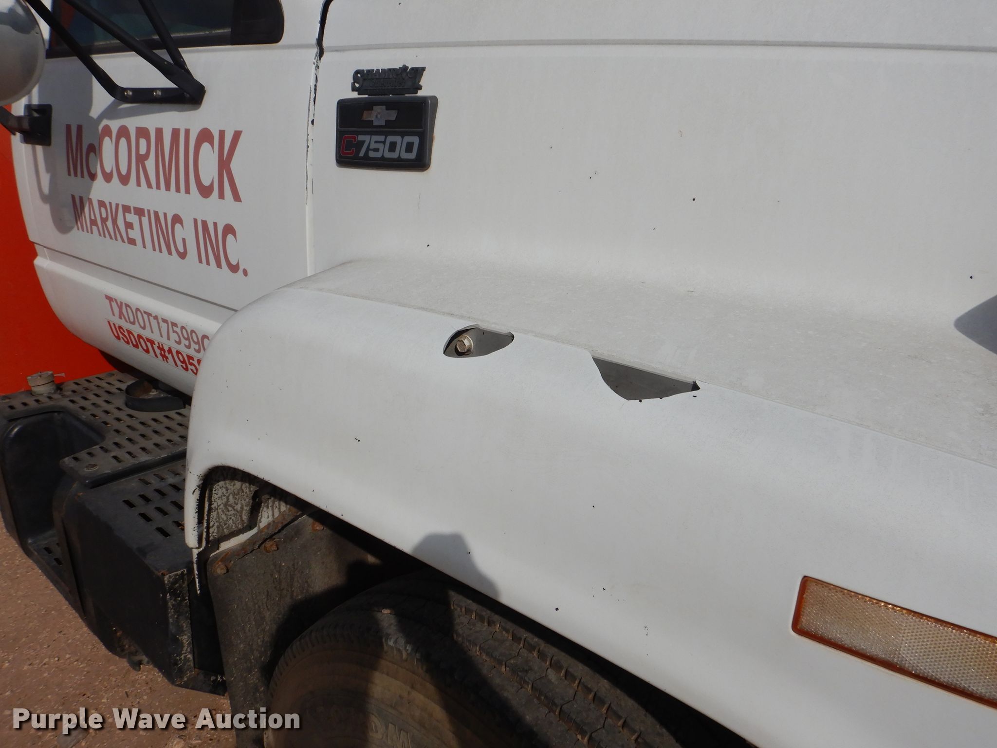 1999 Chevrolet C7500 fuel truck. Miles: 281,816 on odometer, VIN: 1GBM7H1C2XJ107306. Engine Caterpillar 3126, Serial: 7AS68235, Displacement: 7.2L, Cylinders: 6, Fuel type: Diesel, HP: 230. Transmission Manual, Speed: 6. Chassis Axles: Single, Suspension: Spring, Brakes: Air, PTO, GVWR: 33,000 lbs, Wheelbase: 212". Interior AC, Heat. Operational Bed / tank Progress Industries, Serial: B-13547, Capacity: 2,500 gallons, 17' 6" L x 8' W, Compartments: 5, Hose reels: 1 Length: 100', Metered pumps: 1 Make: Liquid Controls.. Tires Size: 11R/22.5. Notes Non-operational unit. Texas title. McCormick Marketing, dba Legacy Fuels. 2401 Ave Q. Snyder, TX 79549