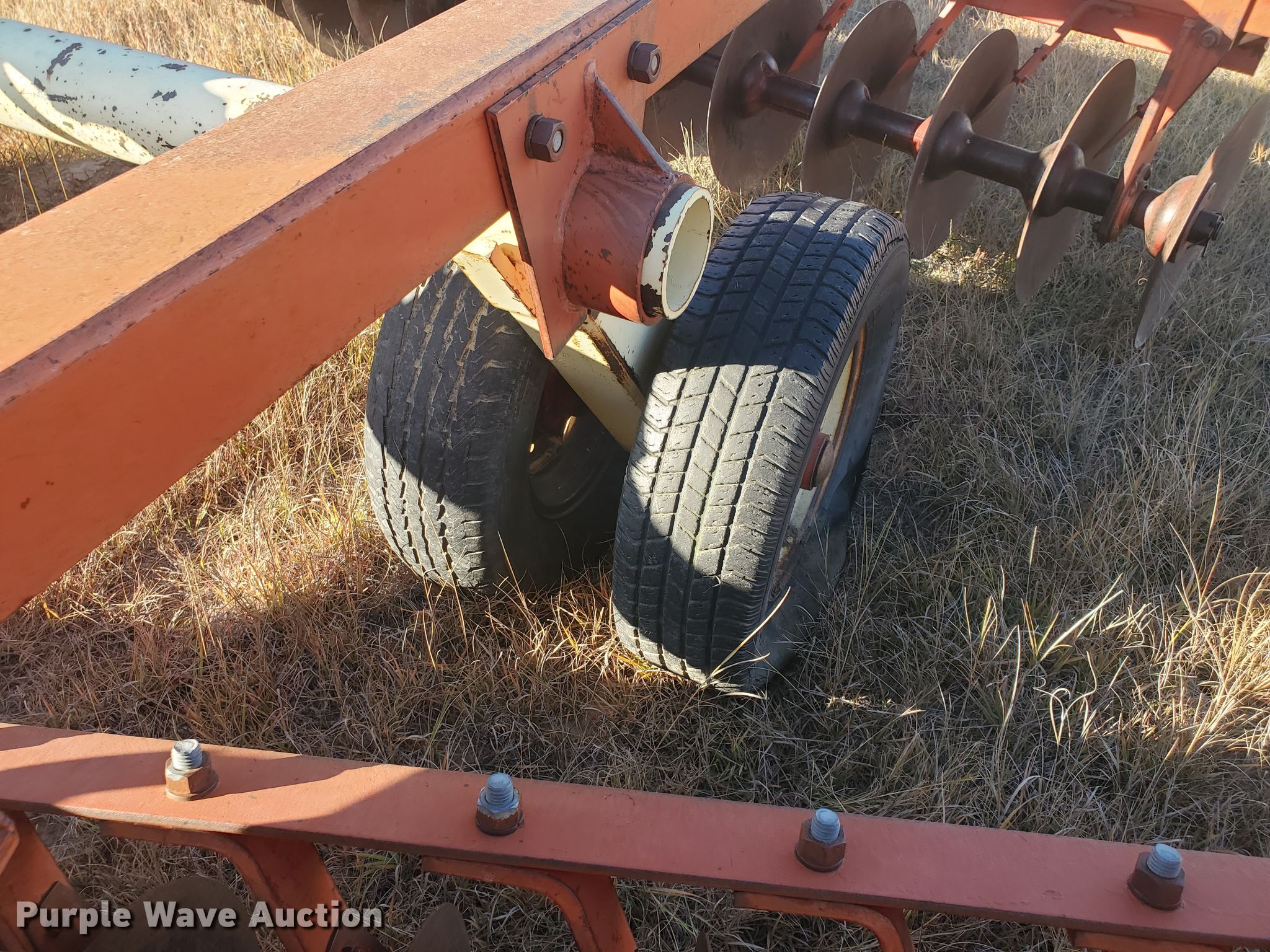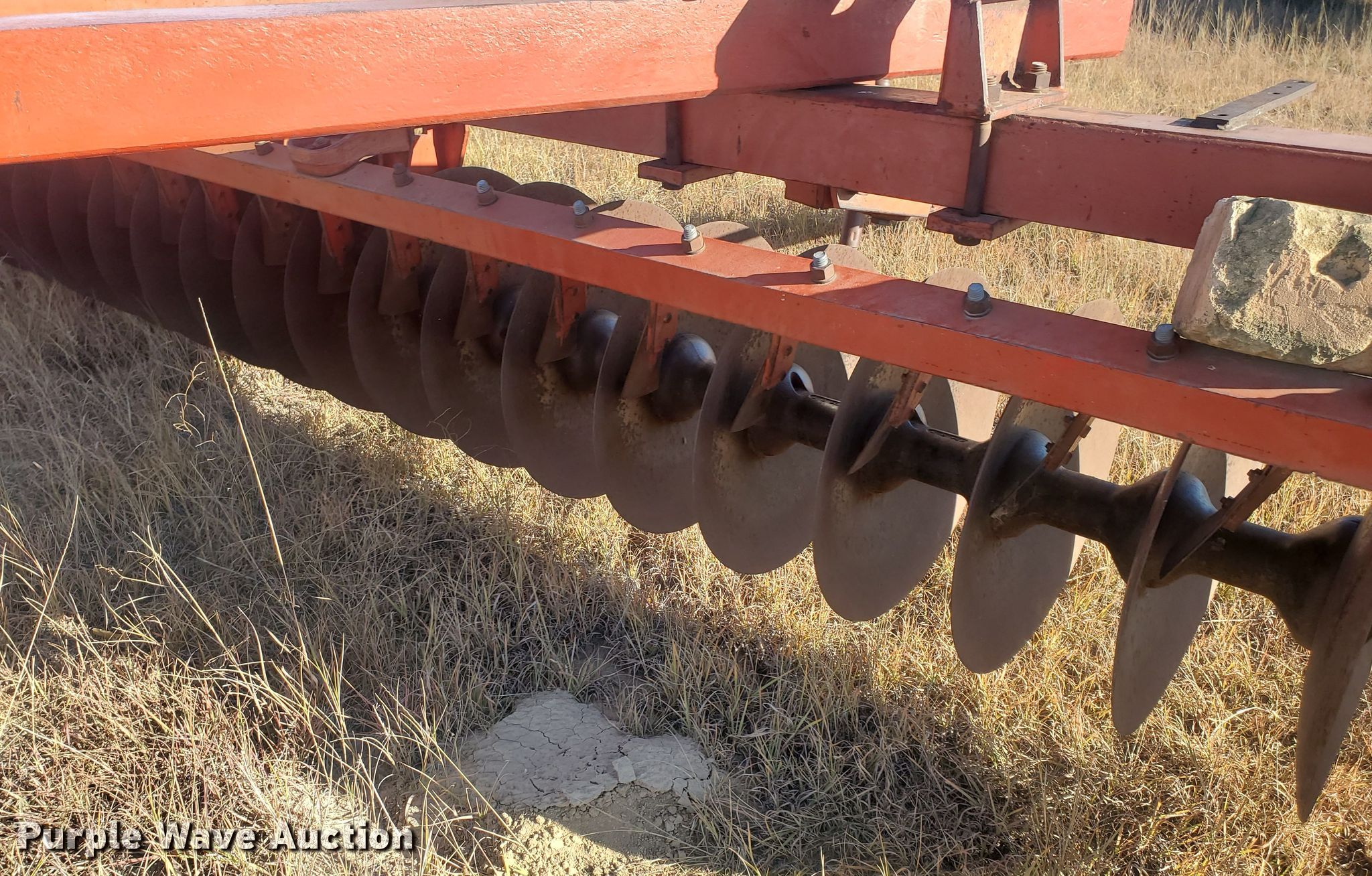 Krause 1054 off-set disk. Overall width: 14', Serial: 2467. Operational Front blades Diameter: 19", Spacing: 7", Rear blades Diameter: 19", Spacing: 9", Disk scrapers, Operation Hydraulic lift. Tires Tire size: 235/75R15. Notes Tires may need replaced. Ostmeyer Farms. Grainfield, KS 67737