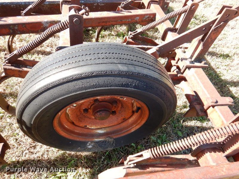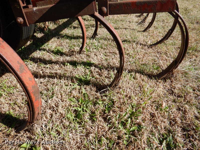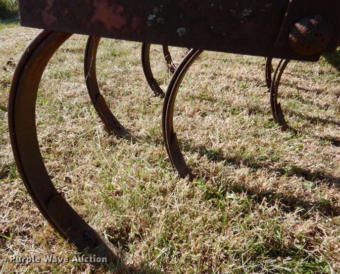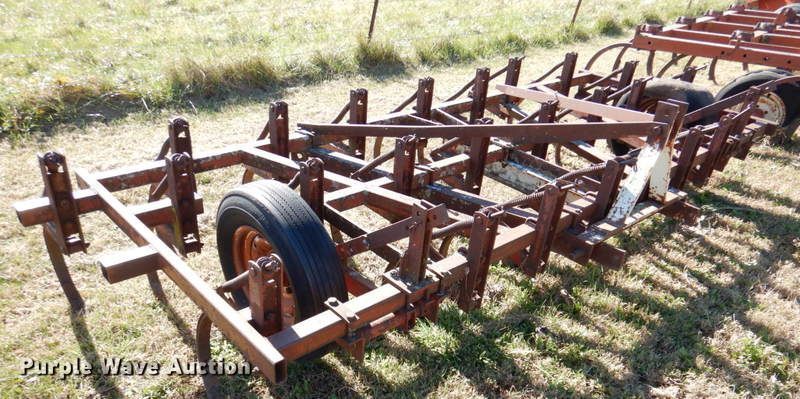 Brady chisel. Overall width: 12' 6". Operational Shanks: 25, Sweep width: 2", Attachments Hitch: Three point. Tires Gauge wheels Size: Unknown. Notes Tires damaged. Roscoe Warren Daniels Trust. 25479 Dempsey Rd. McLouth, KS 66054