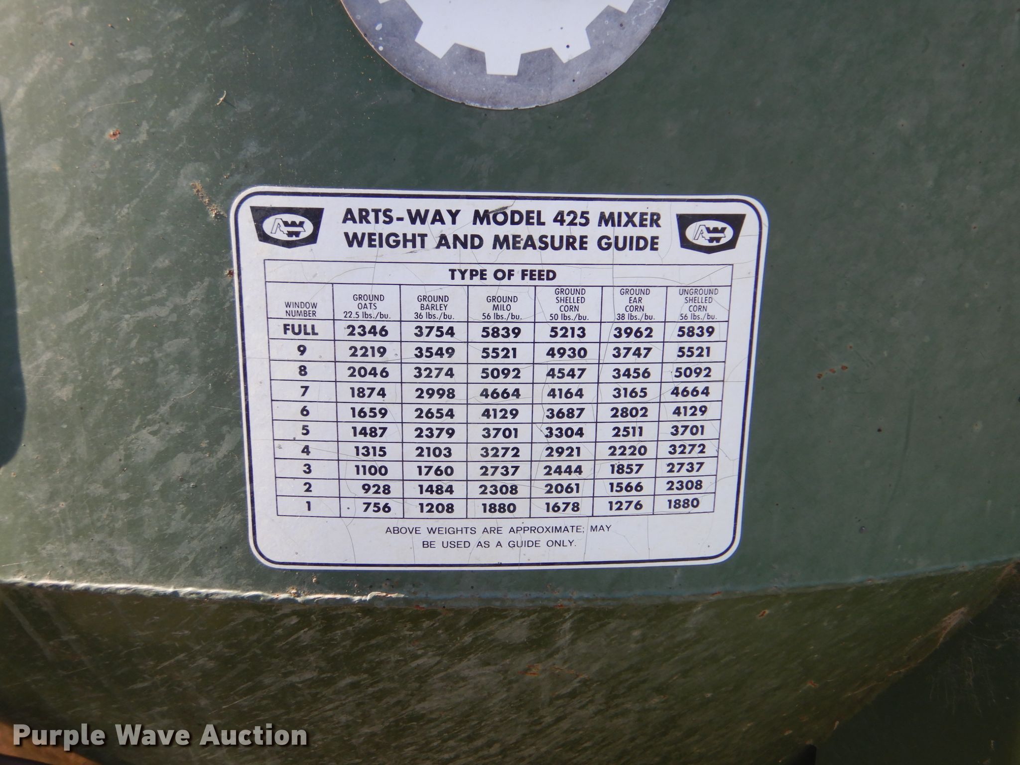 Purple Wave is selling a used Feed Mixer or Bale Processor in Kansas. This item is a Arts-Way 425 feed grinder/mixer with the following: PTO: 540, Scales, Arts-Way, Auger, Quantity: 1, Diameter: 7", Hammer Mill