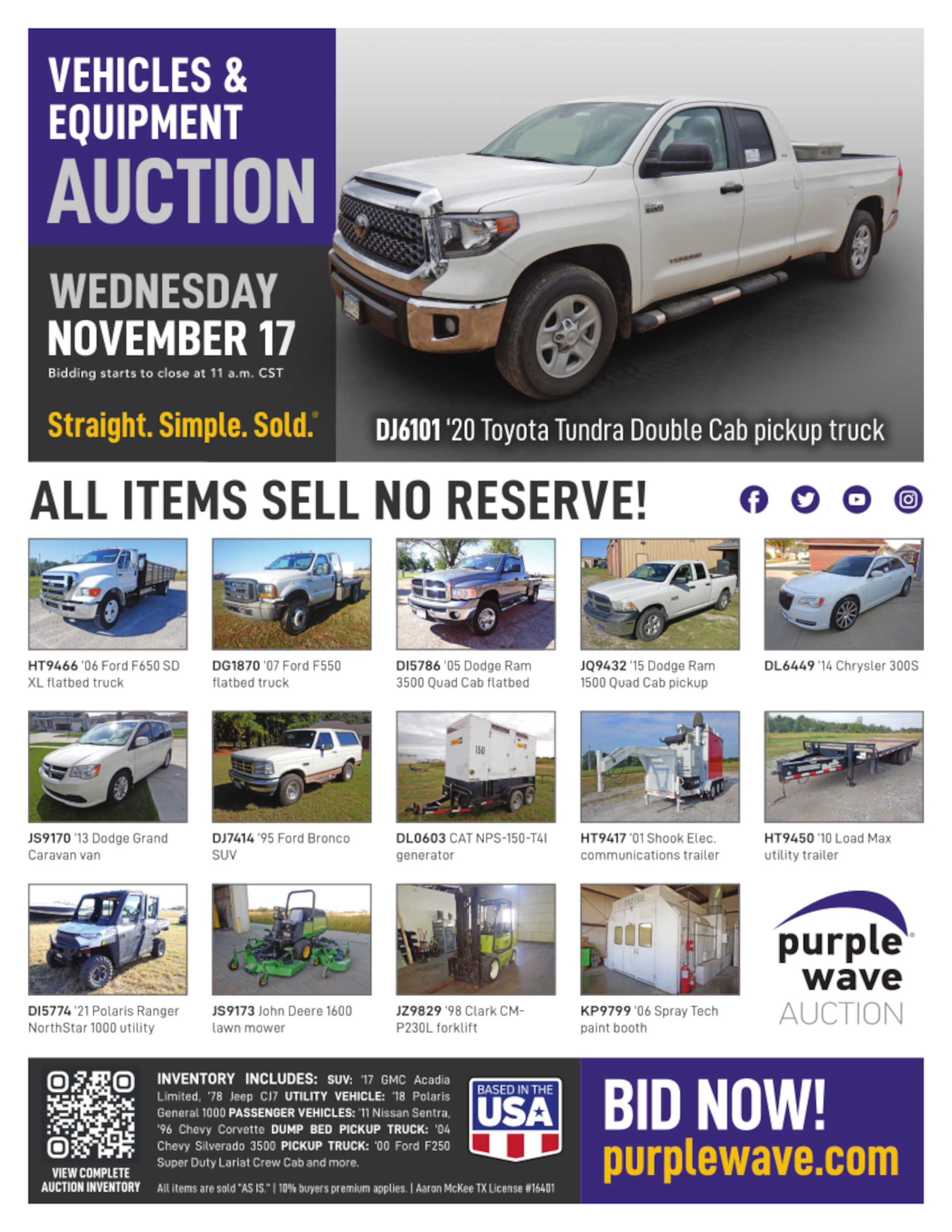 This auction is conducted by Purple Wave, Inc., whose home office is 825 Levee Drive, Manhattan, Kansas. Aaron McKee, Texas auctioneer license # 16401, operates Purple Wave, Inc. Complaints against us may be directed to the Texas Department of Licensing and Regulation, P.O. Box 12157, Austin, Texas 78711, (512) 463-6599. For additional required information, see the attached document.