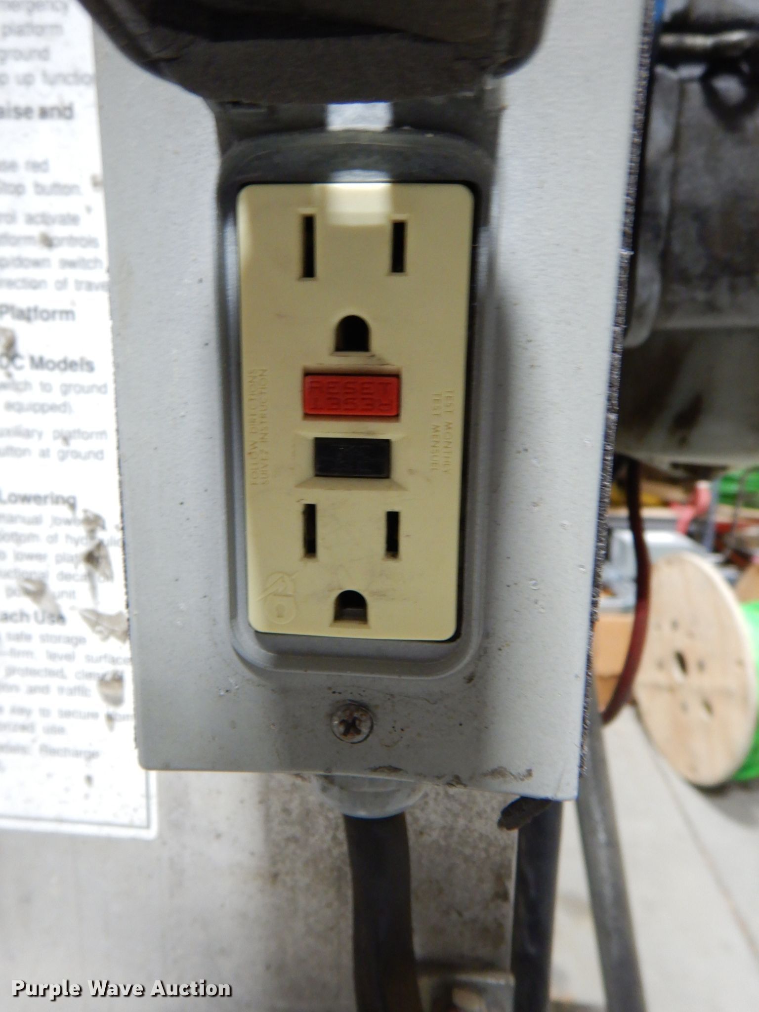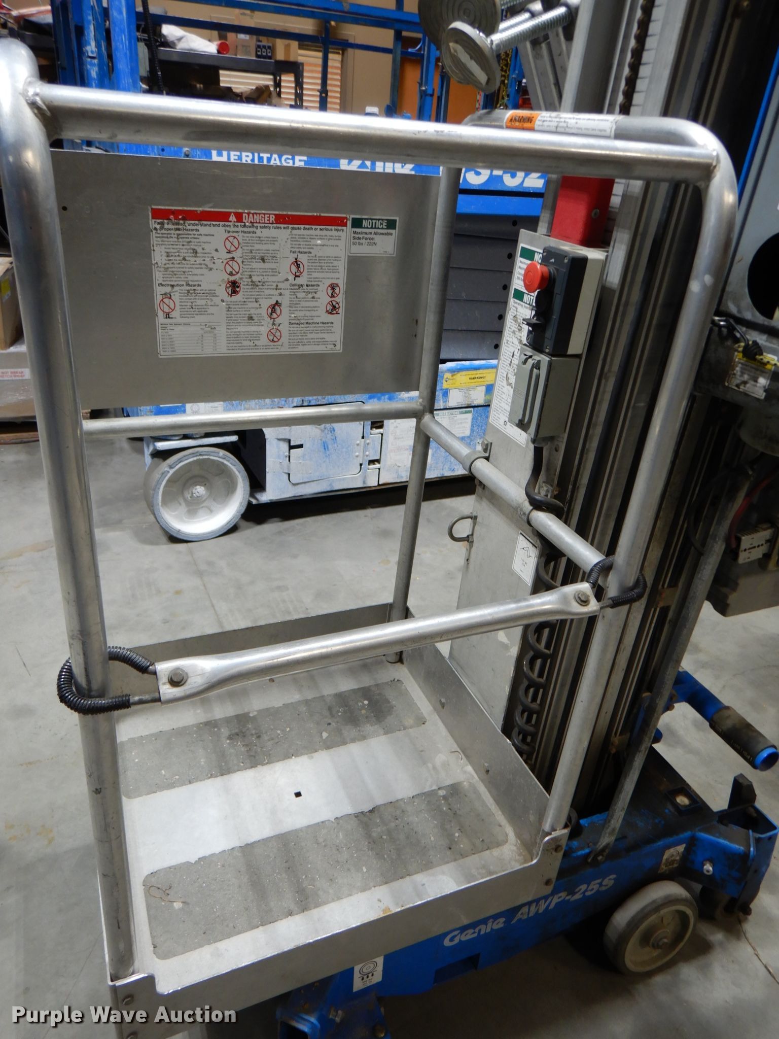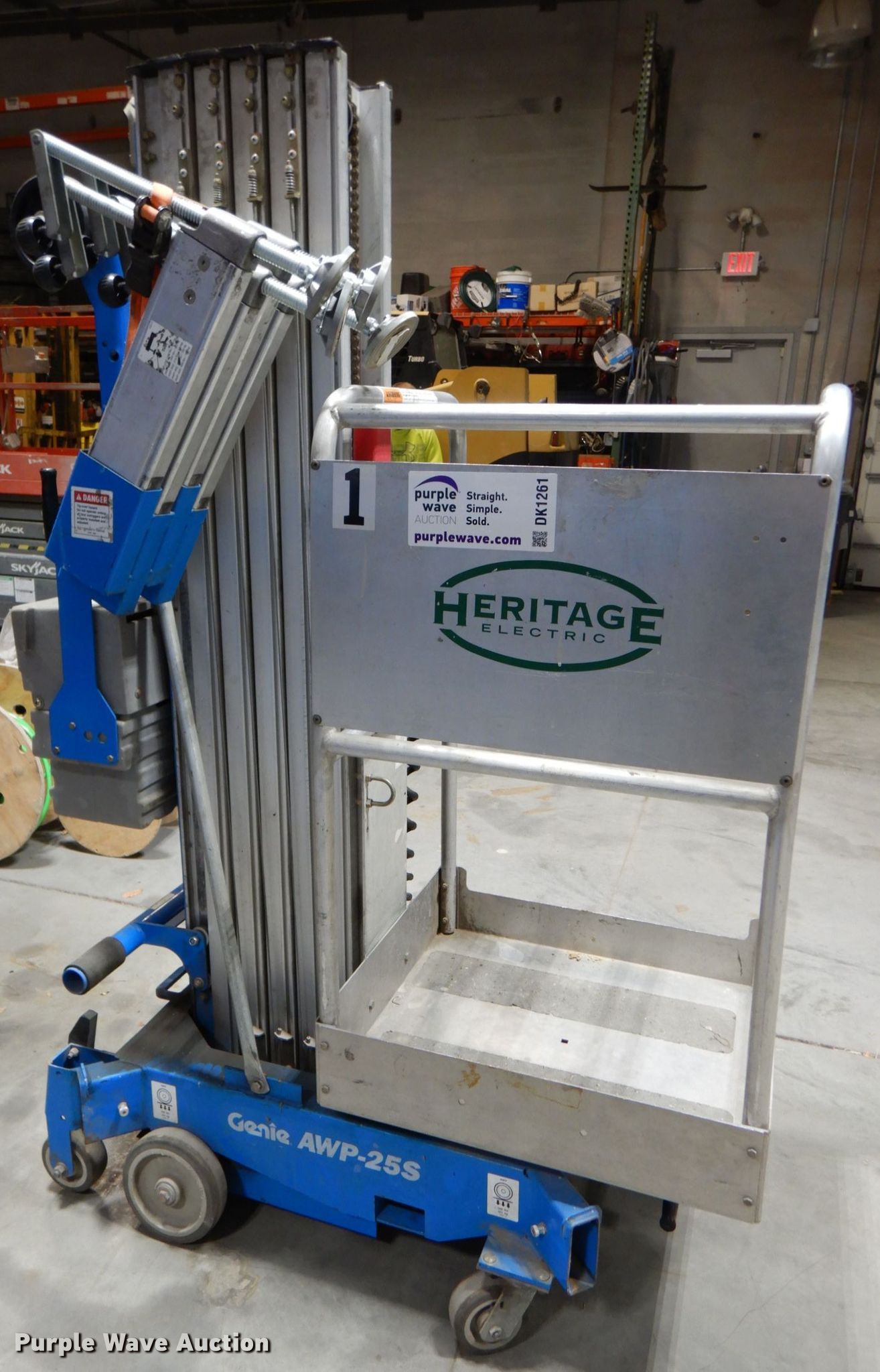 2007 Genie AWP-255 vertical lift. Serial: AWP07-56081. Operational Maximum lift capacity: 350 lbs, Maximum lift height: 24.8', Platform: 27" L x 26" W, AC power outlet, Controls: Platform. Tires Non marking. Heritage Electric. 841 N Mart-way Dr. Olathe, KS 66061