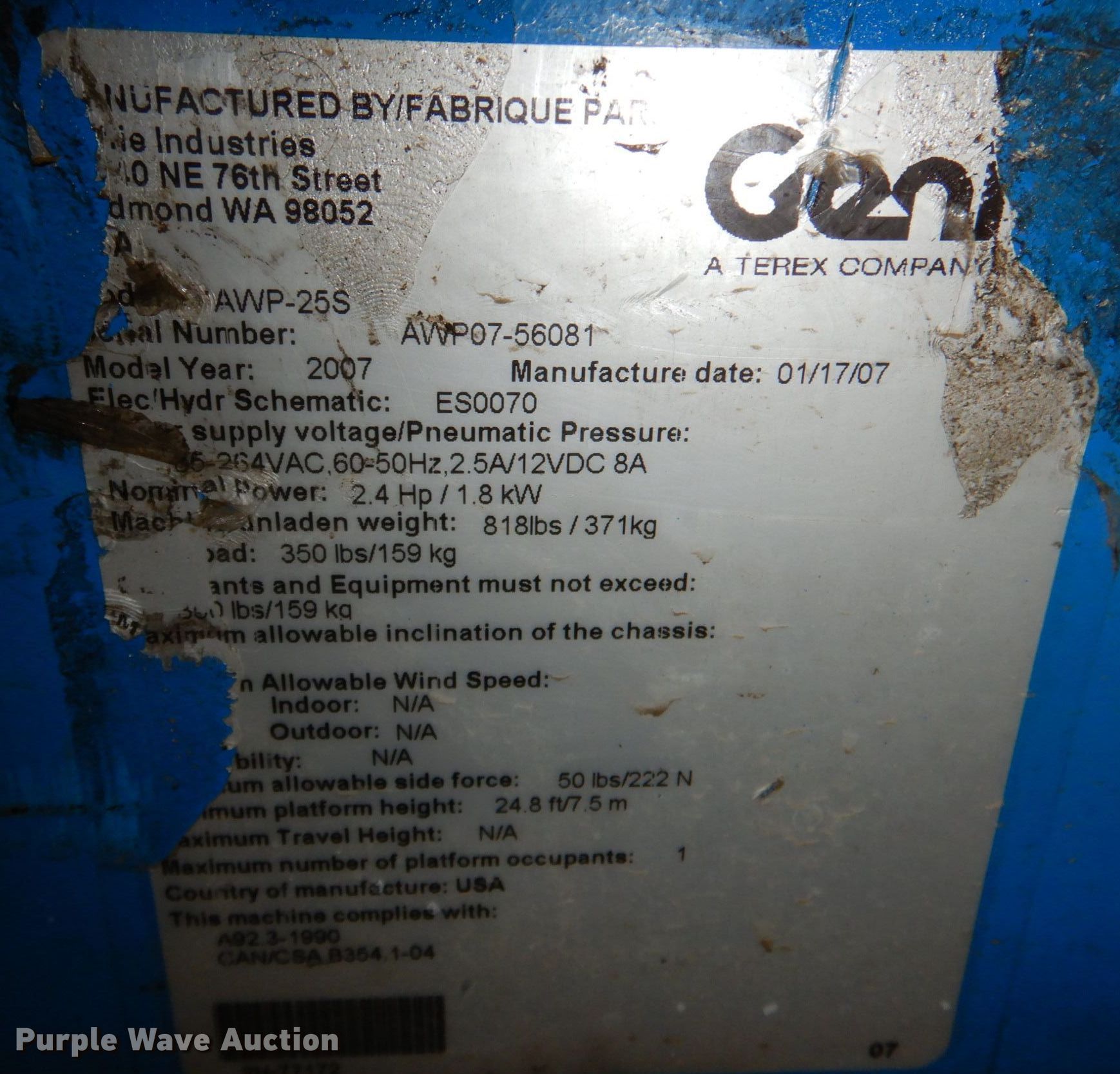 Purple Wave is selling a used Scissor or Vertical Lift in Kansas. This item is a 2007 Genie AWP-255 vertical lift with the following: Serial: AWP07-56081
