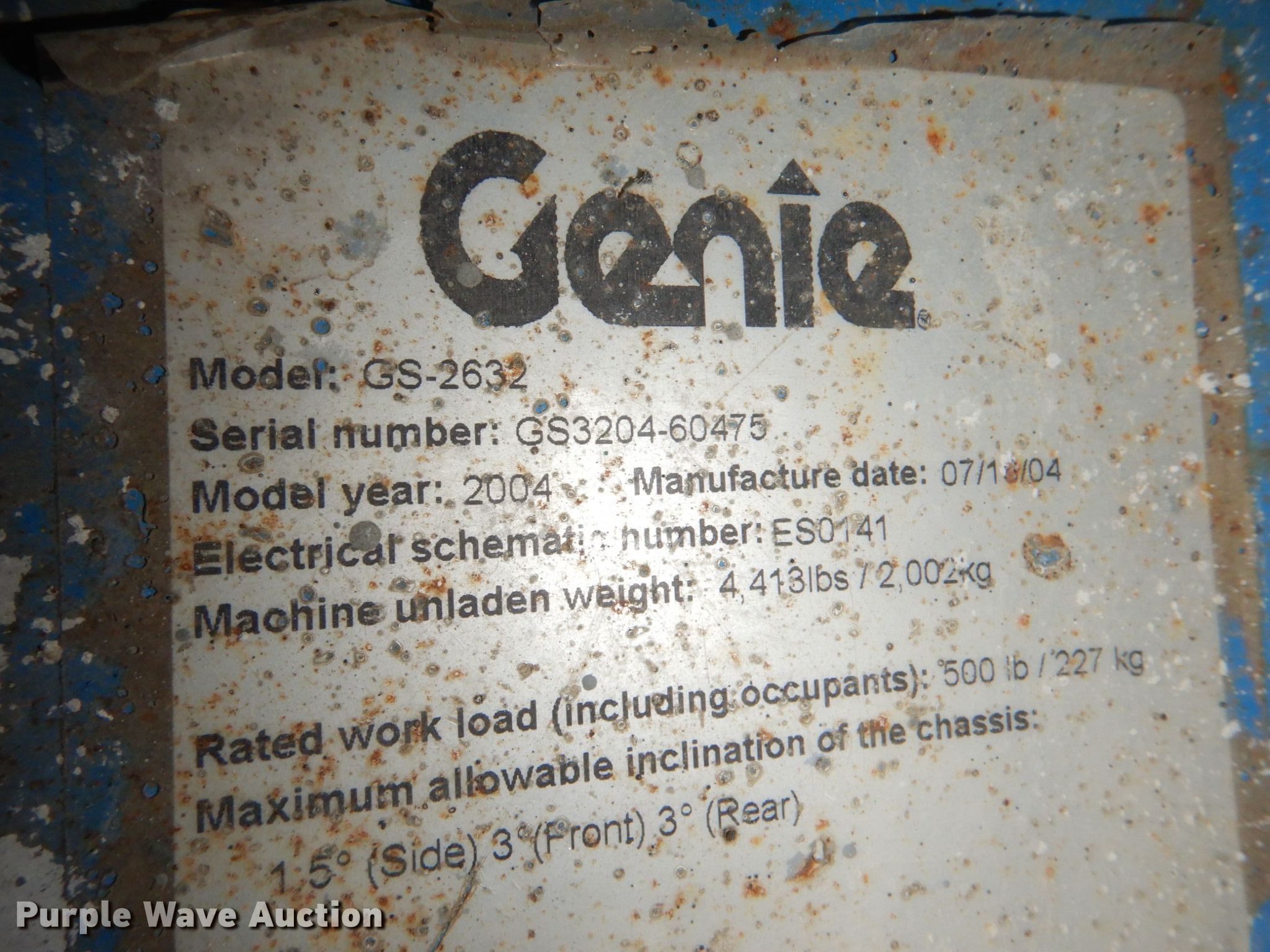 Purple Wave is selling a used Scissor or Vertical Lift in Kansas. This item is a Genie GS2632 scissor lift with the following: Hours: 738 on meter, Serial: GS3204-60475