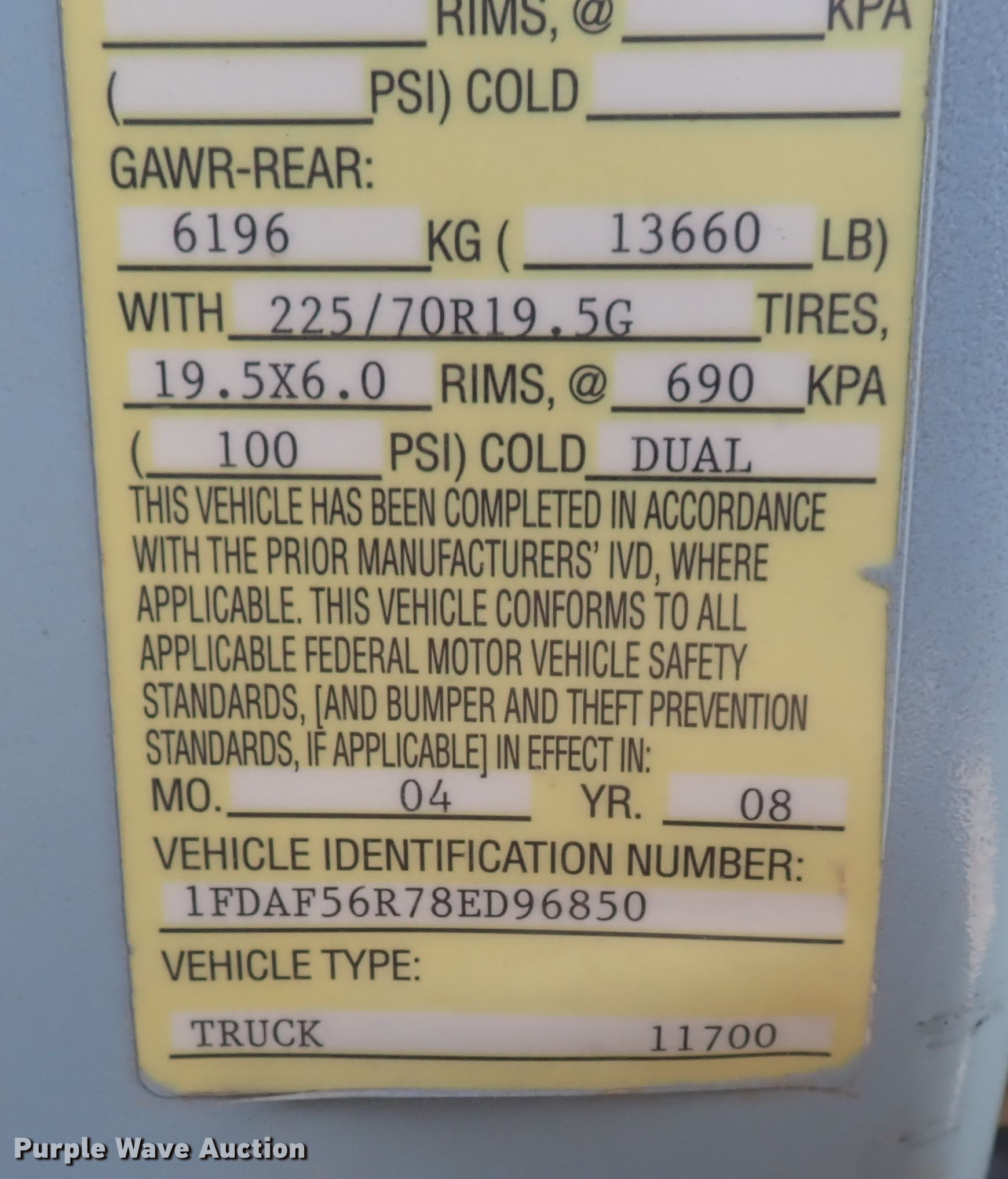 2008 Ford F550 Super Duty XL box truck. Miles: 121,104 on odometer, VIN: 1FDAF56R78ED96850. Engine Displacement: 6.4L V8 OHV 32V, Cylinders: 8, Fuel type: Diesel. Transmission Automatic. Chassis Axles: Single, Suspension: Spring, Brakes: Hydraulic. Interior AC, Heat. Operational Box bed Brown, 16' L x 102" W, Floor: Wood, End gate lift. Tires Size: 225/70R19.5. Kansas title. 3760 1/2 S Broadway Ave. Wichita, KS 67216