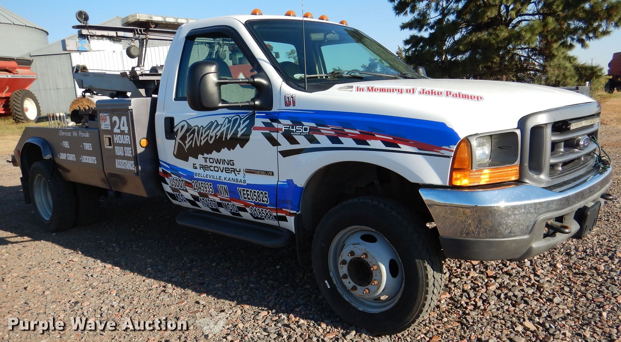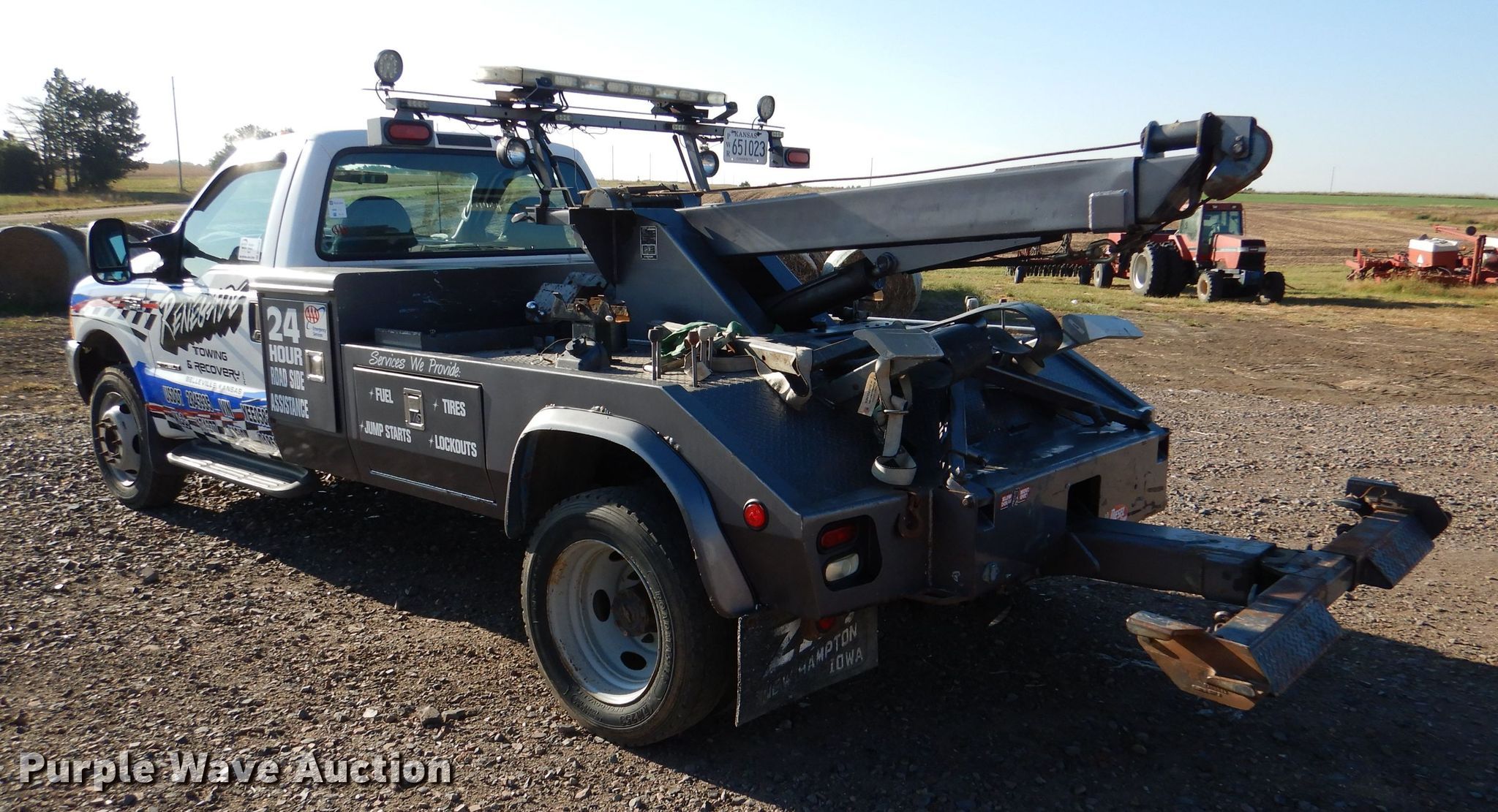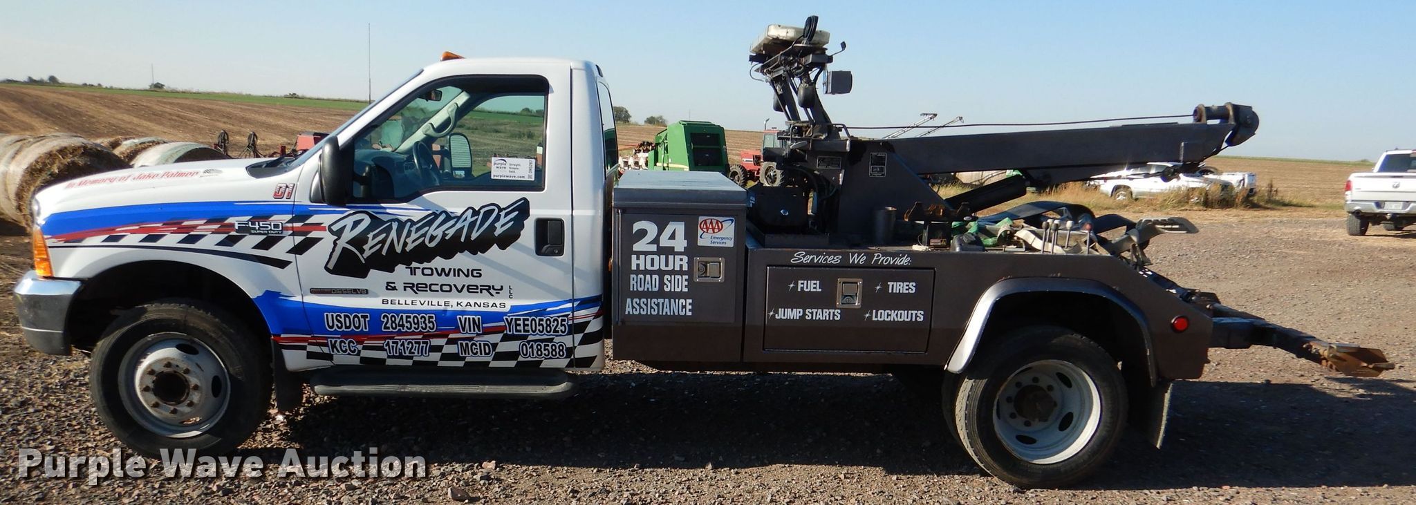 Purple Wave is selling a used Rollback or Tow Truck in Kansas. This item is a 2000 Ford F450 Super Duty XL tow truck with the following: Miles: 197,198 on odometer, VIN: 1FDXF46F8YEE05825, Unit #: 01
