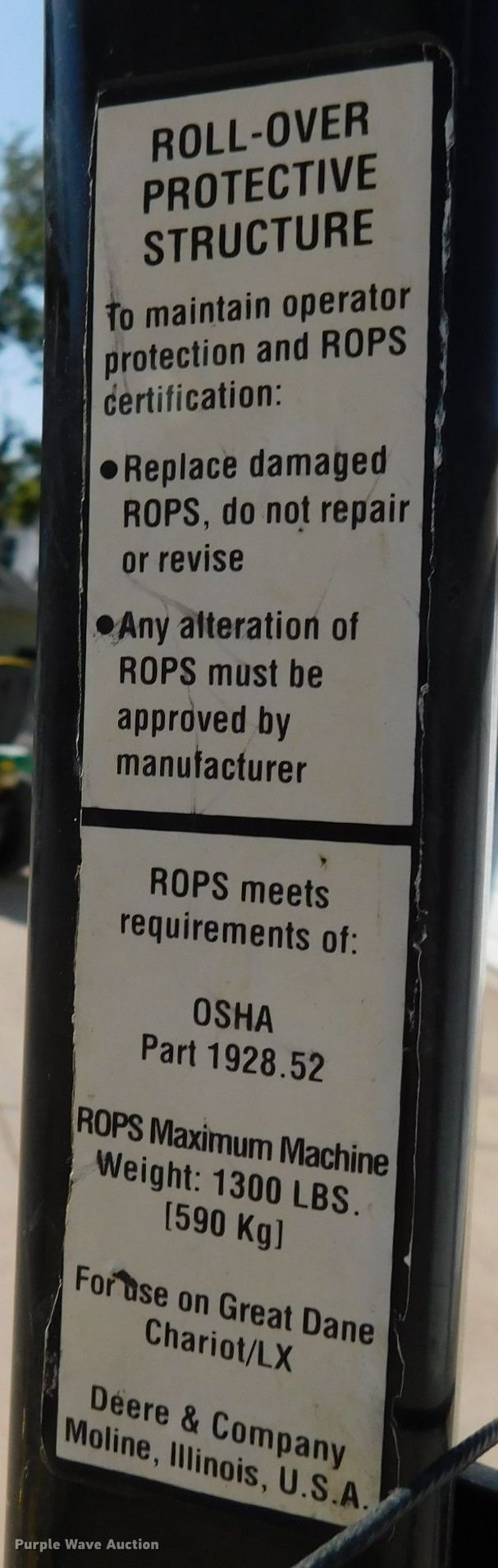 Great Dane ZTR lawn mower. Hours: 1,492 on meter, Cutting width: 48". Engine Kawasaki, Cylinders: 2, Fuel type: Gas, HP: 19. Transmission Hydrostatic. Operators station OROPS. Tires Rear: 23x9.50-12. 176 E 1st St. Malcolm, NE 68402