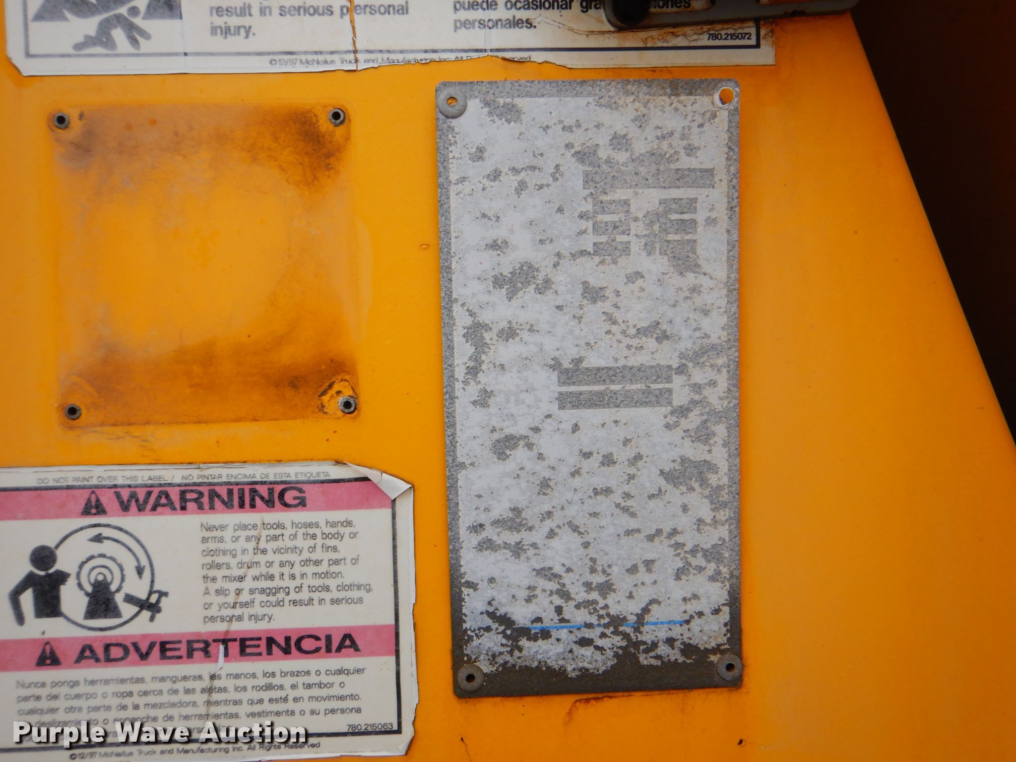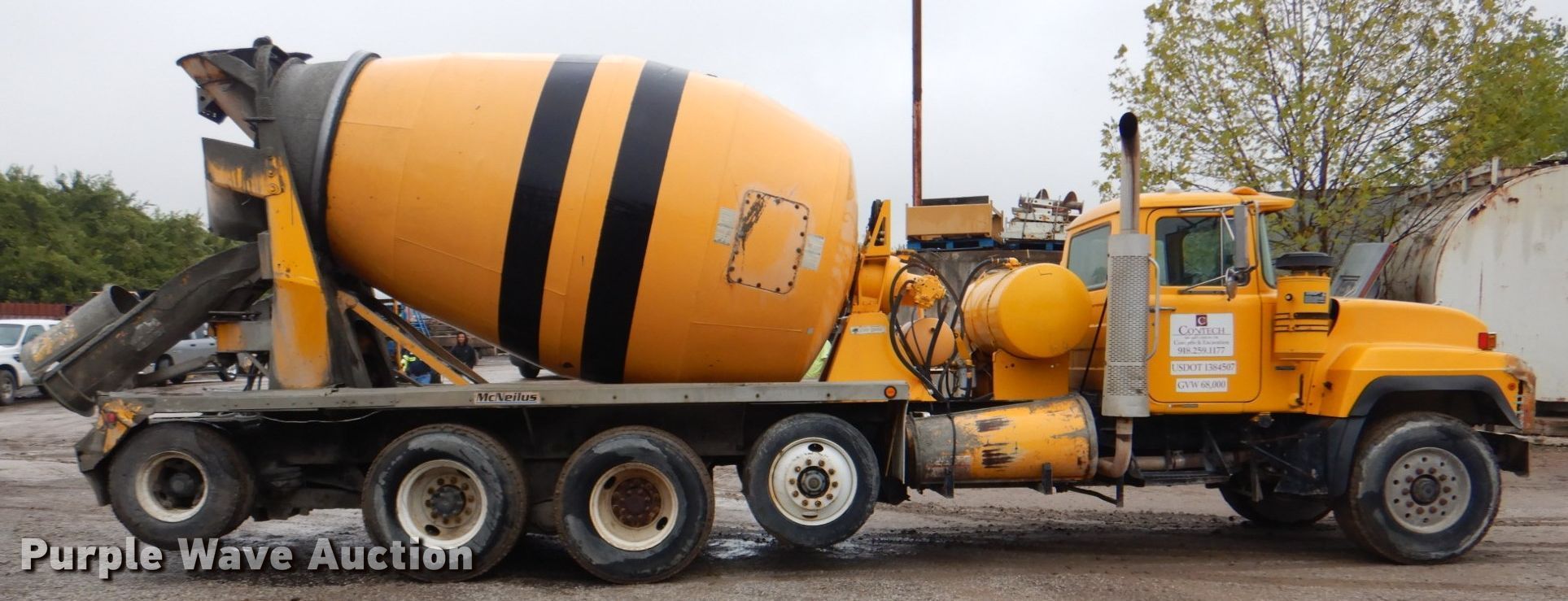 2000 Mack R690S ready mix truck. Miles: 203,951 on odometer, Hours: 27,878 on meter, VIN: 1M2P264C9YM030954, Unit #: 47. Engine Mack, Displacement: 12.0L, Cylinders: 6, Fuel type: Diesel. Transmission Mack Maxitorque, Manual, Speed: 8. Chassis Axles: 4, Pusher axle, Tag axle, Suspension: Air, Brakes: Air. Interior AC, Heat, Heated mirrors, Cruise control. Operational Mixer McNelius, Capacity: 10.5 cu.yd., Discharge: Rear, In-cab controls, Rear drum controls, Chute Extensions: 2, Chute type: Aluminum.. Tires Front: 385/65R22.5, Rear: 11R22.5, Lift axles: 255/70R22.5. Notes Dash warning indicator: ABS, Windshield chipped or cracked. Oklahoma title. Contech Inc.. 114 S Elm Pl W. Broken Arrow, OK 74012