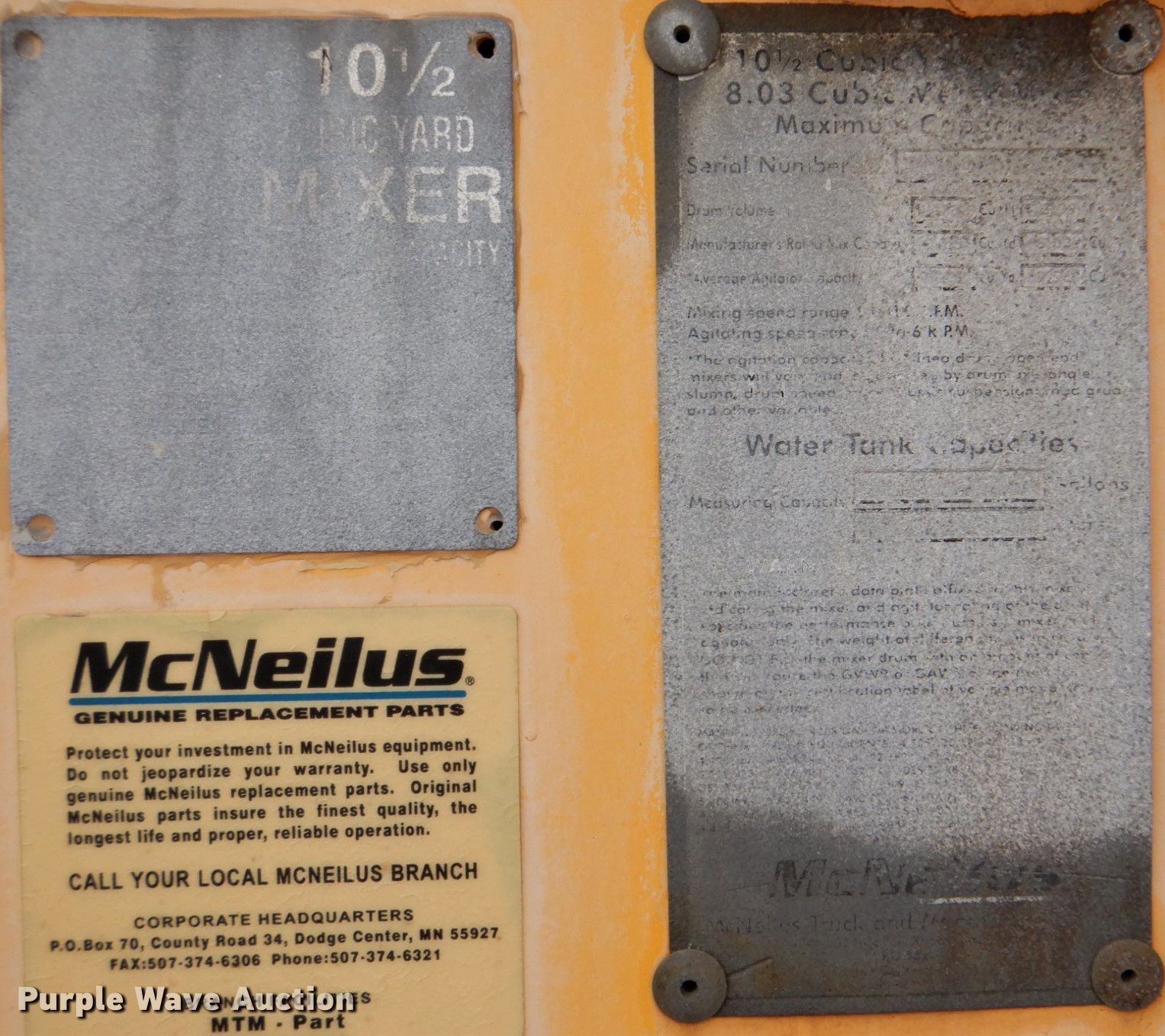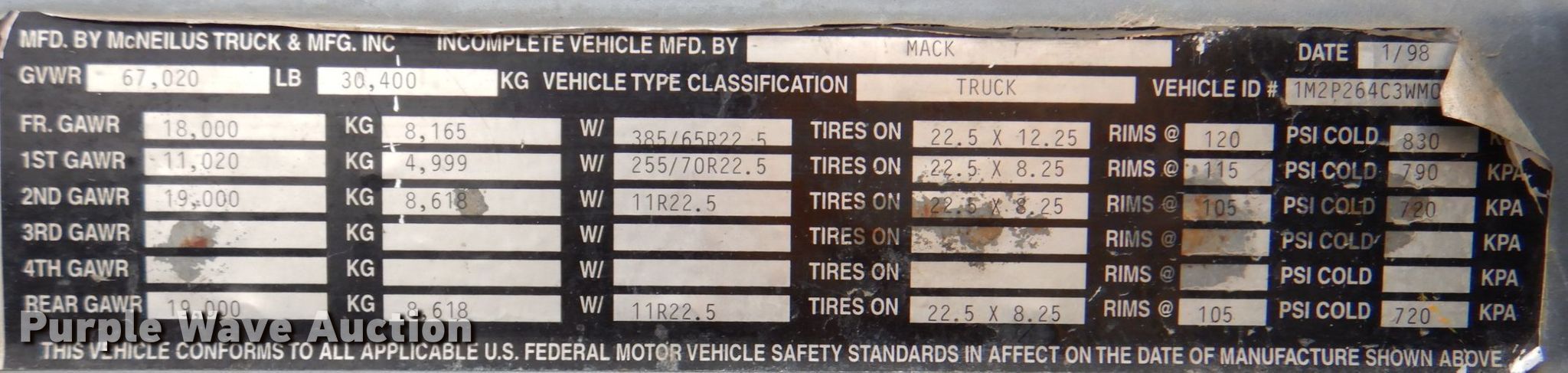 1998 Mack RD960S ready mix truck. Miles: 180,946 on odometer, Hours: 29,378 on meter, VIN: 1M2P264C3WM026993, Unit #: 38. Engine Mack, Displacement: 12.0L, Cylinders: 6, Fuel type: Diesel. Transmission Manual, Speed: 8. Chassis Axles: 4, Pusher axle, Tag axle, Suspension: Air, Brakes: Air, GVWR: 67,020 lbs FAWR: 18,000 lbs, IAWR: 11,020 lbs, RAWR: 19,000 lbs, Lift axle GAWR: 19,000 lbs. Interior AC, Heat, Heated mirrors. Operational Mixer McNelius, Capacity: 10.5 cu.yd., Discharge: Rear, In-cab controls, Rear drum controls, Chute Extensions: 3, Chute type: Aluminum.. Tires Front: 385/65R22.5, Rear: 11R22.5, Lift axle: 255/70R22.5. Notes Windshield chipped or cracked. Oklahoma title. Contech Inc.. 114 S Elm Pl W. Broken Arrow, OK 74012