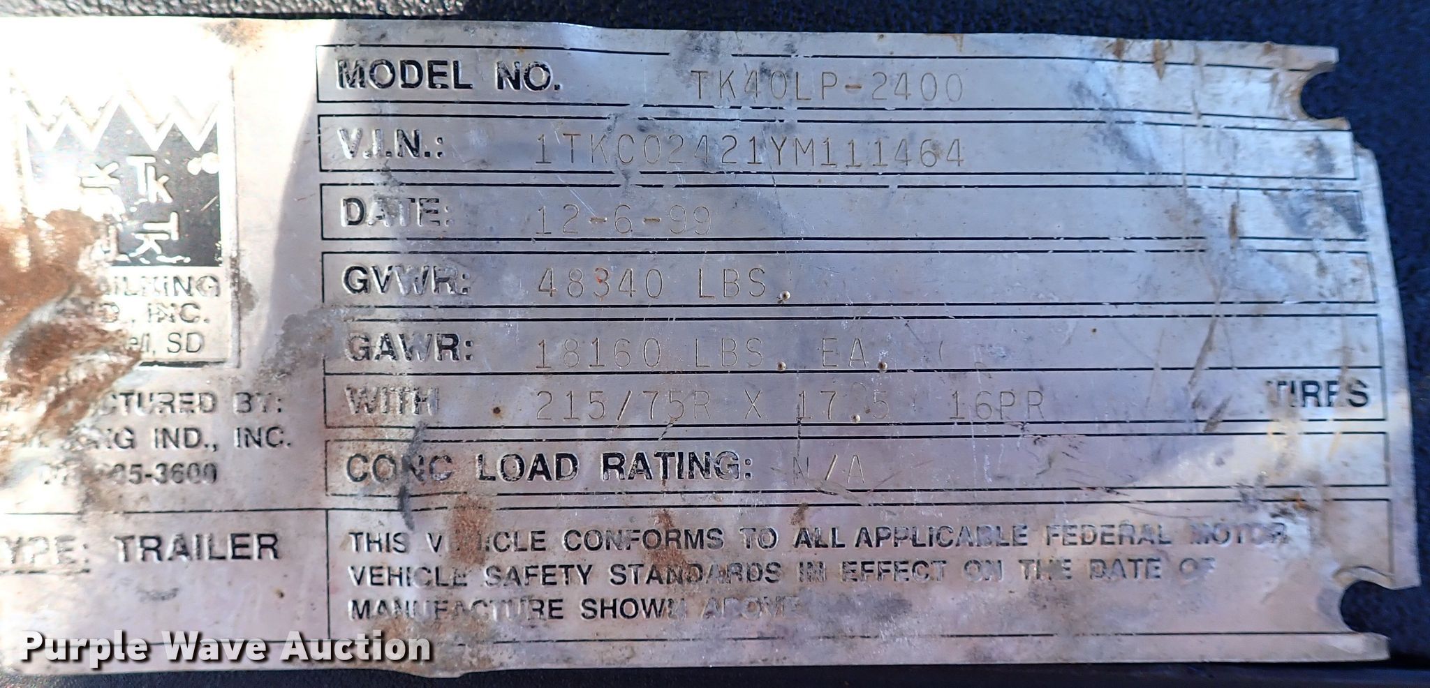 Purple Wave is selling a used Equip. Trailer in Oklahoma. This item is a 2000 Trail King TK40LP-2400 equipment trailer with the following: VIN: 1TKC02421YM111464
