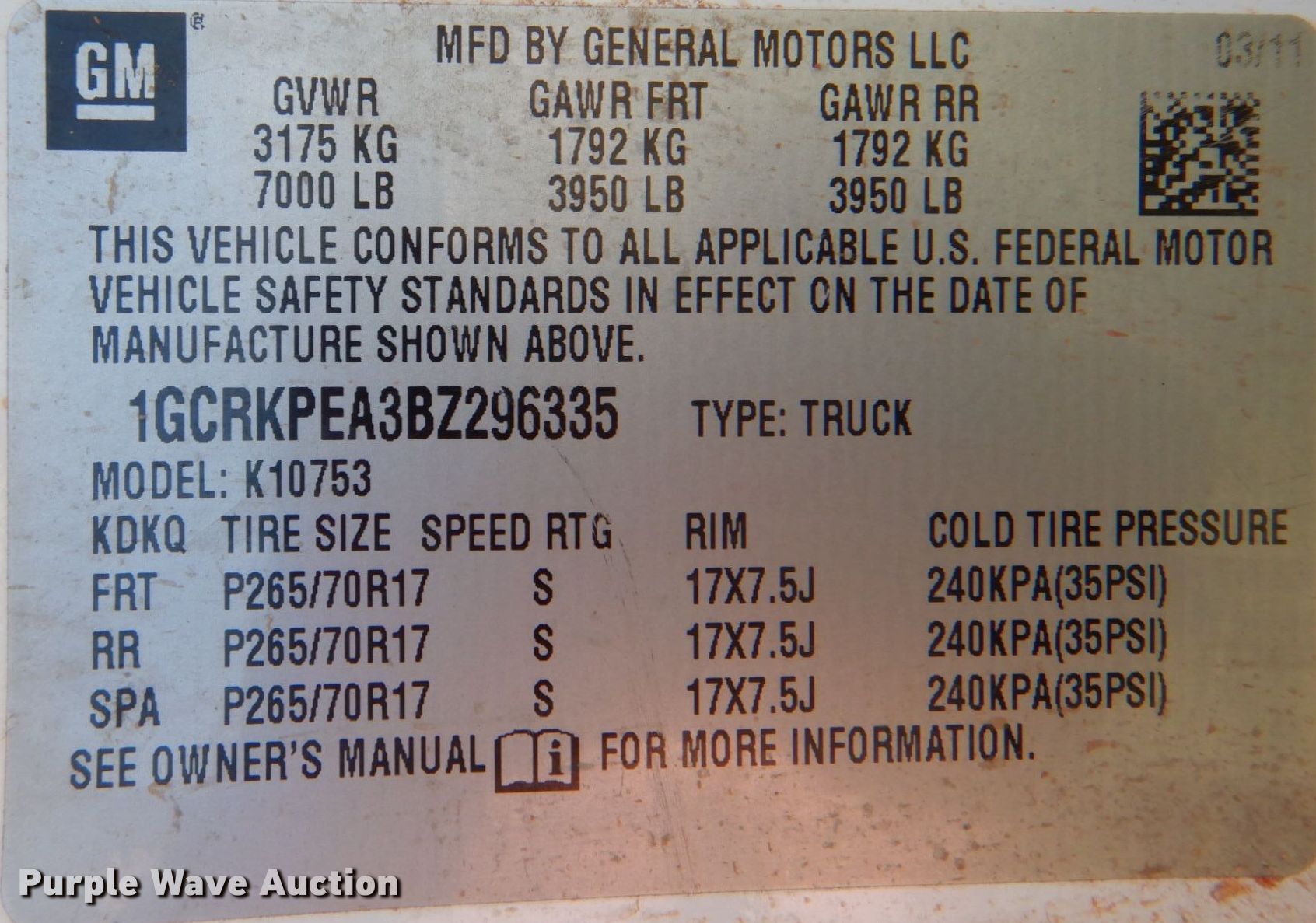 - VIN: 1GCRKPEA3BZ296335