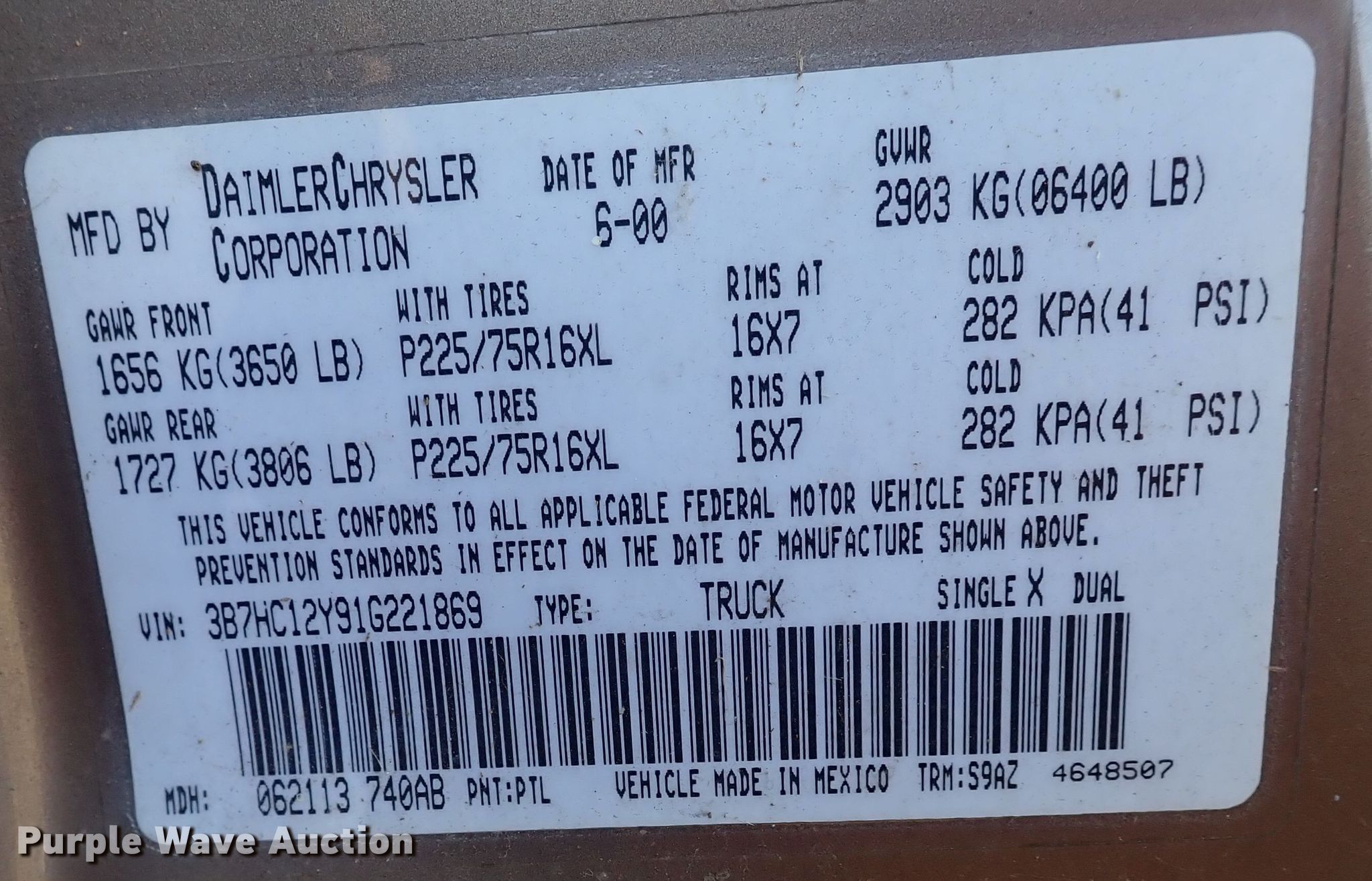 - VIN: 3B7HC12Y91G221869