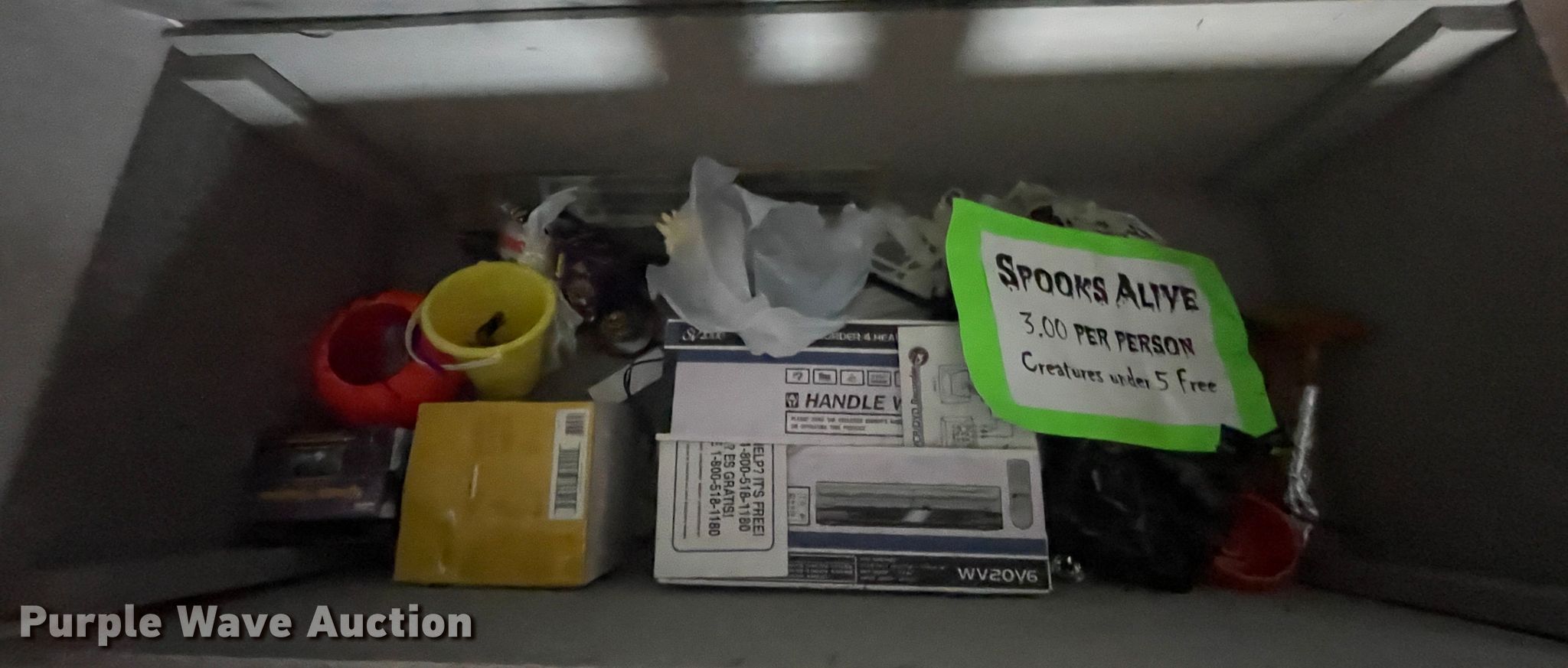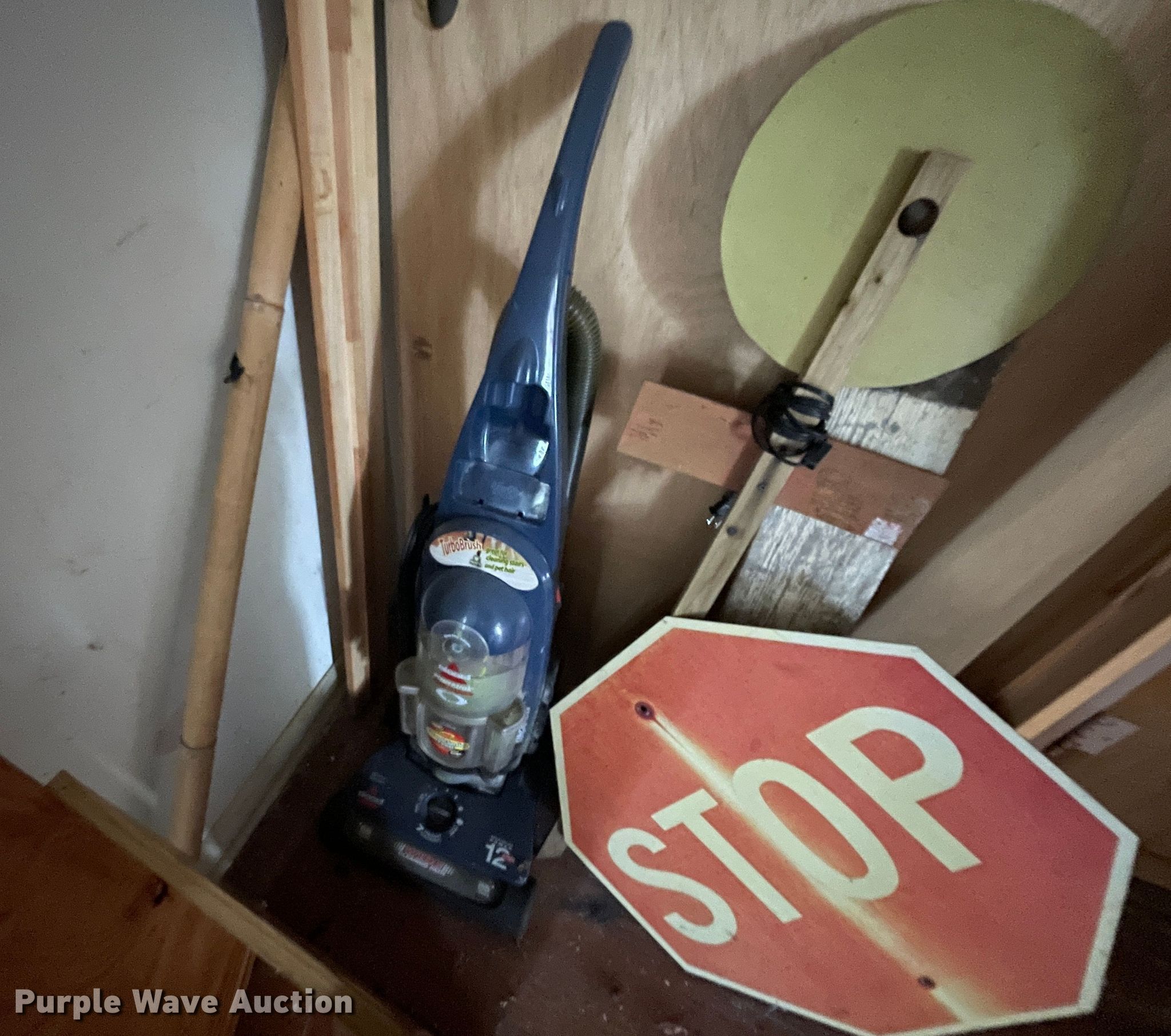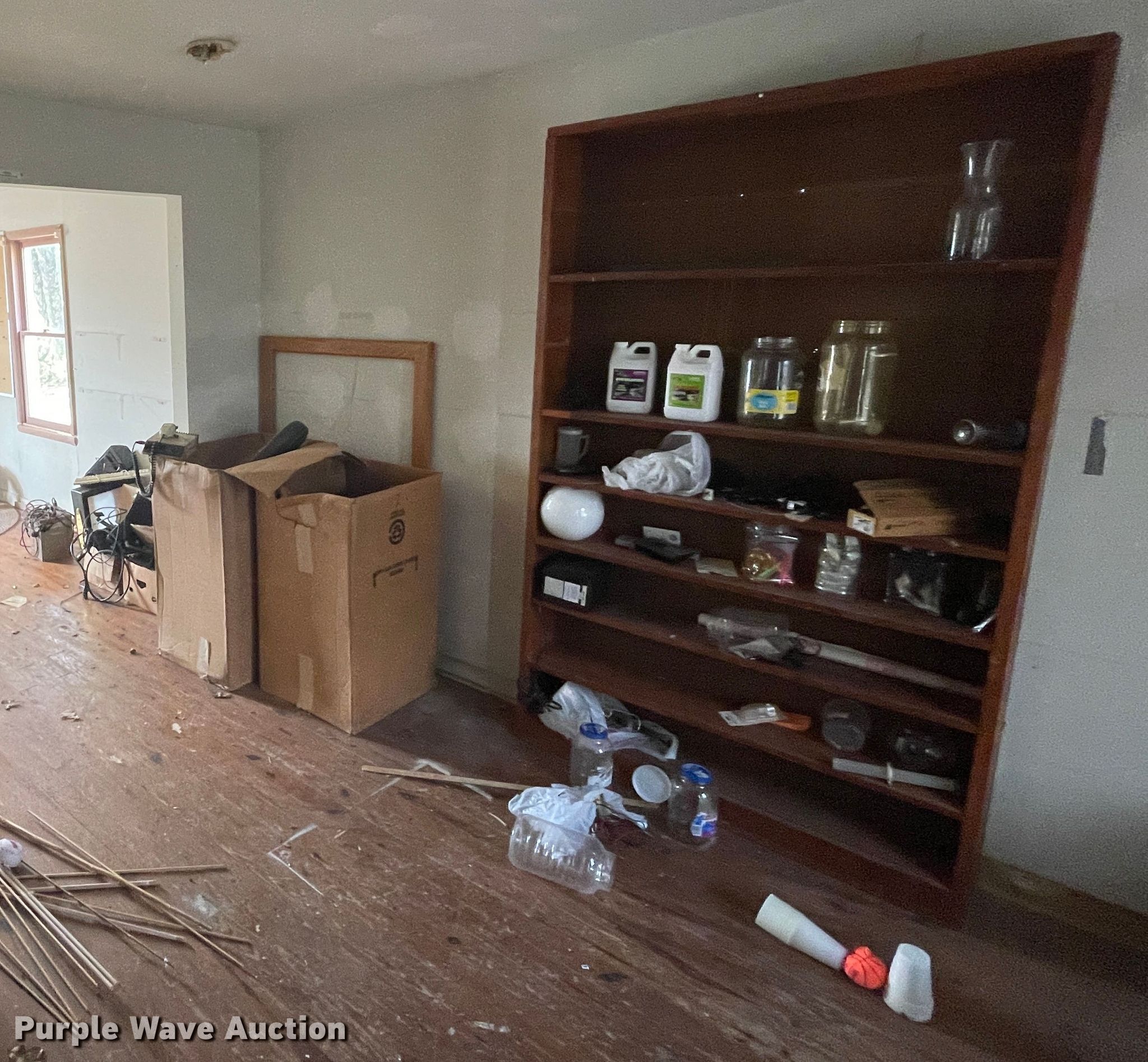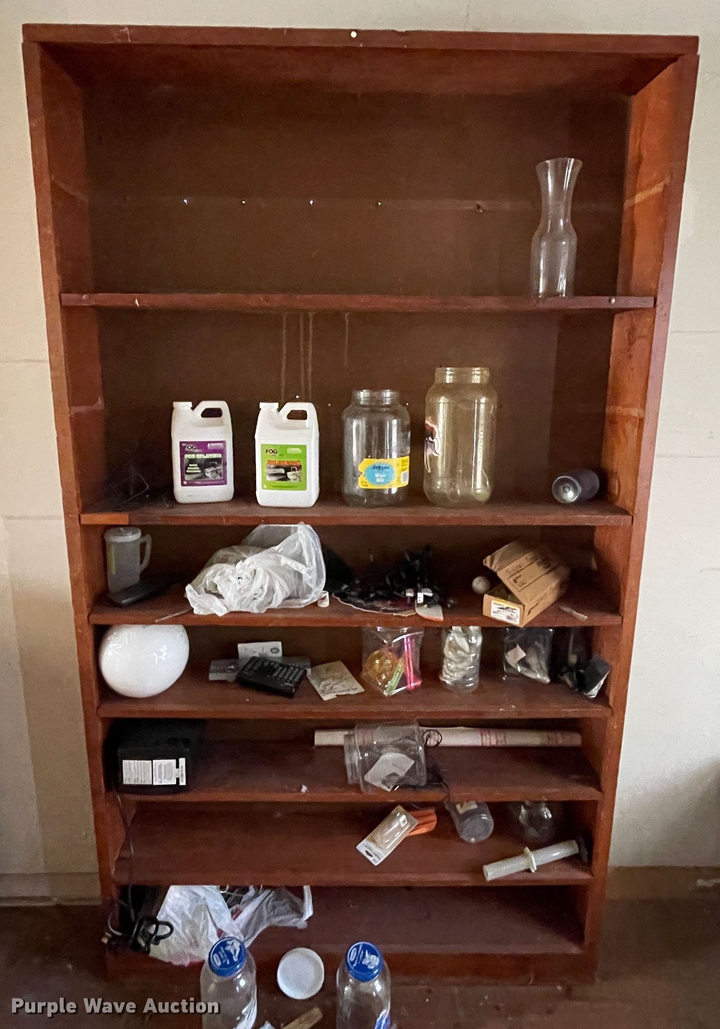 Purple Wave is selling a used Office Supplies and Equip. in Oklahoma. This item is a Office supplies with the following: 7'H wooden shelf, Radio, Halloween decorations, Bissell Powertrak Revolution vacuum, Crates, Extension cords, Volleyball net and more