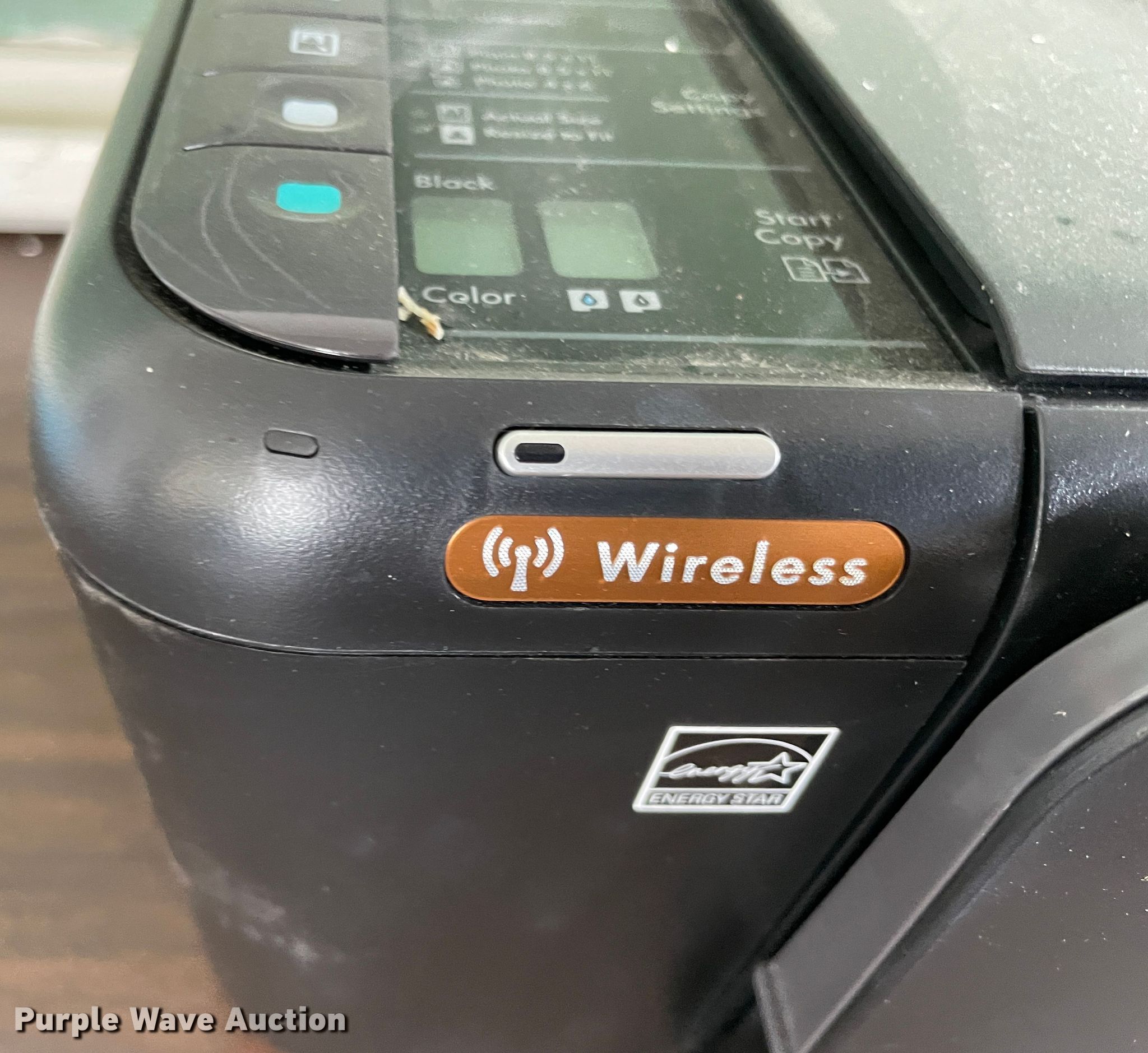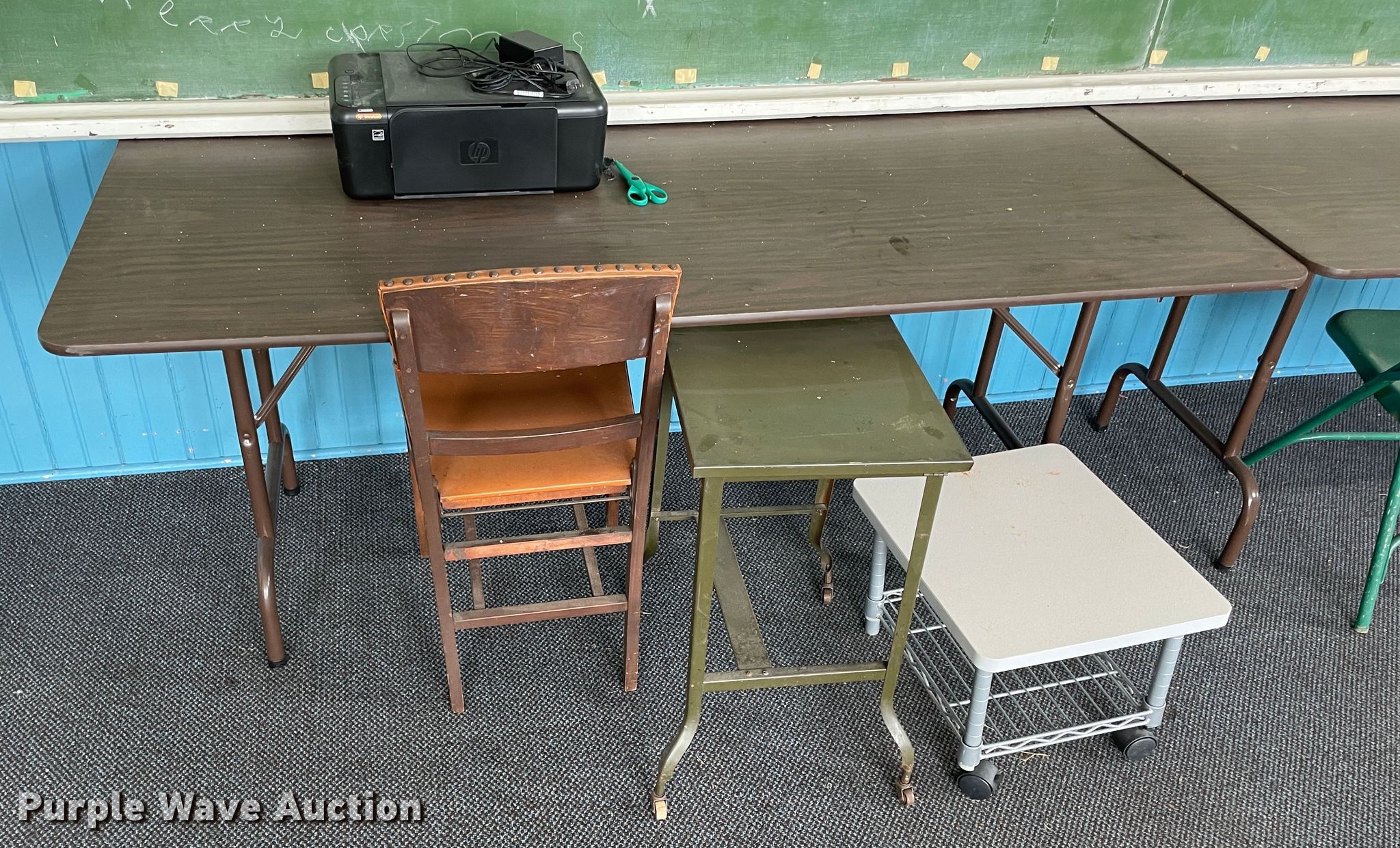 Purple Wave is selling a used Office Supplies and Equip. in Oklahoma. This item is a Office supplies with the following: HP deskjet F4580 wireless printer, (3) folding tables, Chairs, Rolling cart, Cardboard cutout, Halloween costume pieces, Wooden shelf, Crates and more