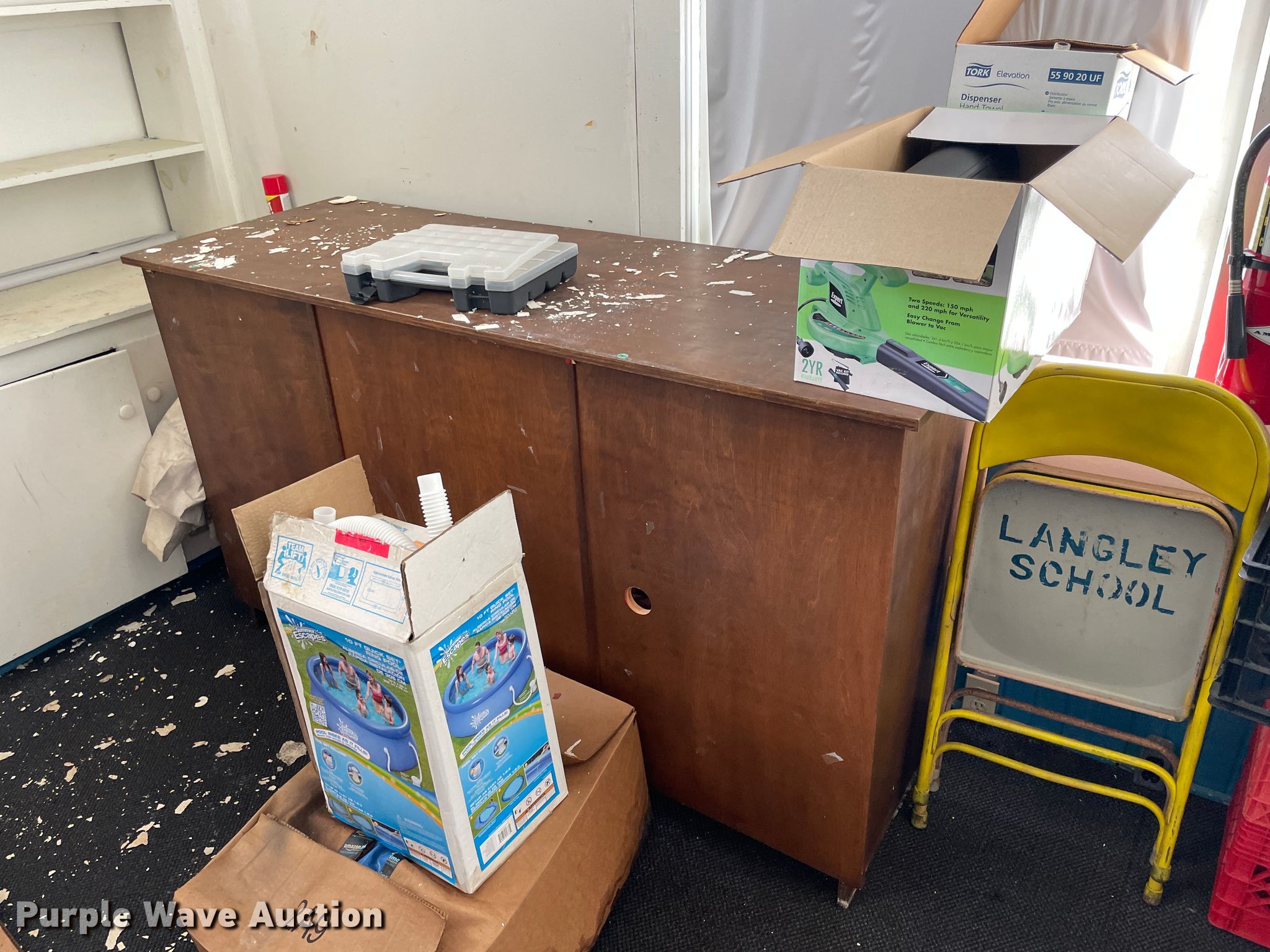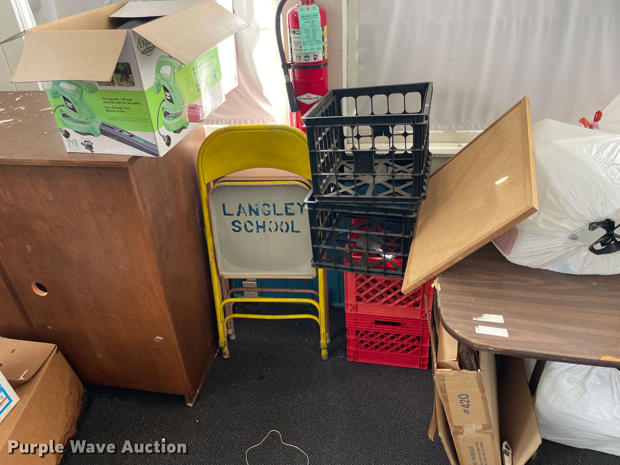 Office supplies. HP deskjet F4580 wireless printer, (3) folding tables, Chairs, Rolling cart, Cardboard cutout, Halloween costume pieces, Wooden shelf, Crates and more. City of Langley. 195 N 3rd St. Langley, OK 74301