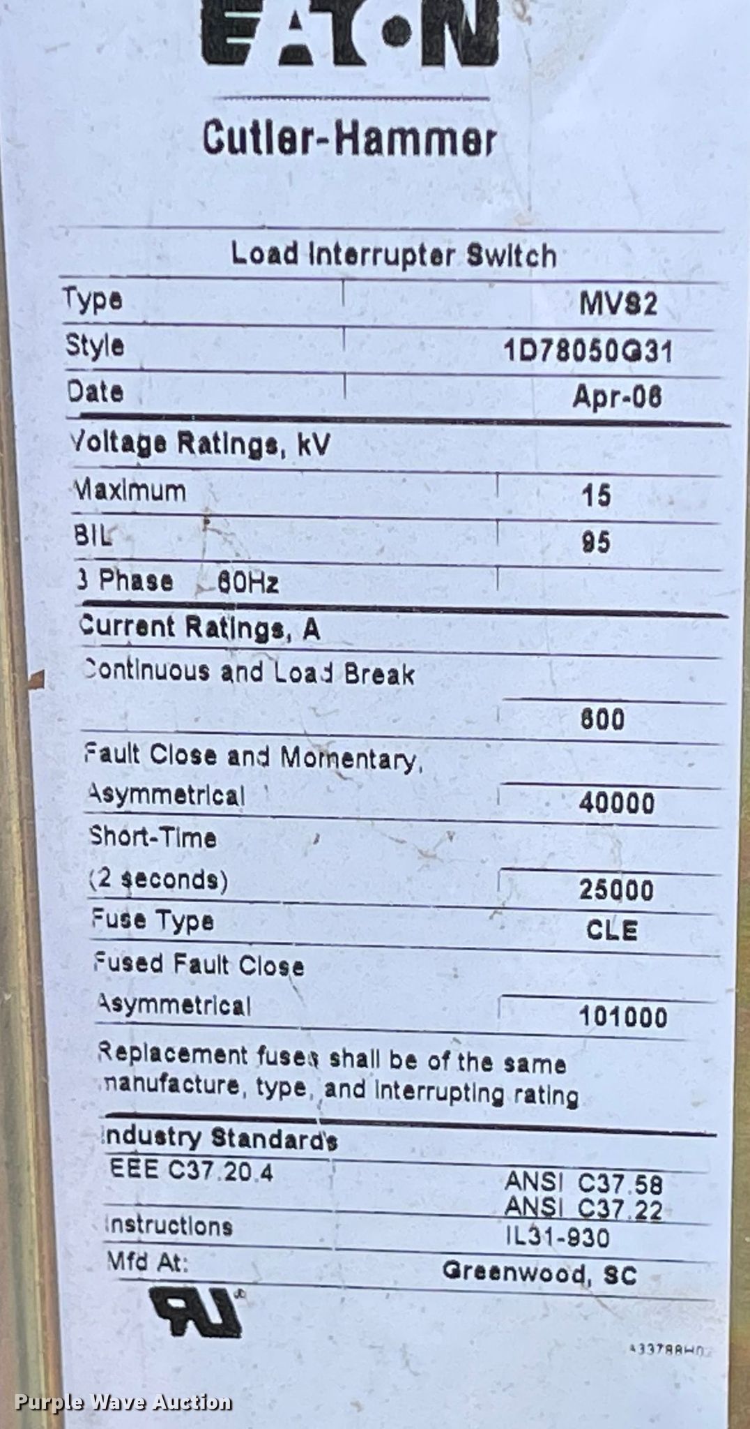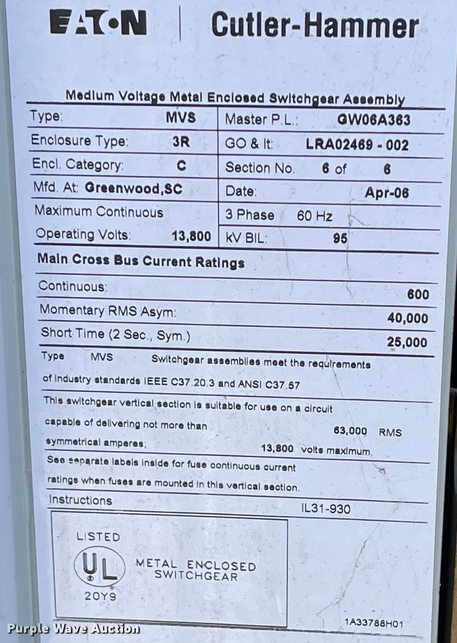 Purple Wave is selling a used Building Materials in Kansas. This item is a Eaton Cutler Hammer switchgear assembly with the following: Type: MVS, Enclosure: Type 3R, Continuous Volt rating: 13,800, Continuous Amp rating: 600
