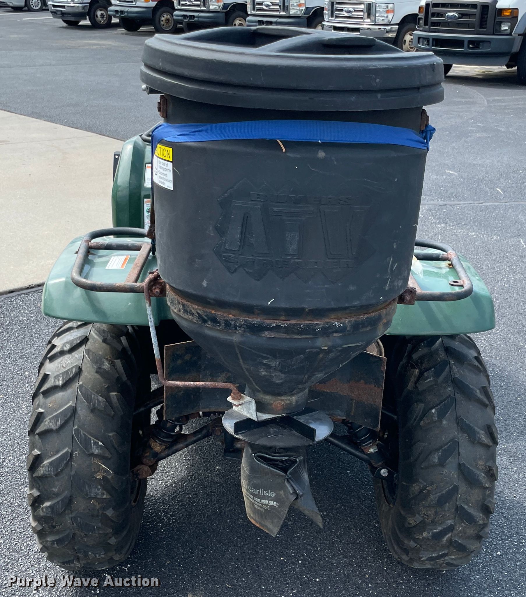 Yamaha Grizzly 350 ATV. VIN: 5Y4AH23Y6AA005412. Engine Displacement: 90 cc, Cylinders: 1, Fuel type: Gas. Transmission CVT. Operational Front attachment mount, Attachment Snow plow Width: 52, Spreader Buyers, Capacity: 5 gallons.. Tires Size: AT25x8-12. Notes Non-operational plow lift, cable broken. Kansas title. SEK-CAP. 401 N Sinnet St. Girard, KS 66743