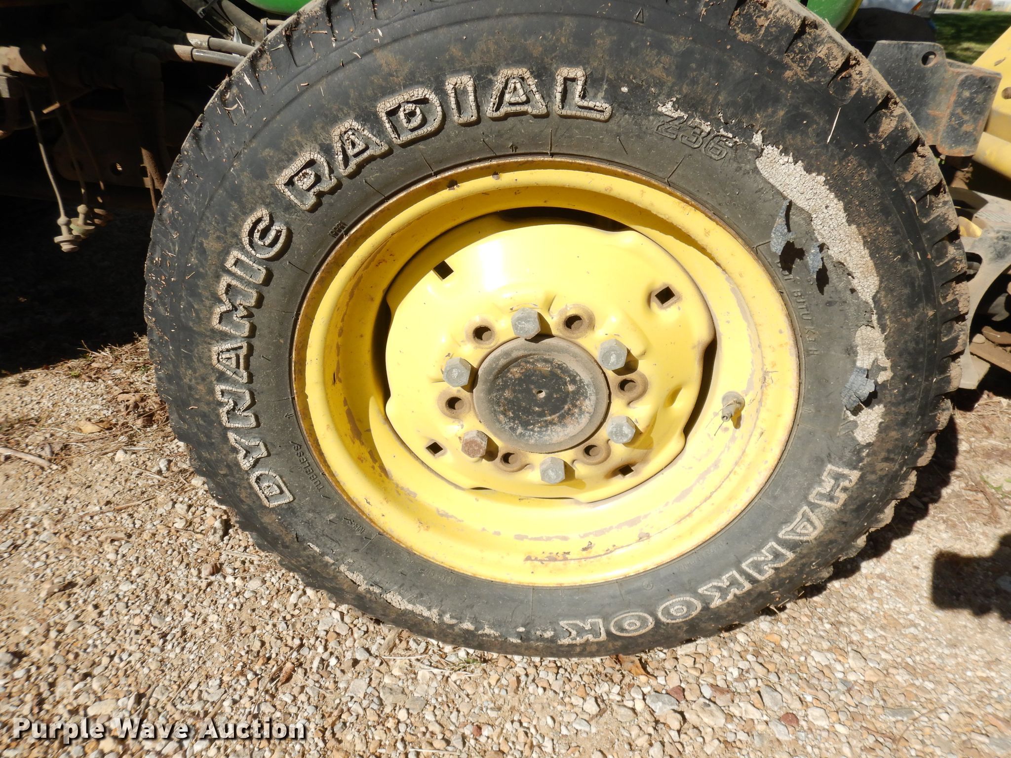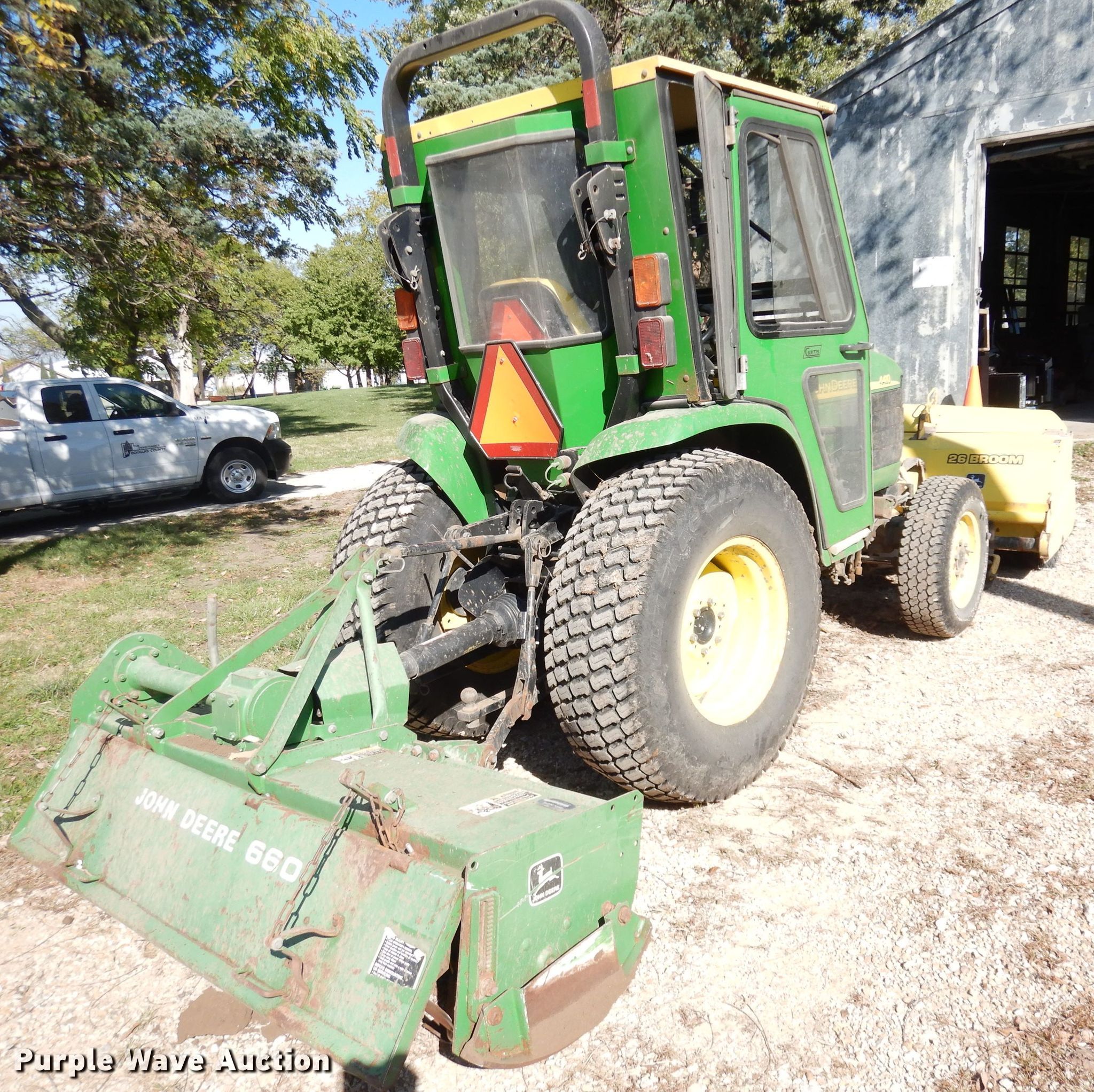 John Deere 4410 tractor. Hours: 1,091 on meter, Serial: LV4410H240156. Engine Cylinders: 3, Fuel type: Diesel. Transmission Hydrostatic. Operators station Heat. Operational PTO: 540, Three point Top link, Hydraulic remote sets Front: 2, Rear: 1, Suitcase weights: 5, Loader John Deere 420, Controls: Joystick, Bucket Width: 62", Blade controls: Joystick, Broom John Deere 26, Width: 5', Belly mower John Deere, Cutting width: 6', Mounting brackets, Rototiller John Deere 660, Width: 5'. Tires Front: 215/75R15, Rear: 41x14.00-20. Maintenance Shop Location. 2110 Harper St. Lawrence, KS 66046