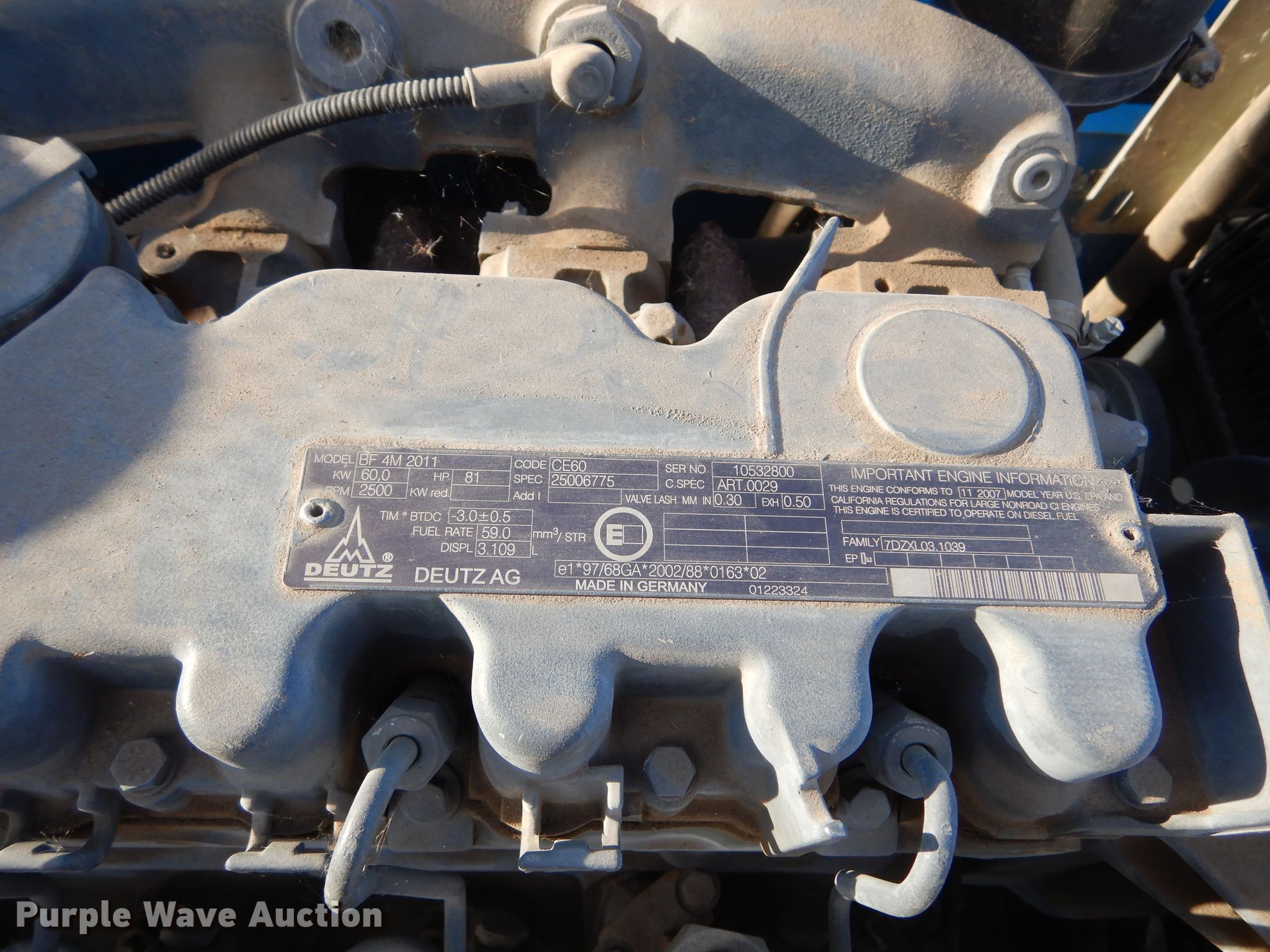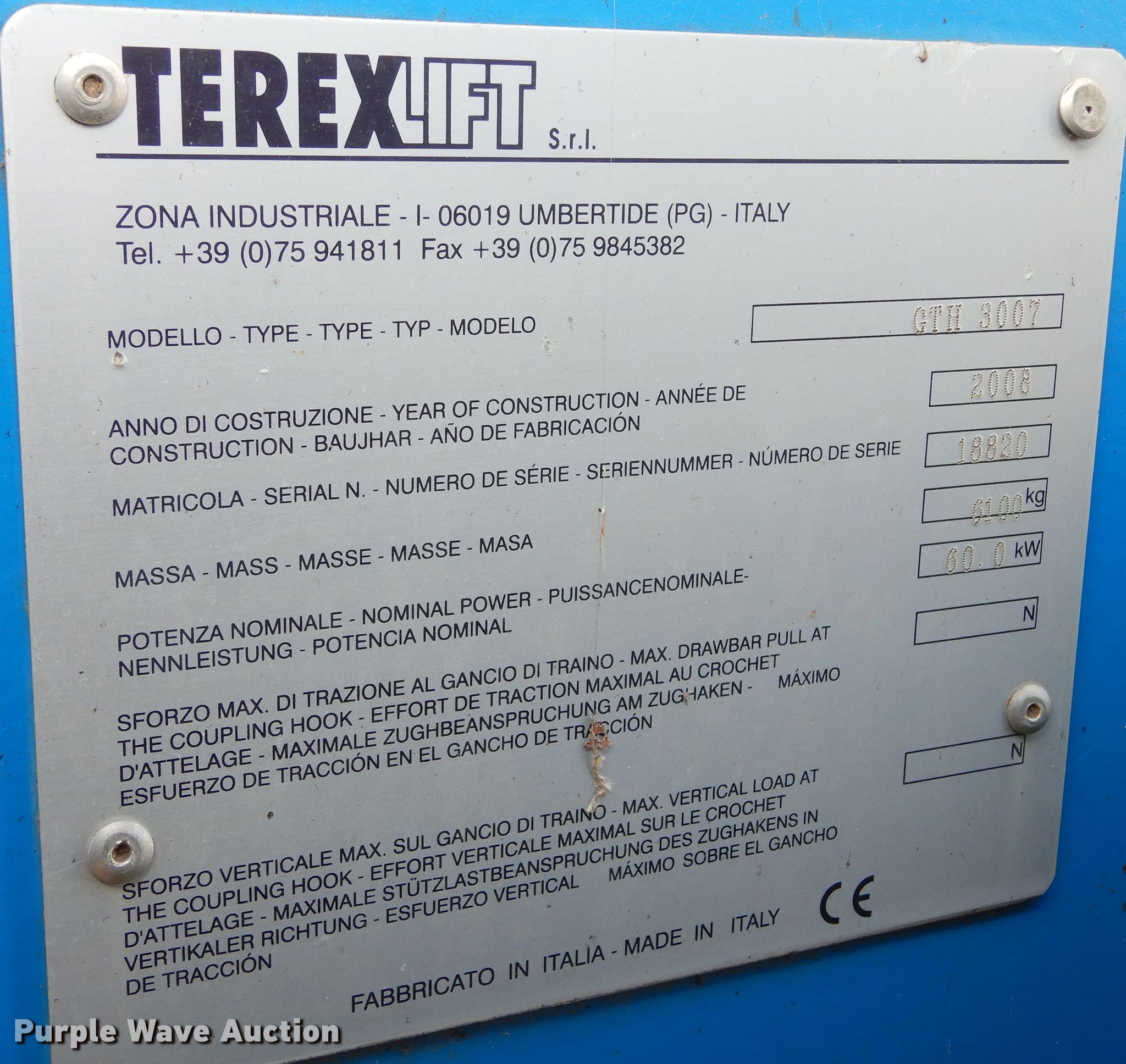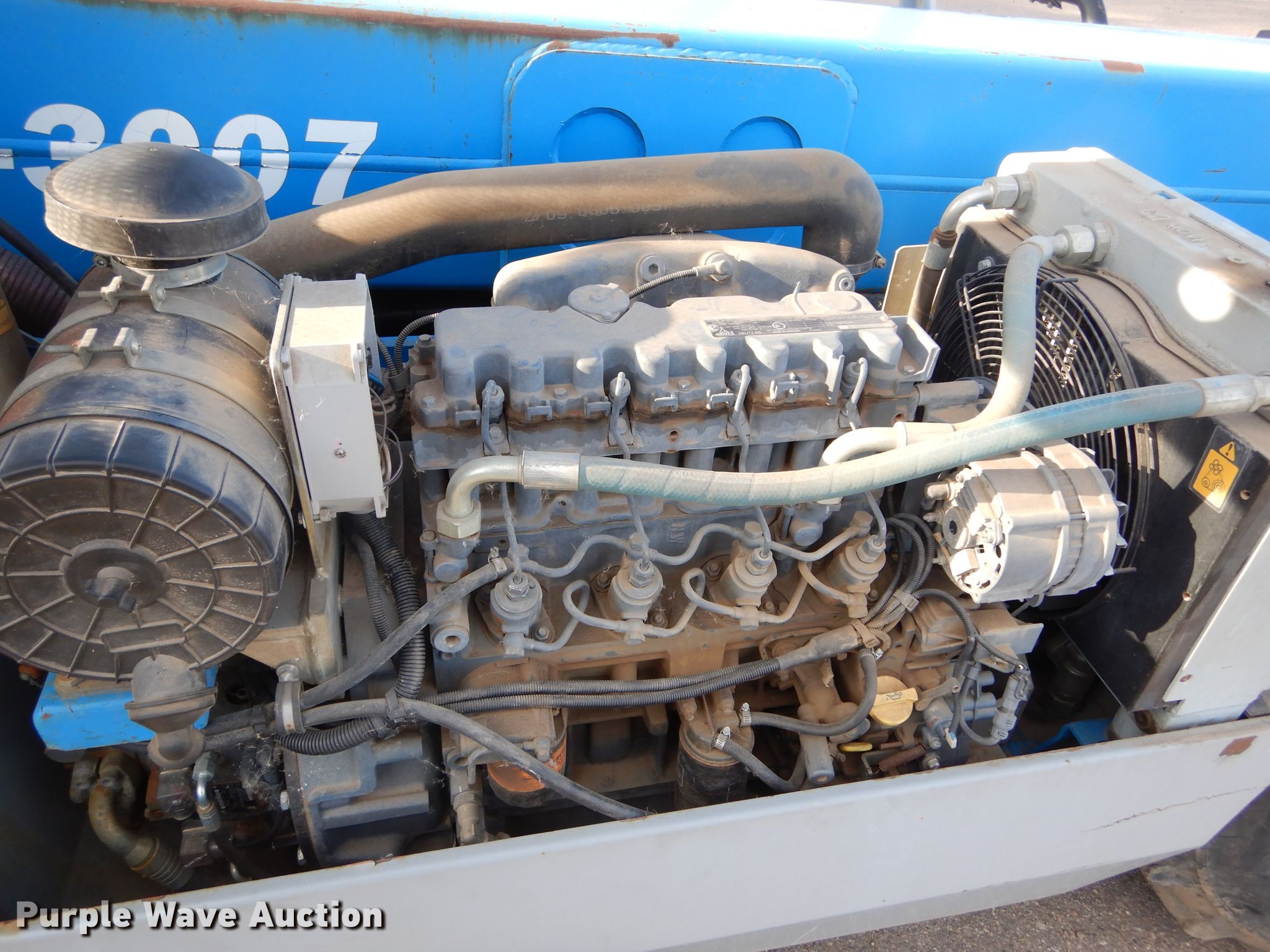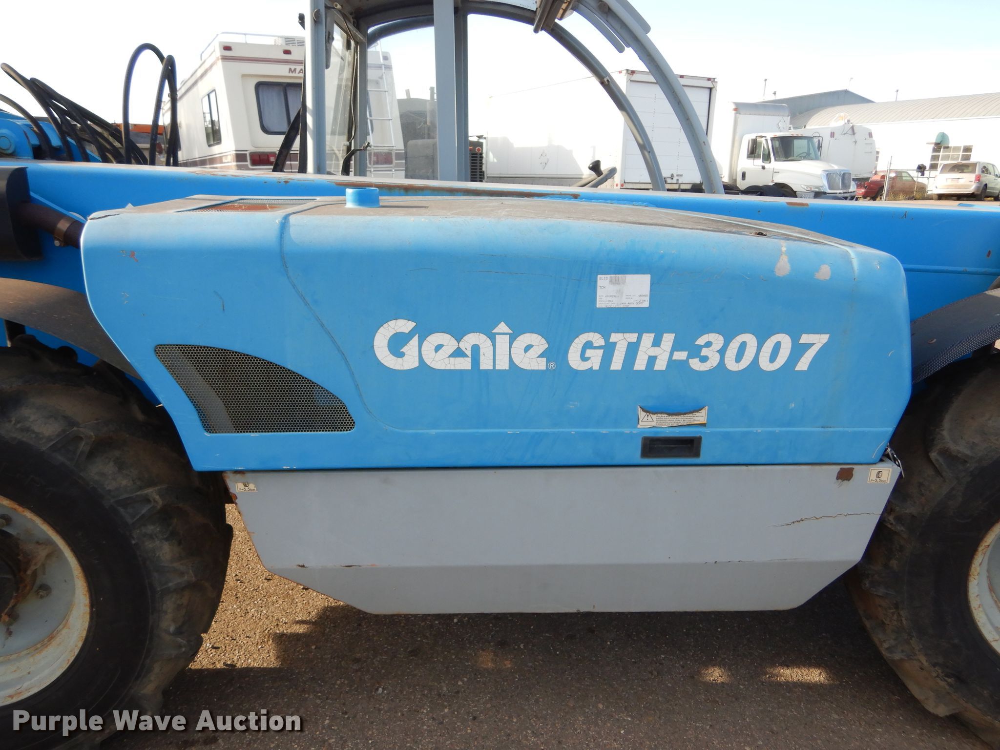 2008 Genie GTH-3007 telehandler. Serial: 18820. Engine Deutz, Cylinders: 4, Fuel type: Diesel. Transmission Powershift, Four wheel drive. Operators station Canopy, Steering: Crab, Four wheel. Operational Maximum lift capacity: 6,614 lbs, Maximum lift height: 22', Boom stages: 2, Fork length: 40", Auxiliary hydraulics, Quick attach: Hydraulic. Tires Size: 405/70R20. Notes Glass cracked or missing. 1836 US 14. Huron, SD 57350