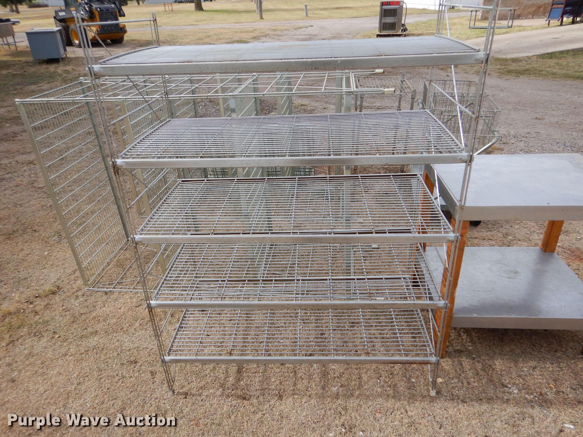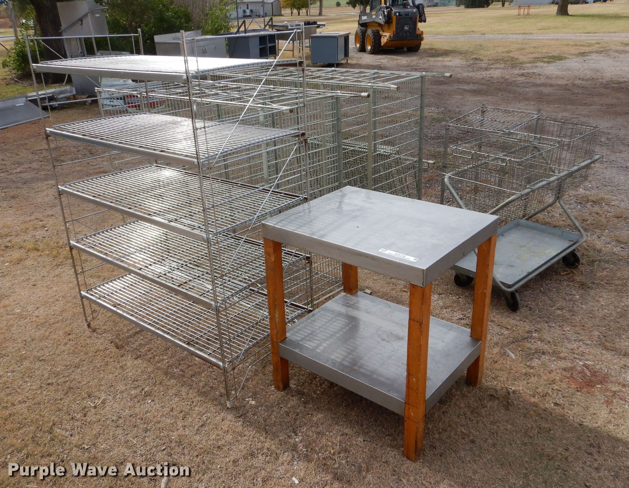 Purple Wave is selling a used Restaurant Equip. in Kansas. This item is a Restaurant equipment with the following: Prep table with stainless steel top, (3) storage shelves, 48" x 24" x 75", 48" x 24" x 62" storage shelf, 24" x 18" x 36" storage shelf, 41" x 20" x 36" basket