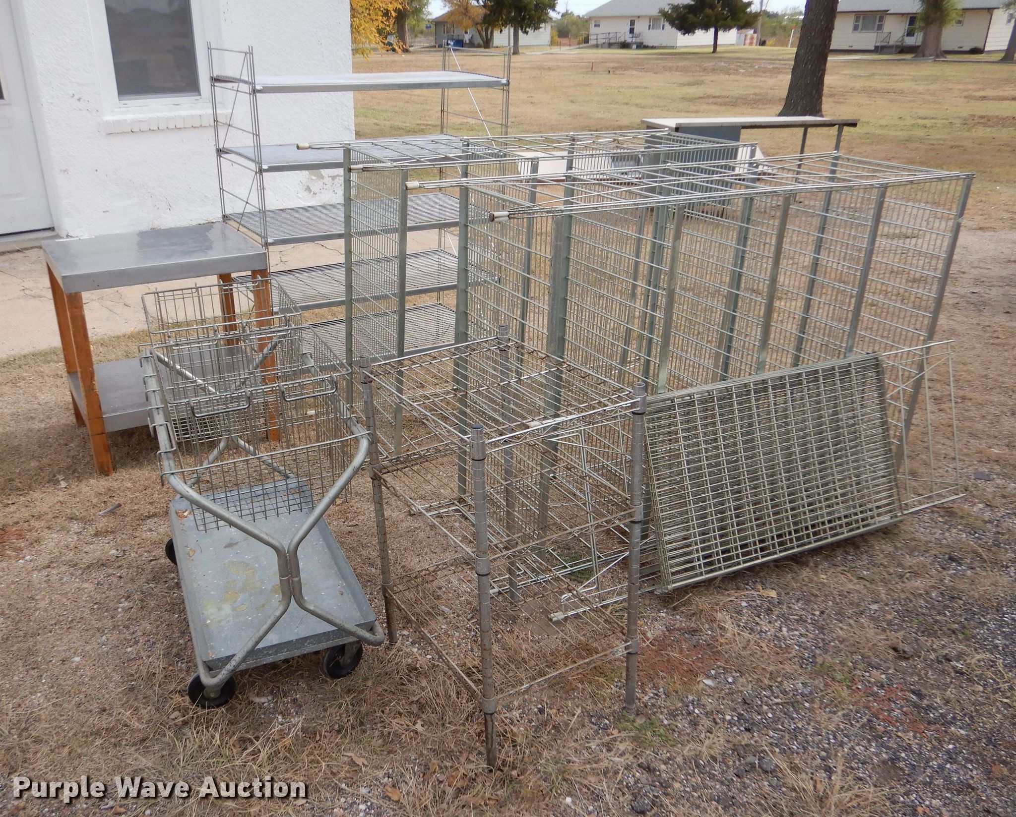 Restaurant equipment. Prep table with stainless steel top , (3) storage shelves 48" x 24" x 75", 48" x 24" x 62" storage shelf, 24" x 18" x 36" storage shelf, 41" x 20" x 36" basket. KS Soldiers Home. Fort Dodge, KS 67843