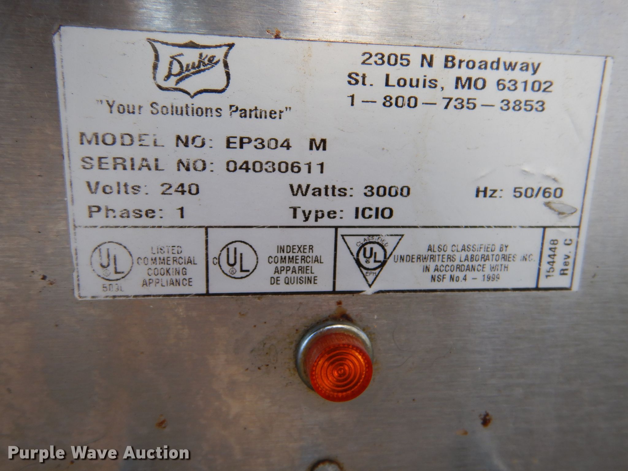 Purple Wave is selling a used Restaurant Equip. in Kansas. This item is a Duke EP304 M steam table with the following: 4' 10" x 30" x 33", Four compartments, Volts: 240, Phase: Single, Serial: 04030611, Rear glass is missing