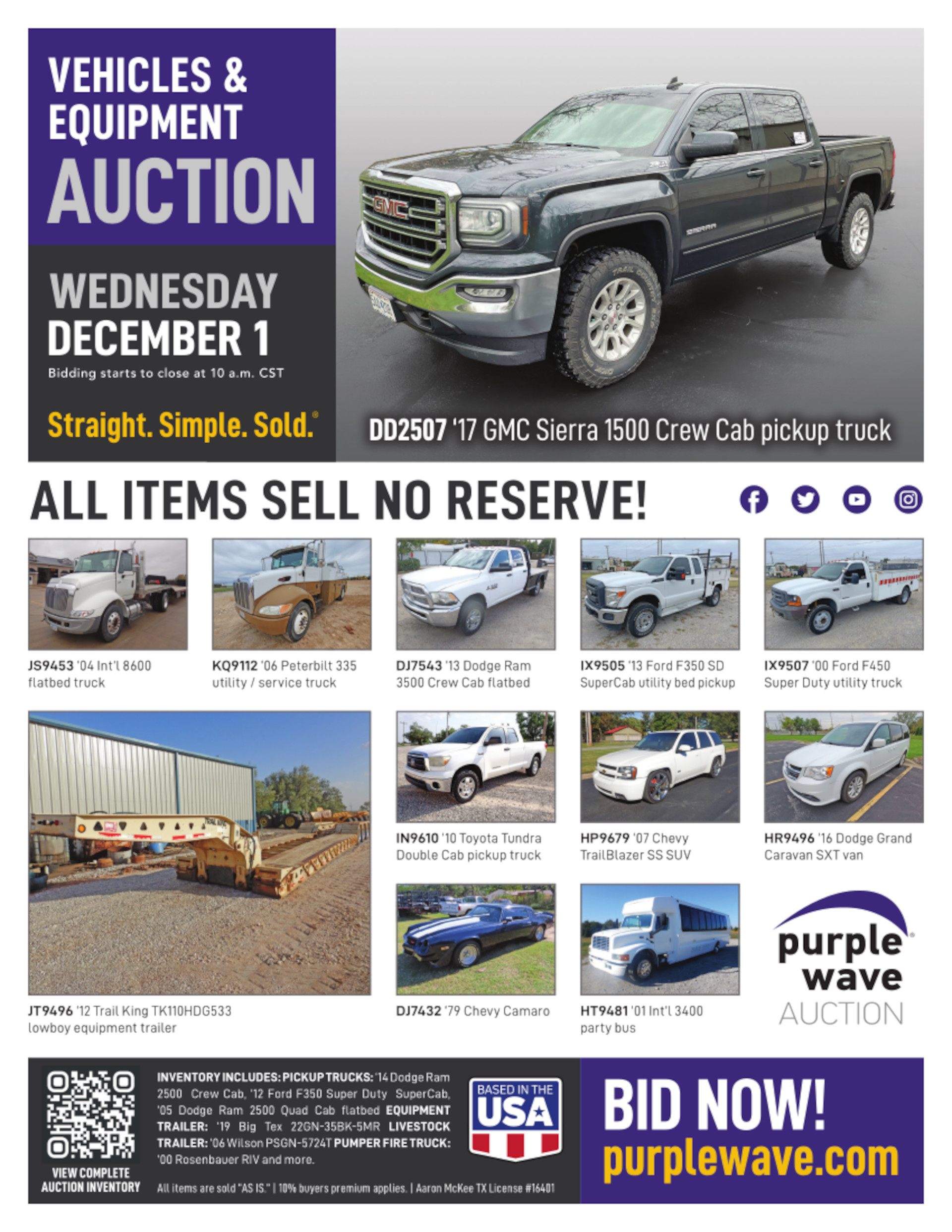 This auction is conducted by Purple Wave, Inc., whose home office is 825 Levee Drive, Manhattan, Kansas. Aaron McKee, Texas auctioneer license # 16401, operates Purple Wave, Inc. Complaints against us may be directed to the Texas Department of Licensing and Regulation, P.O. Box 12157, Austin, Texas 78711, (512) 463-6599. For additional required information, see the attached document.