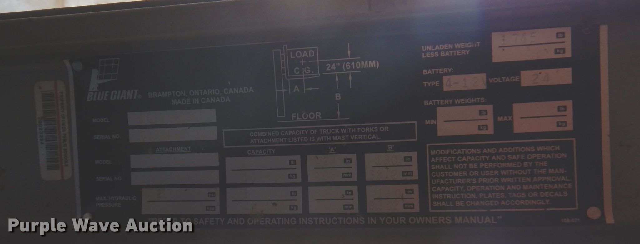 Blue Giant BG330-130 forklift. Serial: 0330466. Electric Motor Volts: 24. Transmission Hydrostatic. Operational Maximum lift capacity: 1,000 lbs, Maximum lift height: 130", Fork length: 42". Tires Solid. Chris Thorton. May, OK 73851