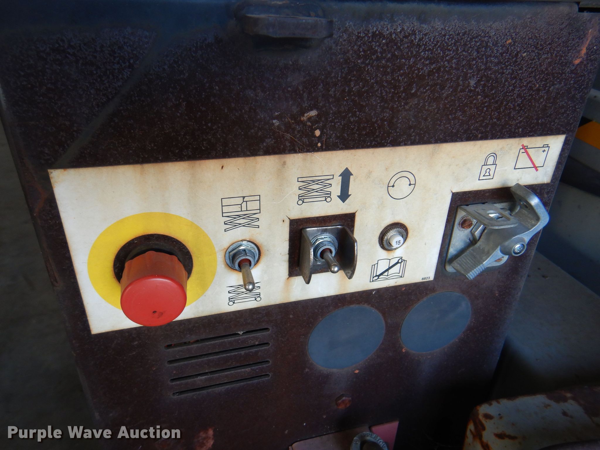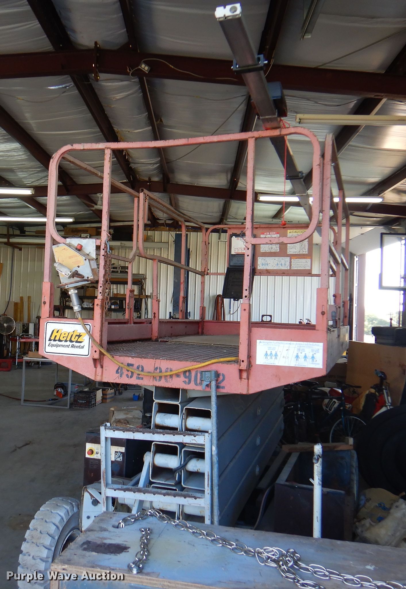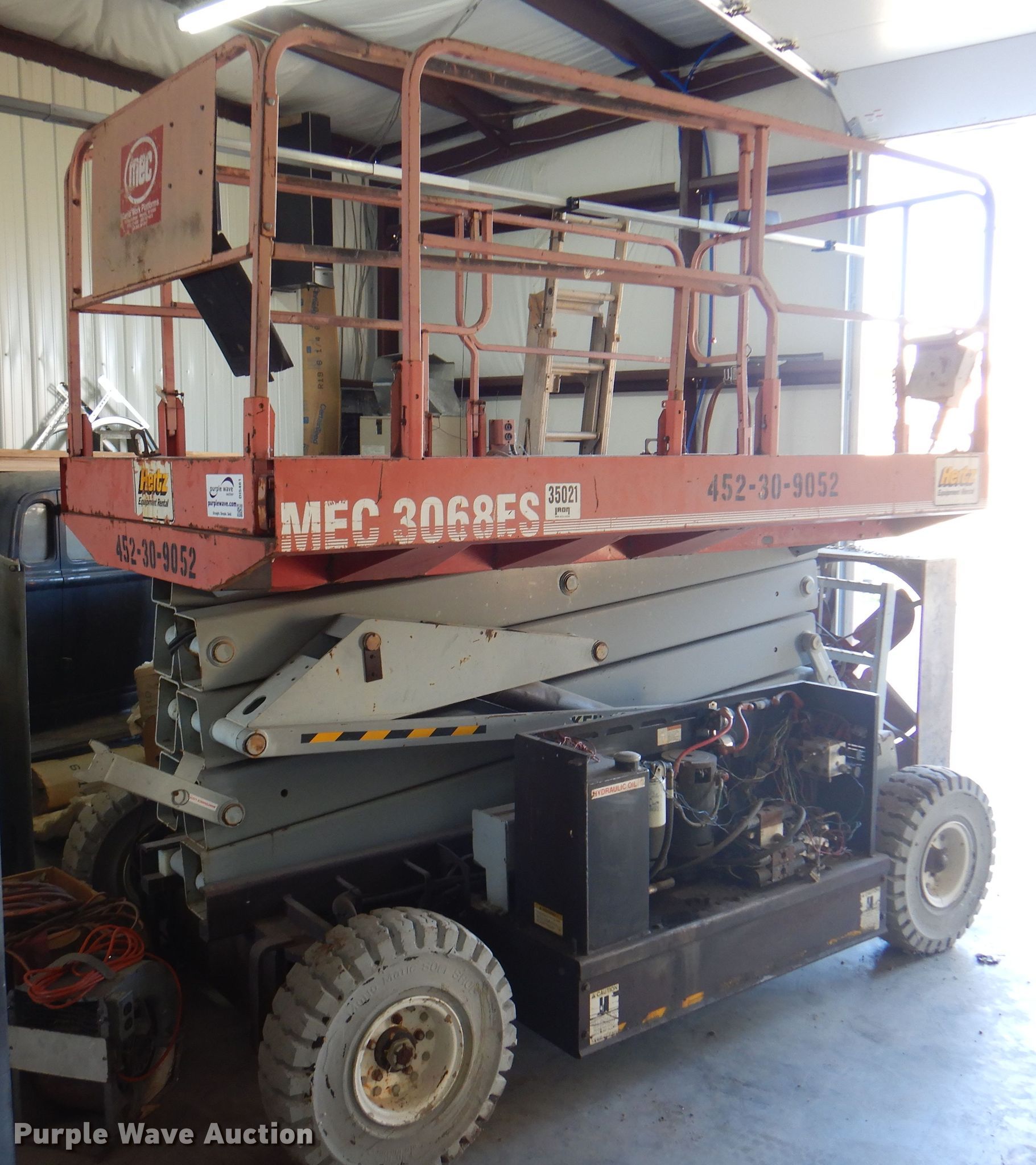 Purple Wave is selling a used Scissor or Vertical Lift in Oklahoma. This item is a Mec 3068ES scissor lift with the following: Model: D-5, Serial: H9800342, HP: 4, Volts: 48
