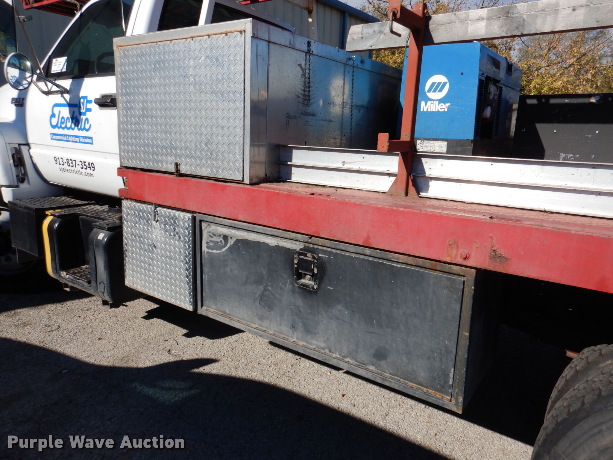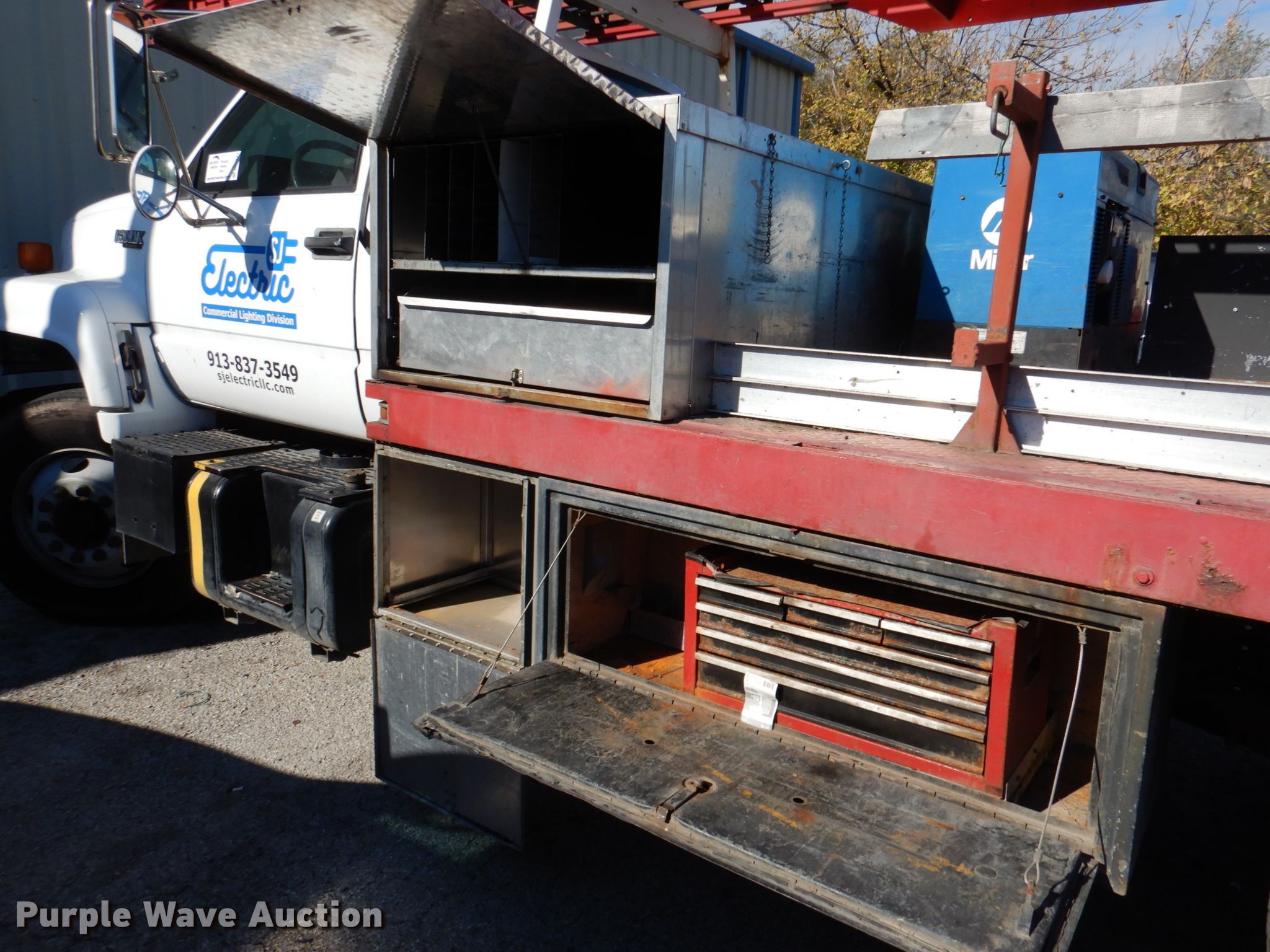 1995 Chevrolet Kodiak flatbed truck with boom ladder. Miles: 231,153 on odometer, VIN: 1GBJ7H1J2SJ116369. Engine Caterpillar 3116, Serial: 9GKK31949, Displacement: 6.6L, Cylinders: 6, Fuel type: Diesel, HP: 200. Transmission Manual, Speed: 6. Chassis Axles: Single, Suspension: Spring, Brakes: Hydraulic, GVWR: 25,950 lbs, Wheelbase: 185". Interior Heat. Operational Bed 14' 6" L x 94" W, Generator Miller Blue charger, Hours: 2,686, Fuel type: Gas, 240V outlets: 1, 120V outlets: 4, Watts: 5,000, Welder Welder type: CC, Stick (AC/DC), Crane Maximum lift capacity: 300 lbs, Ladder Sections: 3, Length: 20'. Tires Size: 10R22.5. Notes Dash warning indicator: Brake, Windshield chipped or cracked, Weak parking brake. Kansas title. SJ Electric, LLC. 9410 W 61st St. Shawnee, KS 66203