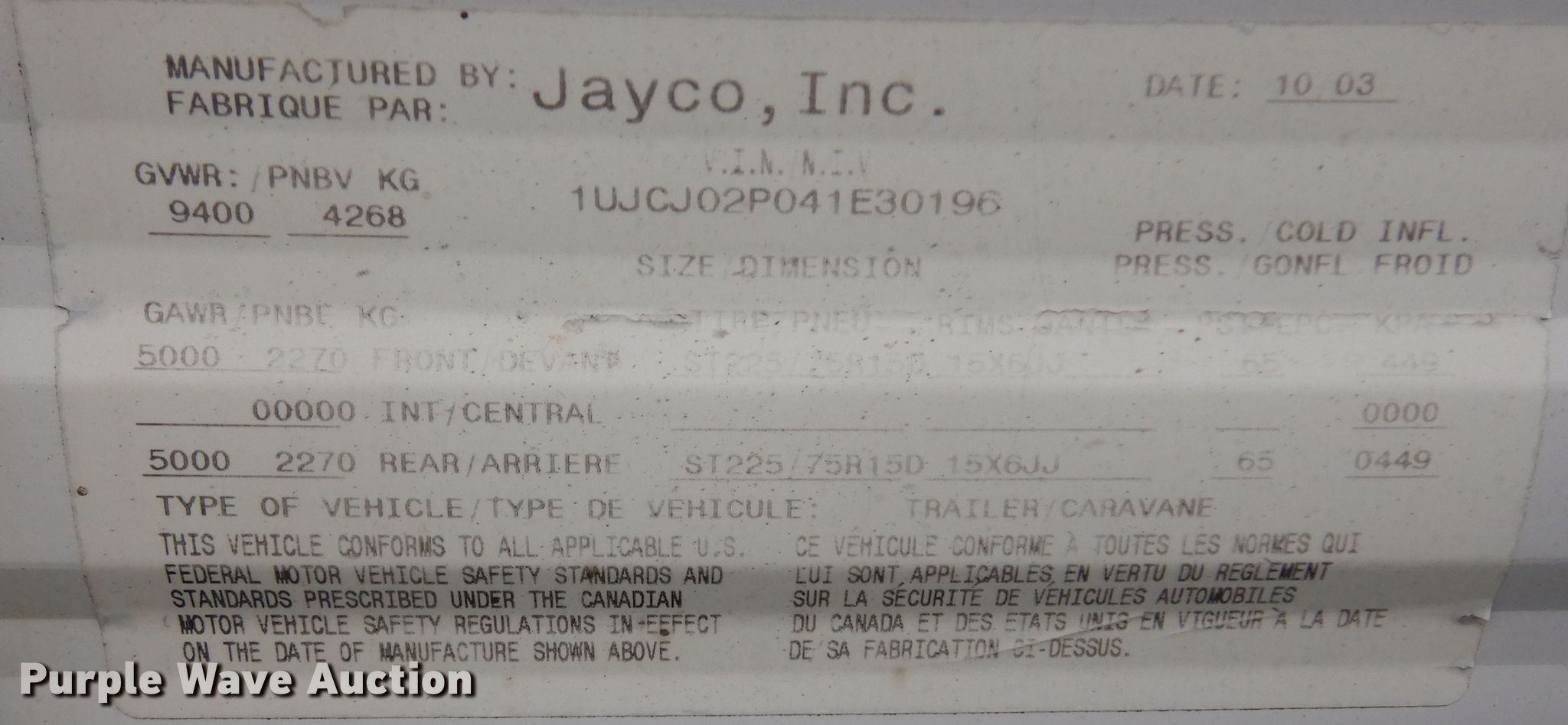 2004 Jayco Jay Flight 28.5 RLS camper. Camper length: 30' 6", VIN: 1UJCJ02P041E30196. Chassis Axles: Tandem, Suspension: Spring, Brakes: Electric, GVWR: 9,400 lbs, GAWR: 5,000 lbs. Interior Kitchen: Sink, Refrigerator, Freezer, Microwave, Oven, Stove: Propane, Living room: Table, Couch, Bathroom, Beds: 1 Bed type: Queen, Sound system, AC units: 1. Operational Slide outs: 1, Awnings: 1 Awning type: Manual. Tires Size: ST225/75R15. Notes Water damage , Floor damage, Contents not included. Minnesota title. 32729 County Rd 2. Morton, MN 56270