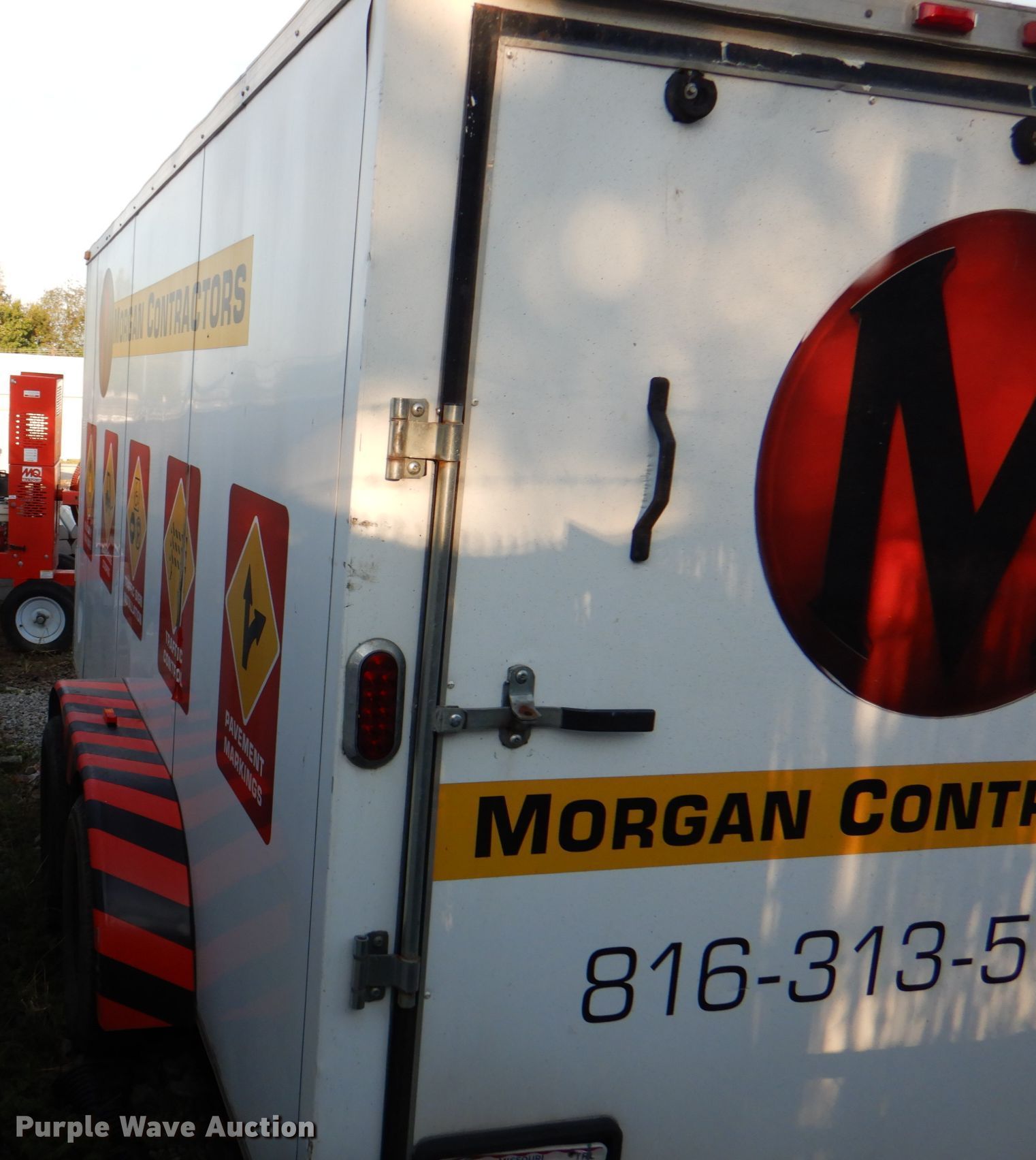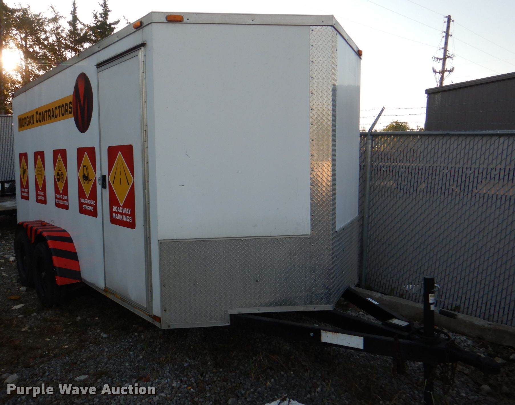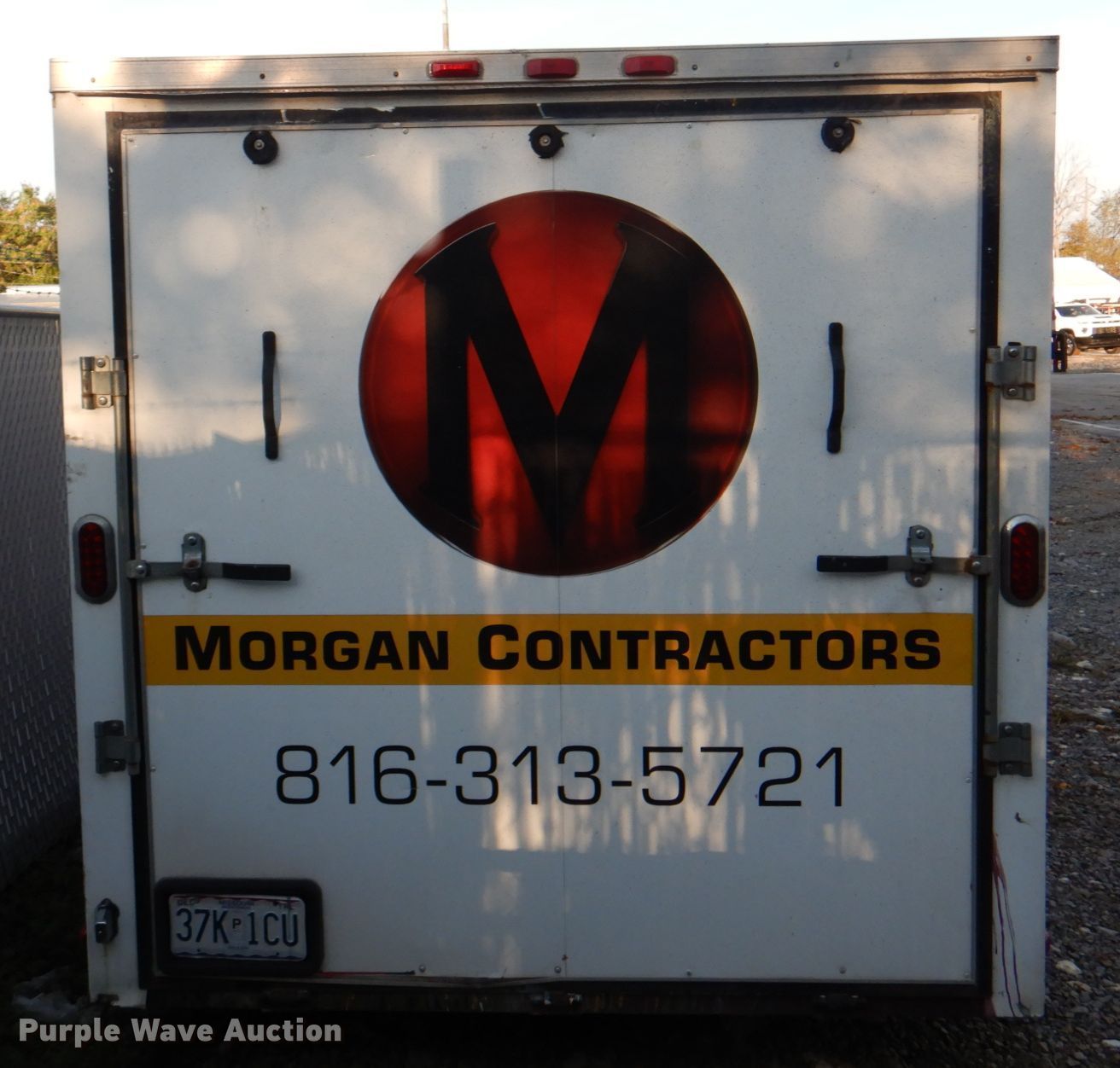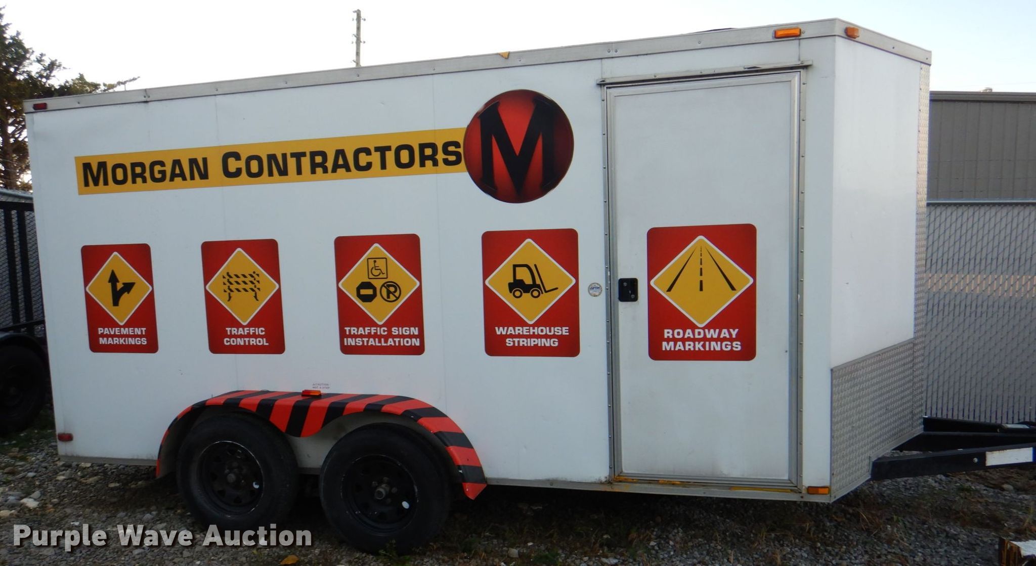2013 Arising Industries 714VTRW enclosed cargo trailer. VIN: 5YCBE1420DH013202. Dimensions Overall: 19' 6" L x 102" W, Body: 14' L x 83" W. Operational Deck type: Wood. Chassis Ball hitch: 2 5/16", Landing gear: Single, Suspension: Spring, Brakes: Electric, Axles: Tandem. Tires Size: 205/75R15. Missouri title. Morgan Contractors. 929 Locust Hill Circle. Belton, MO 64012