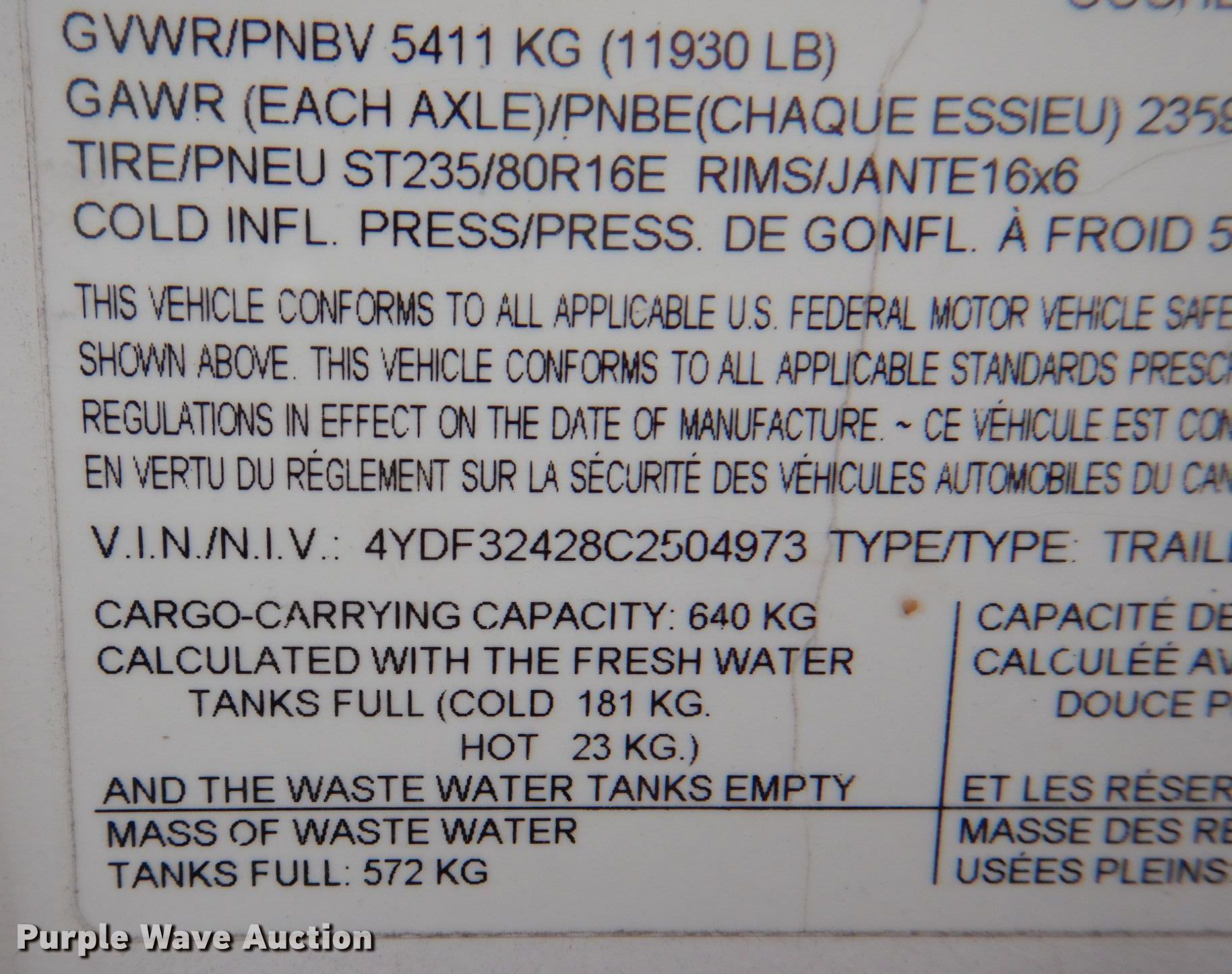 2012 Keystone Cougar camper. Camper length: 35', VIN: 4YDF32428C2504973. Chassis Axles: Tandem, Suspension: Spring, Brakes: Electric, GVWR: 11,930 lbs. Interior Kitchen: Sink, Refrigerator, Freezer, Microwave, Oven, Stove: Propane, Living room: Table, Pull Out Couch, Beds: 5 Bed type: Queen, TVs: 2, Heater, AC units: 1. Operational Slide outs: 3, Awnings: 1 Awning type: Electric, Rear door/ ramp. Tires Size: 235/80R16. Nebraska title. Title distribution may be delayed up to 30 days from verification of funds. 101 E 2nd St. Smithville, MO 64089