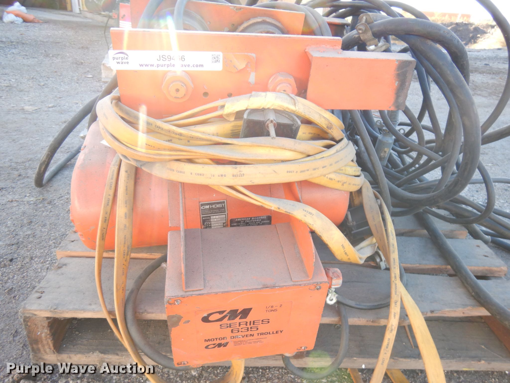 Purple Wave is selling a used Overhead or Straddle Crane in Illinois. This item is a CM R2 chain hoist with the following: Capacity: 2 tons, Volts: 480, Phase: Three, Hz: 60, CM Series 635 trolley
