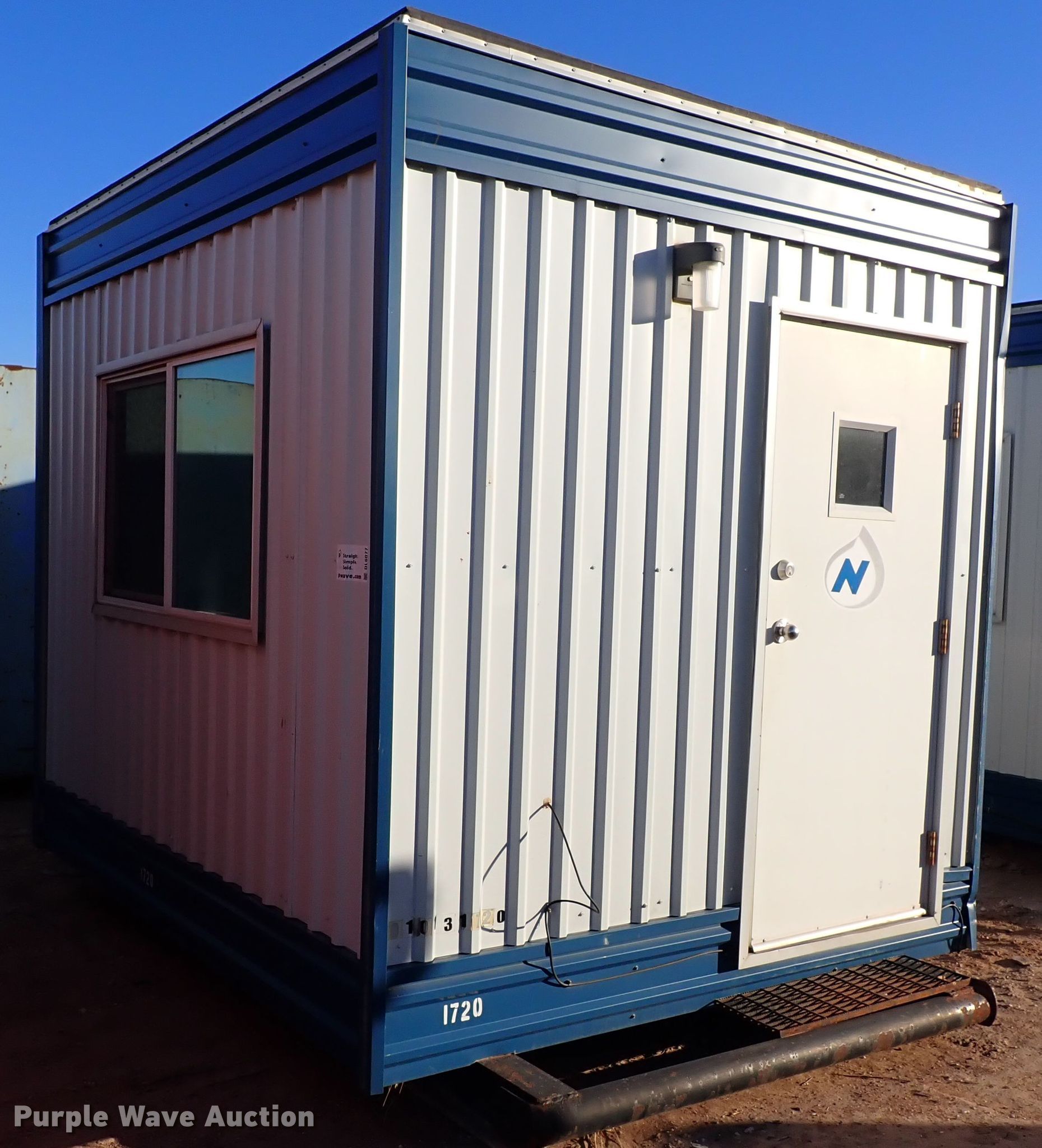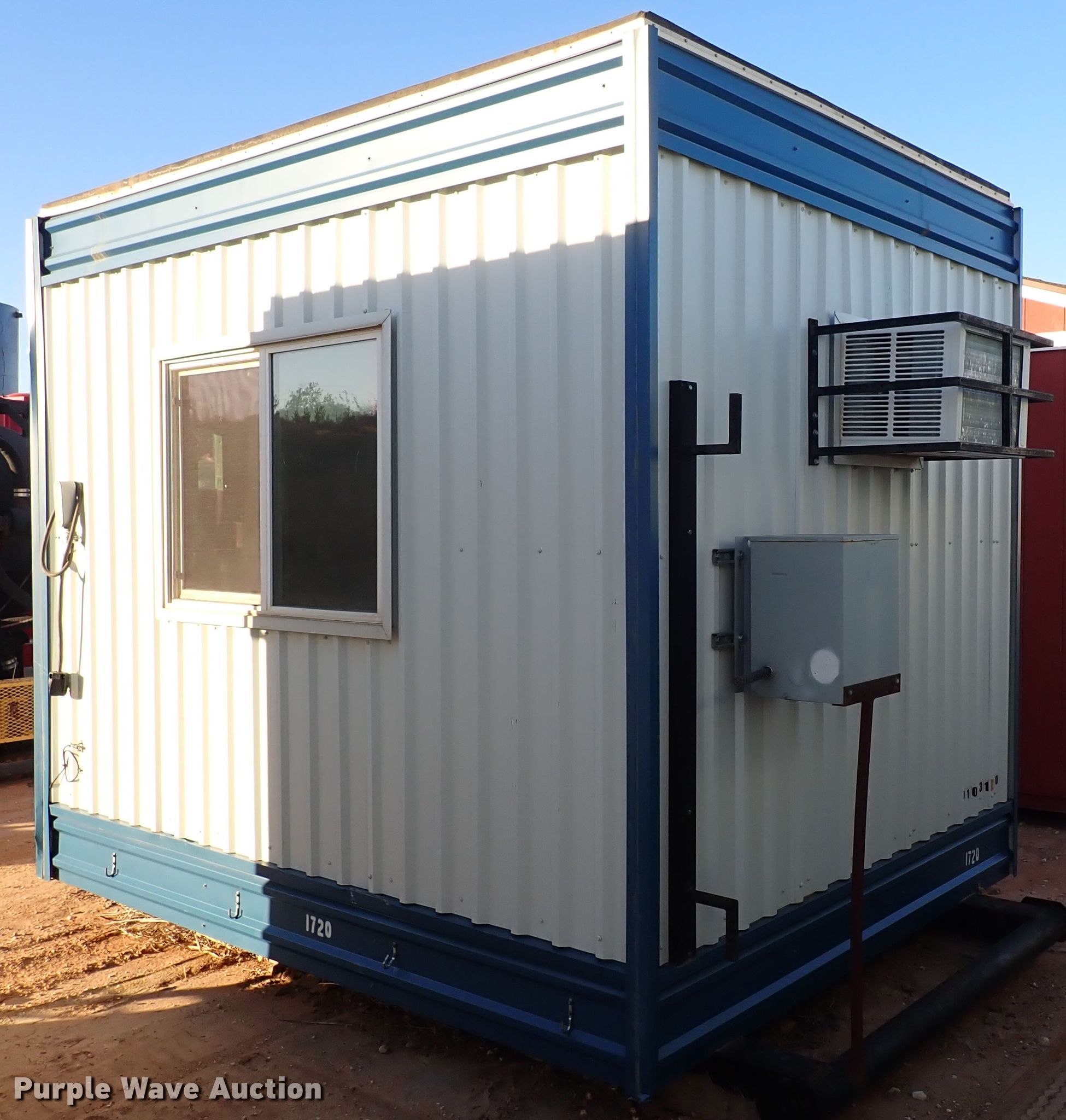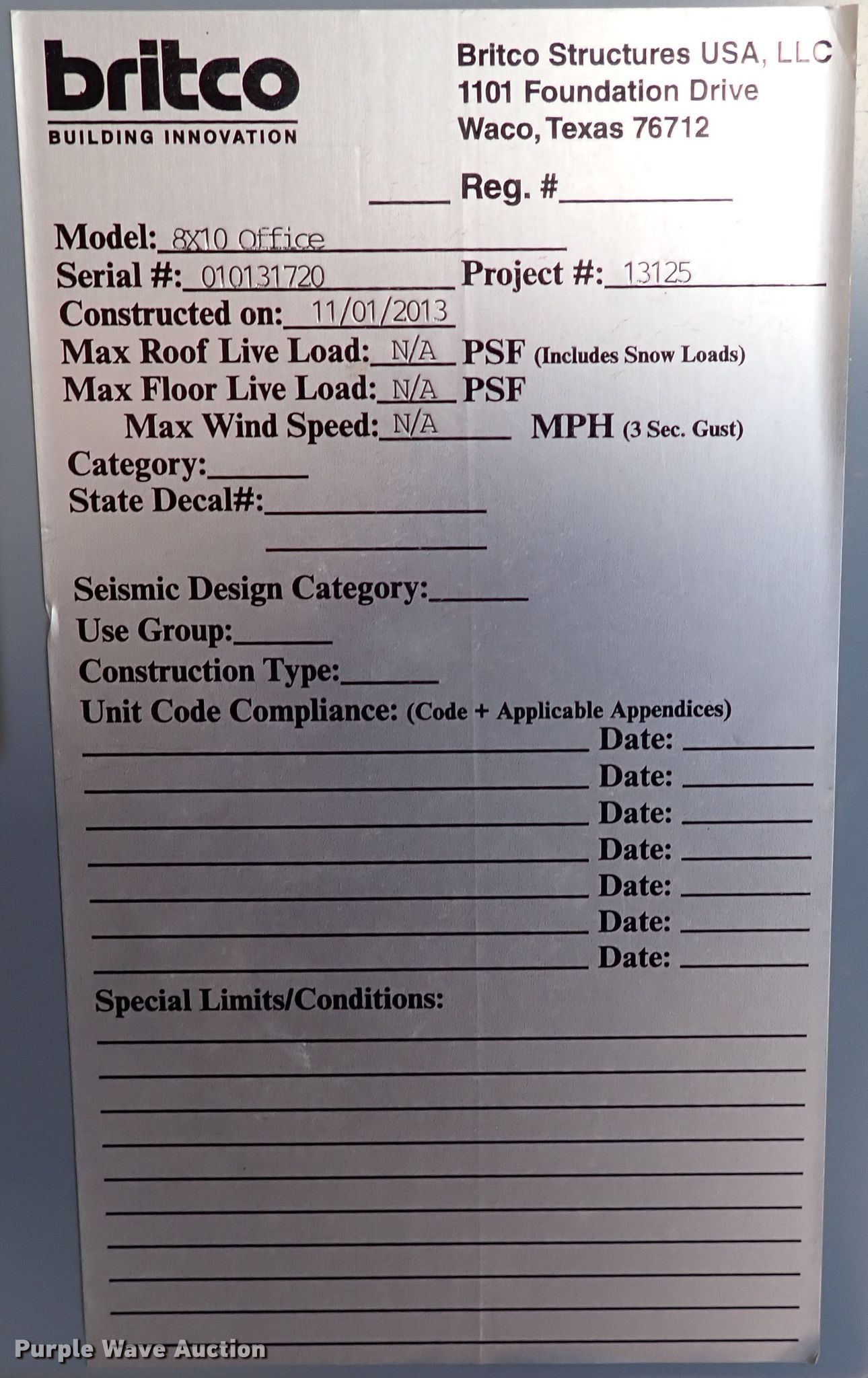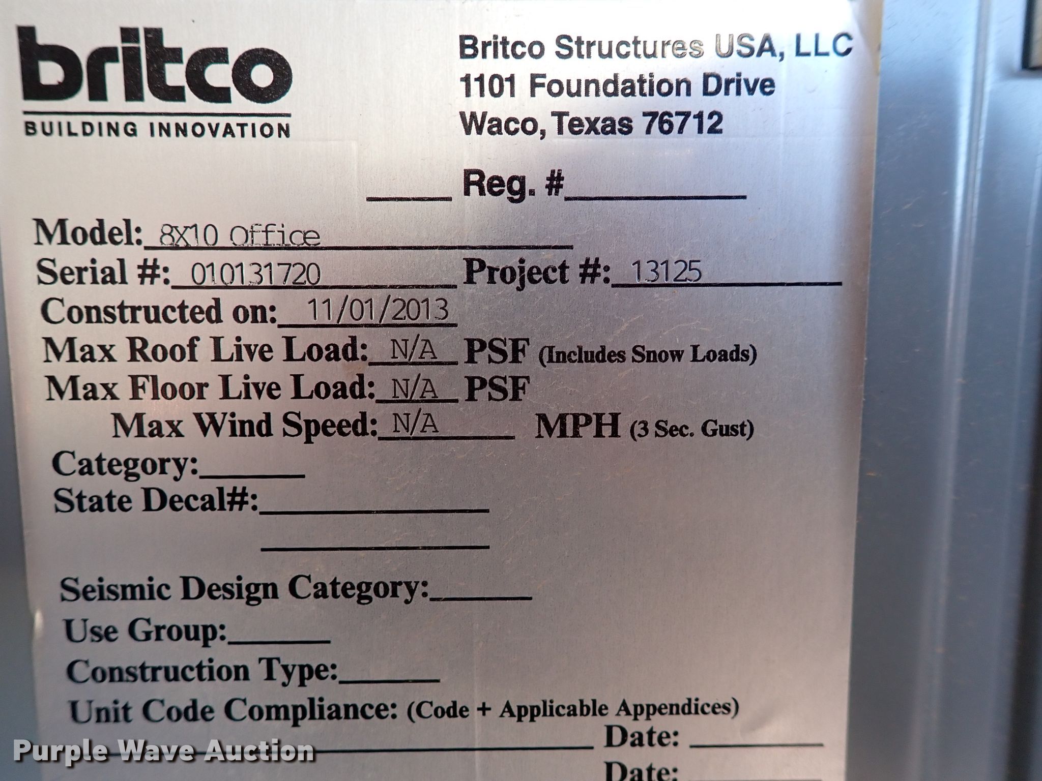 Purple Wave is selling a used Manufactured Home or Office in Oklahoma. This item is a 2013 Britco jobsite office with the following: 10' L x 8' W x 8' H, Frigidaire AC unit, Skid mounted, 12' L x 76" W, Serial: 010131720