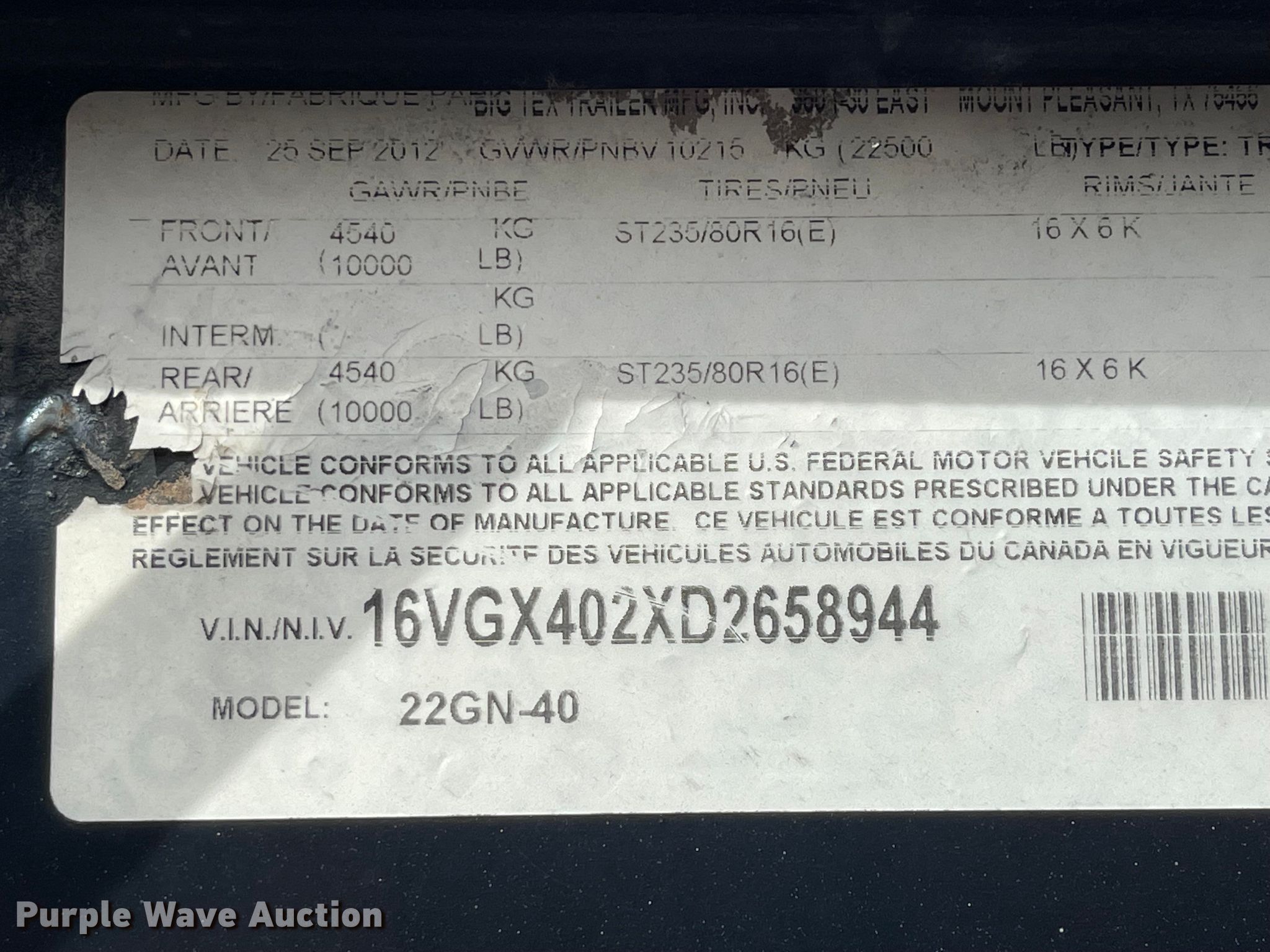 Purple Wave is selling a used Equip. Trailer in Pennsylvania. This item is a 2013 Big Tex 22GN-40 equipment trailer with the following: VIN: 16VGX402XD2658944