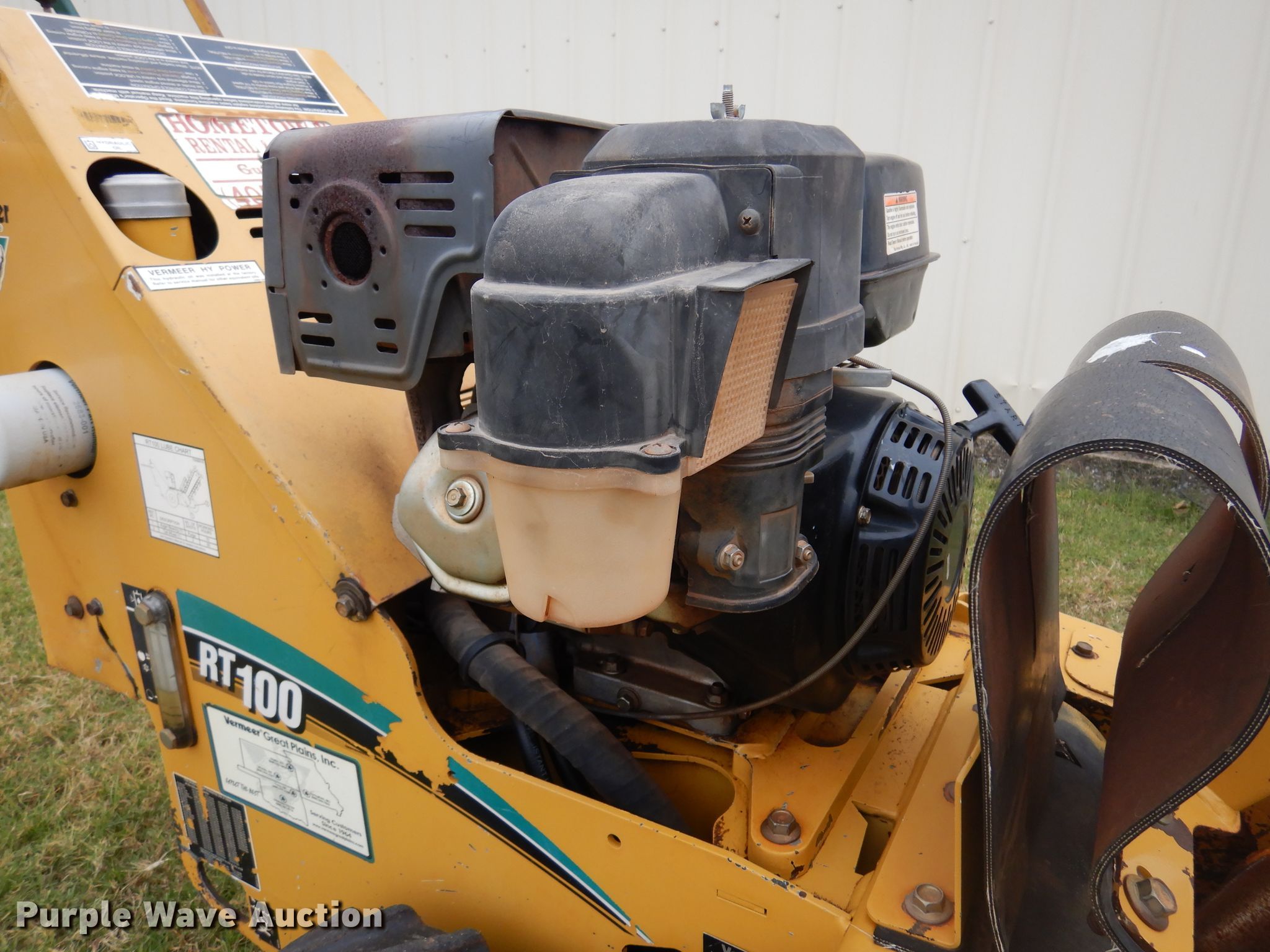 Vermeer RT100 trencher. Hours: Unknown, Serial: 1VRX051E361002303. Engine Honda GX390, Cylinders: 2, Fuel type: Gas. Transmission Hydrostatic. Operational Trencher Estimated dig depth: 40", Cutting width: 4", Teeth: Dirt. Tires Front: 13x5.00-6, Rear: 16x6.50-8. Notes Non-operational hour meter. Womack Diesel LLC. Guthrie, OK 73044