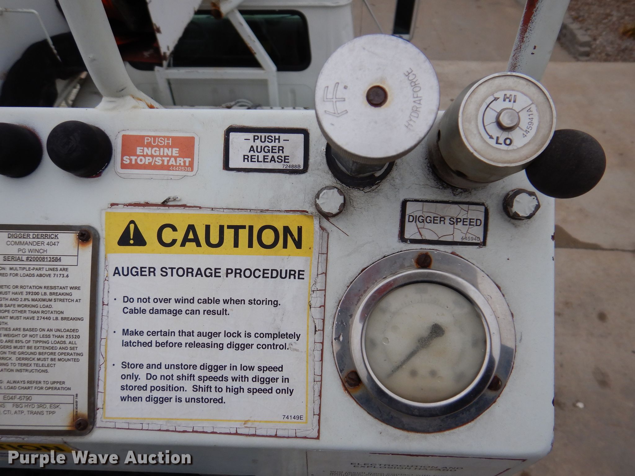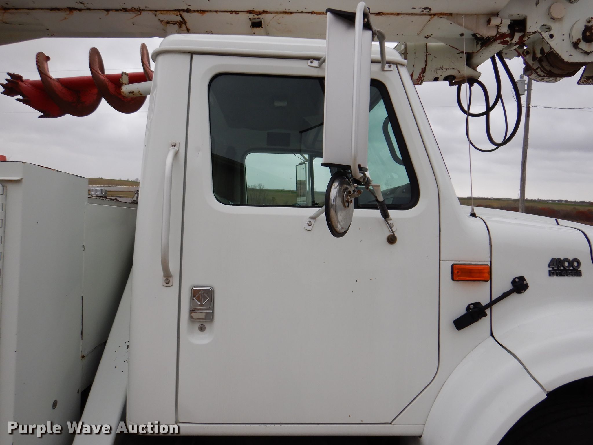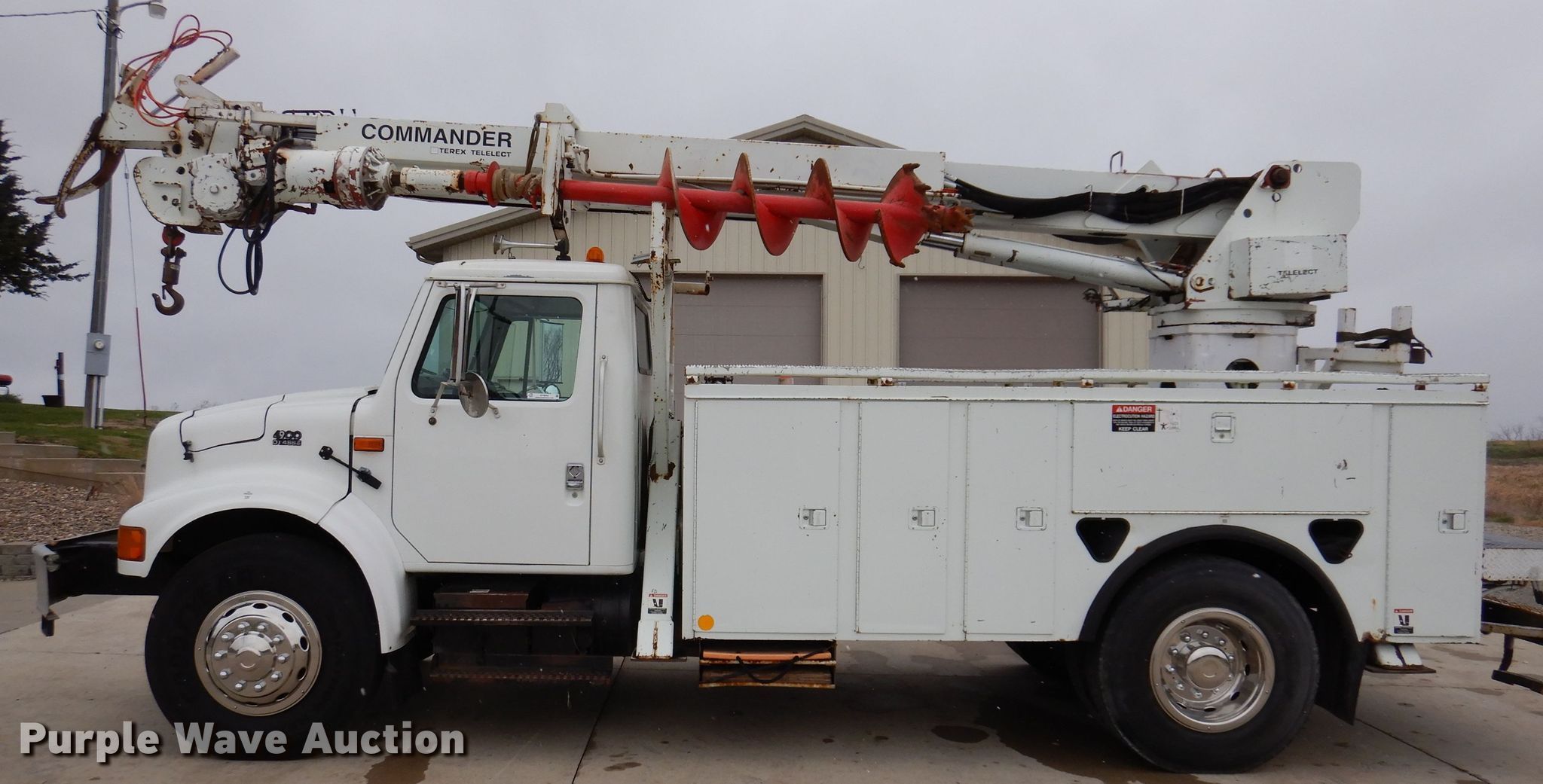 2001 International 4900 digger derrick truck. Miles: 110,561 on odometer, Hours: 9,246 on meter, VIN: 1HTSDAAN61H343821. Engine International DT466E, Displacement: 7.6L, Cylinders: 6, Fuel type: Diesel, HP: 215. Transmission Automatic. Chassis Axles: Single, Suspension: Spring, Brakes: Air, PTO, GVWR: 33,000 lbs, Wheelbase: 176". Interior Heat, Auxiliary controls, Brake controller. Operational Bed Dueco DSL102, Serial: 0900208, 14' L x 94" W, Boom 2001 Terex Commander 4047, Serial: 2000813584, Boom length: 35', Mast height: 9', Maximum lift capacity: 18,650 lbs, Maximum lift height: 44', Boom type: Insulated, Telescopic, Boom controls Platform/ basket, Material handler, Pole guide, Auger Diameter: 20", Winch capacity: 2300 lbs. Tires Front: 12R22.5, Rear: 11R22.5. Minnesota title. Seller is an Iowa licensed motor vehicle dealer. The buyer may be required to pay sales tax and/or registration fees to the dealer prior to taking possession. Title will be assigned and distributed by the dealer. Please contact the seller for distribution questions. B&K Ventures, Inc.. 1393 Highway G76. Knoxville, IA 50138