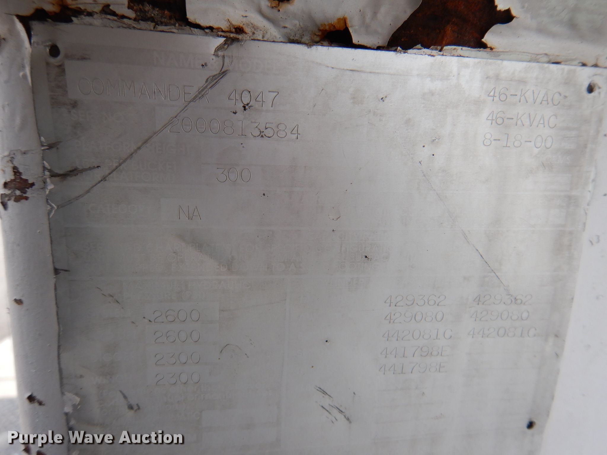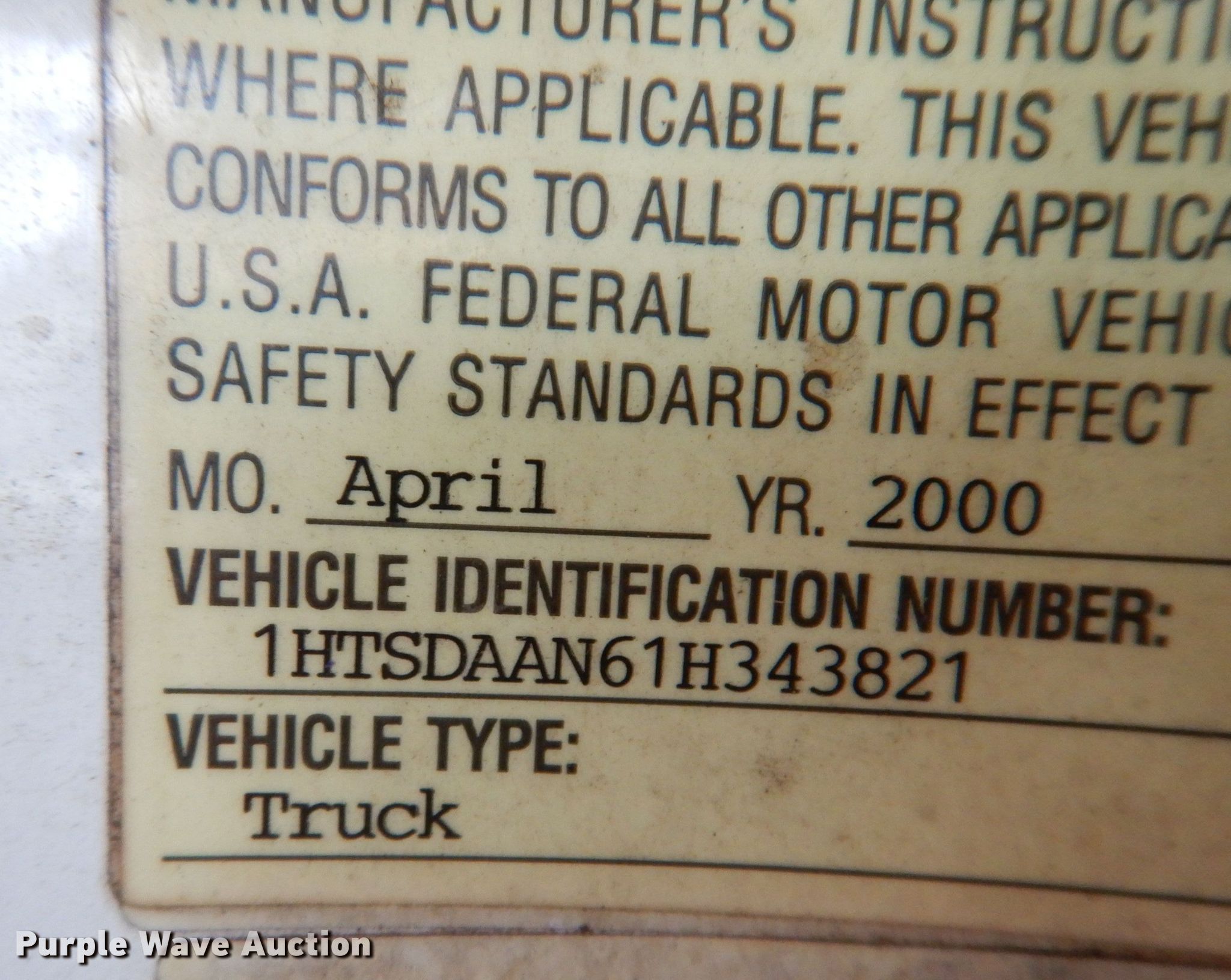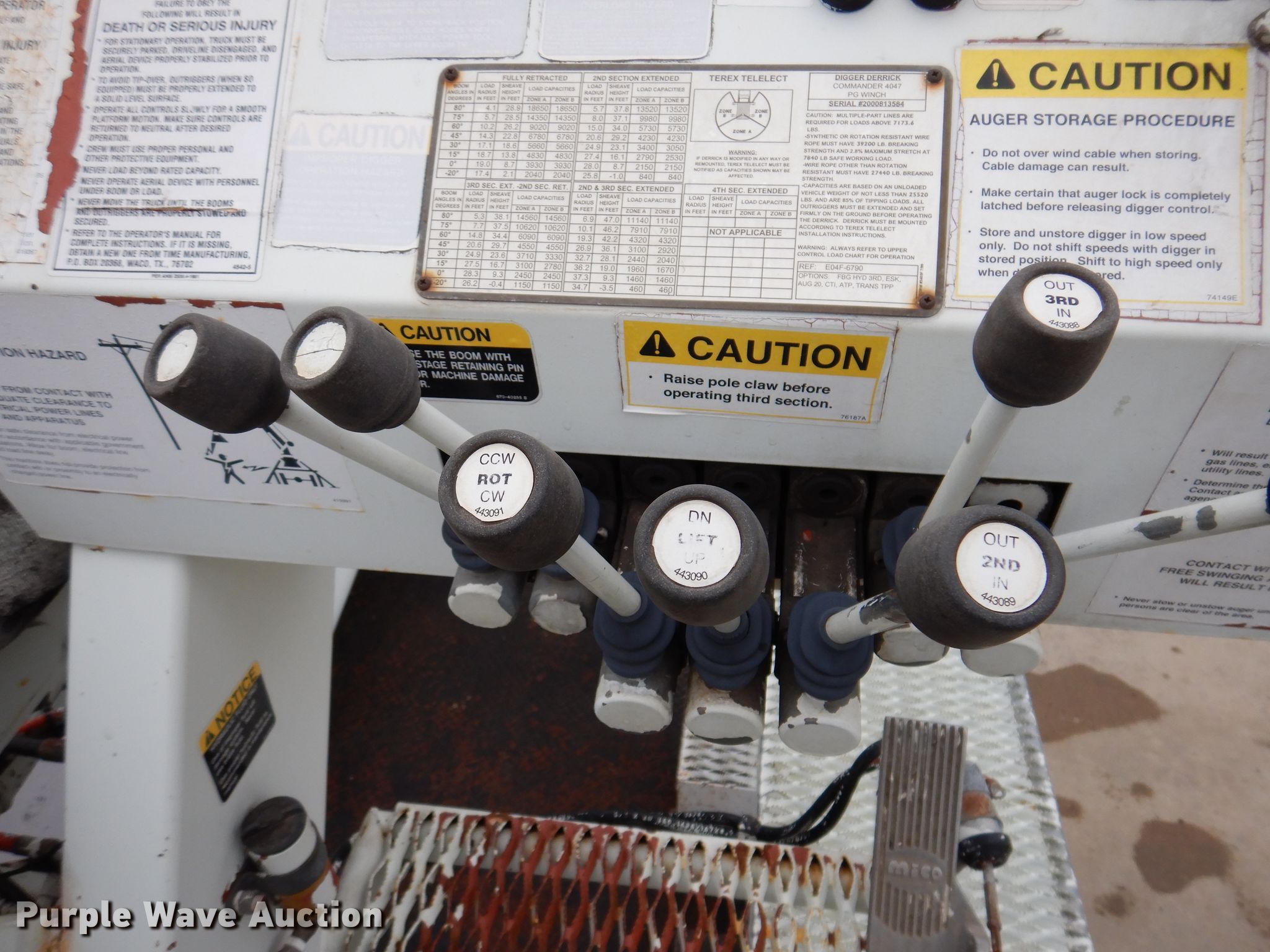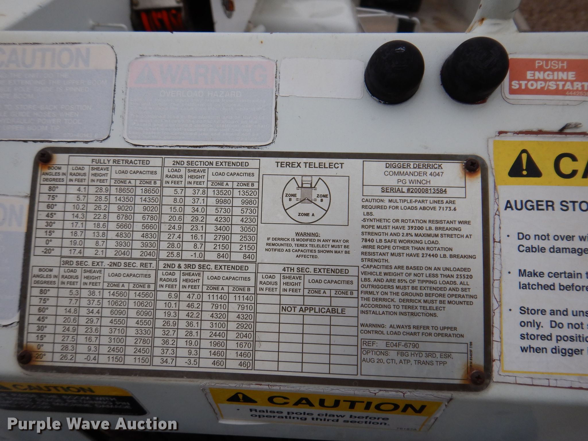 2001 International 4900 digger derrick truck. Miles: 110,561 on odometer, Hours: 9,246 on meter, VIN: 1HTSDAAN61H343821. Engine International DT466E, Displacement: 7.6L, Cylinders: 6, Fuel type: Diesel, HP: 215. Transmission Automatic. Chassis Axles: Single, Suspension: Spring, Brakes: Air, PTO, GVWR: 33,000 lbs, Wheelbase: 176". Interior Heat, Auxiliary controls, Brake controller. Operational Bed Dueco DSL102, Serial: 0900208, 14' L x 94" W, Boom 2001 Terex Commander 4047, Serial: 2000813584, Boom length: 35', Mast height: 9', Maximum lift capacity: 18,650 lbs, Maximum lift height: 44', Boom type: Insulated, Telescopic, Boom controls Platform/ basket, Material handler, Pole guide, Auger Diameter: 20", Winch capacity: 2300 lbs. Tires Front: 12R22.5, Rear: 11R22.5. Minnesota title. Seller is an Iowa licensed motor vehicle dealer. The buyer may be required to pay sales tax and/or registration fees to the dealer prior to taking possession. Title will be assigned and distributed by the dealer. Please contact the seller for distribution questions. B&K Ventures, Inc.. 1393 Highway G76. Knoxville, IA 50138