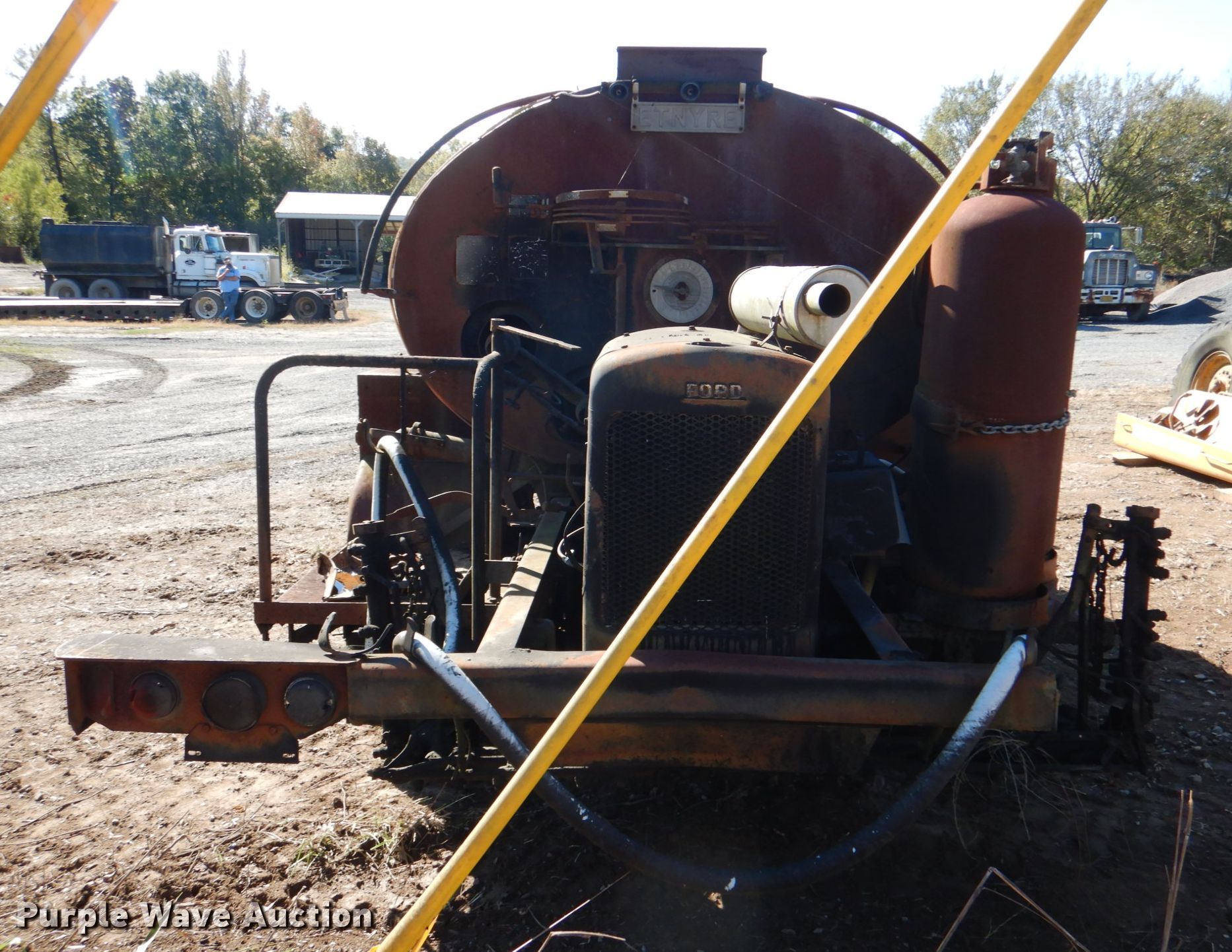 1966 Ford CB oil distributor truck. Miles: 9,112 on odometer, VIN: F60CK889111. Engine Ford, Cylinders: 8, Fuel type: Gas. Transmission Manual, Speed: 5. Chassis Axles: Single, Brakes: Hydraulic. Operational Bed / tank Etnyre Blacktopper BT-RS, Serial: J-3678, Capacity: 1,065 gallons, 9' L, Water tank Spray bar: Rear. Tires Size: 8.25-20. Notes Non-operational unit. Arkansas title. Title distribution may be delayed up to 30 days from verification of funds. Polk County, AR. 135 Polk Rd 733. Mena, AR 71953