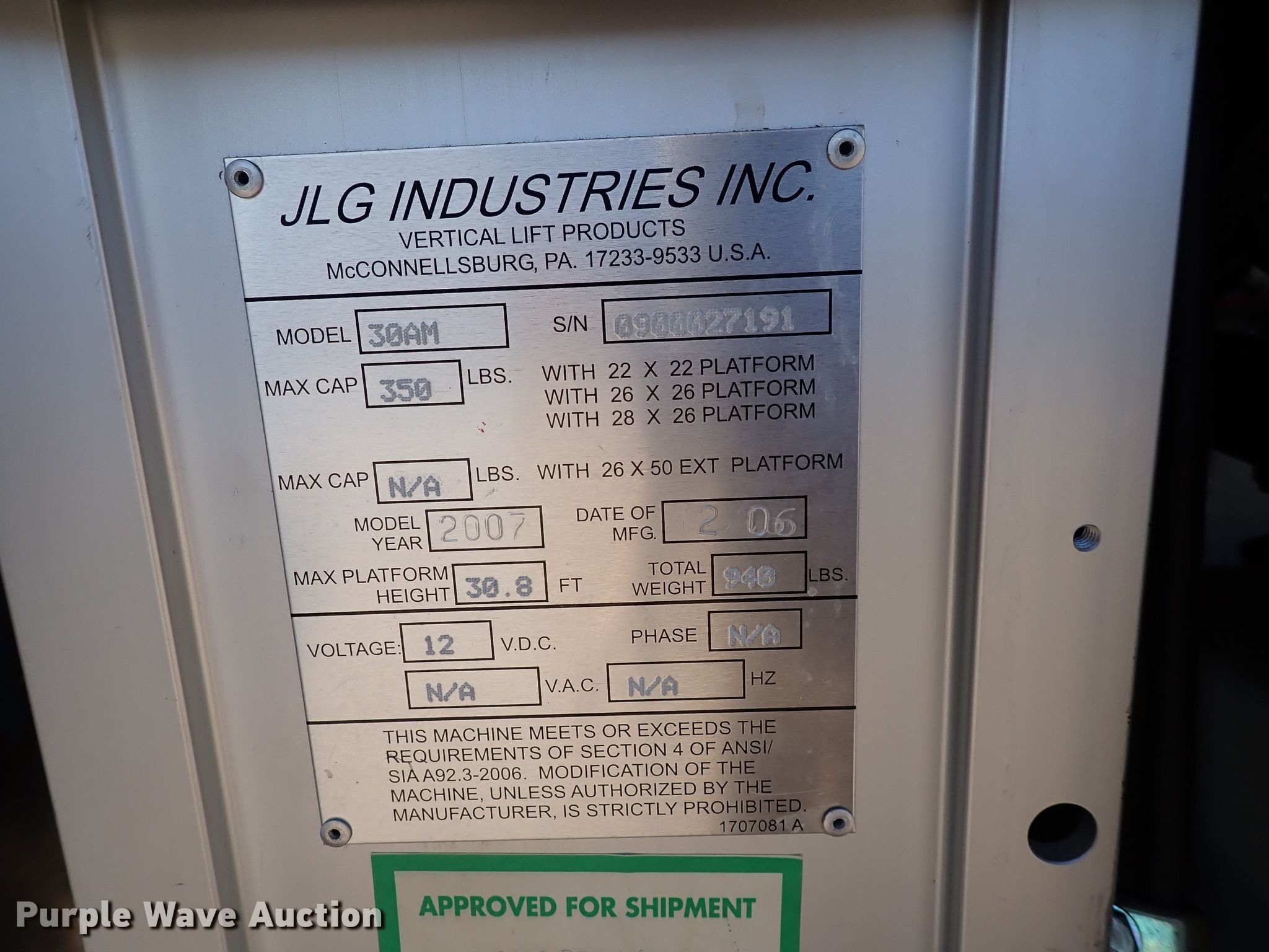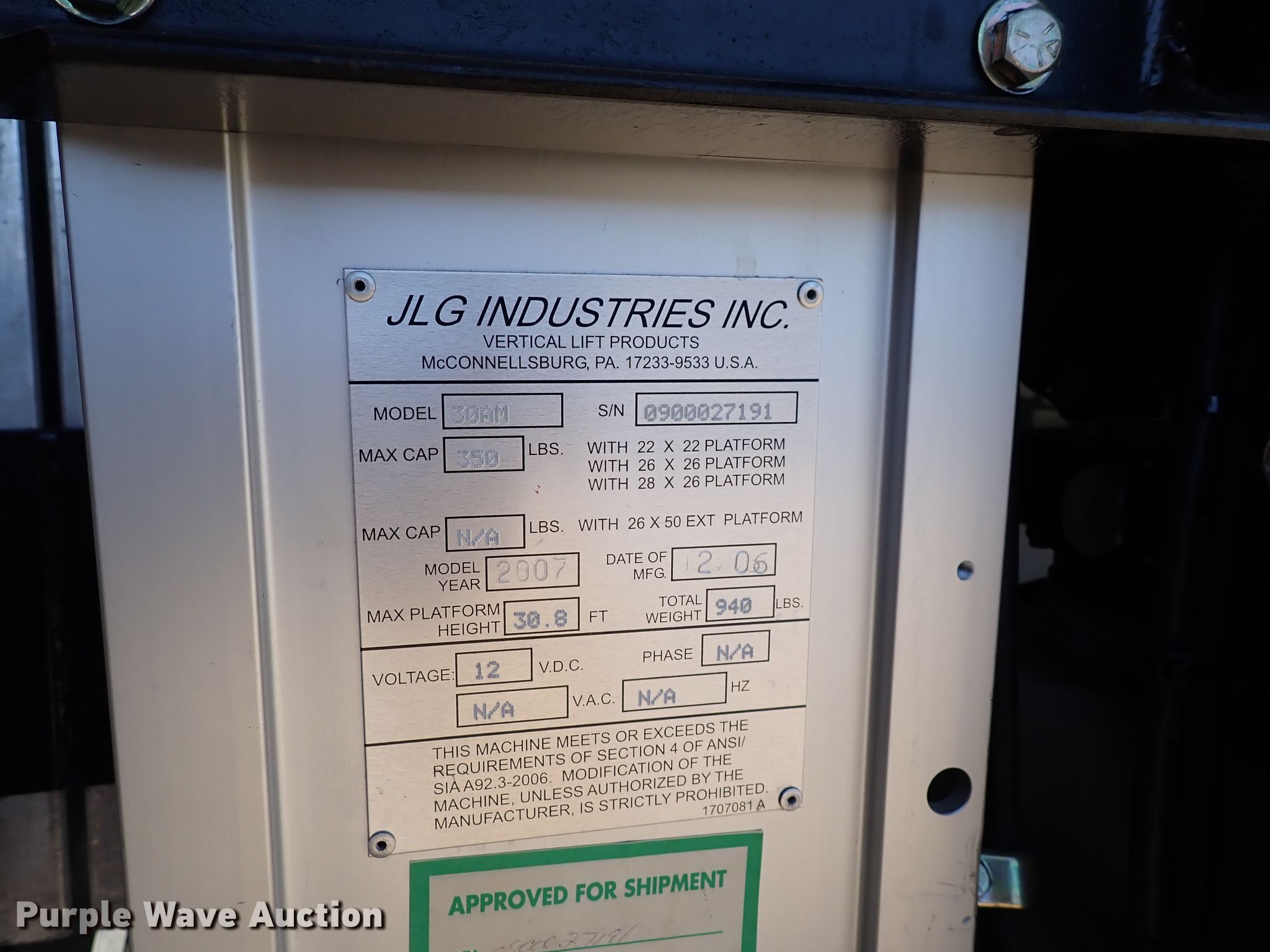 Purple Wave is selling a used Scissor or Vertical Lift in Kansas. This item is a 2007 JLG 30AM vertical lift with the following: Serial: 0900027191