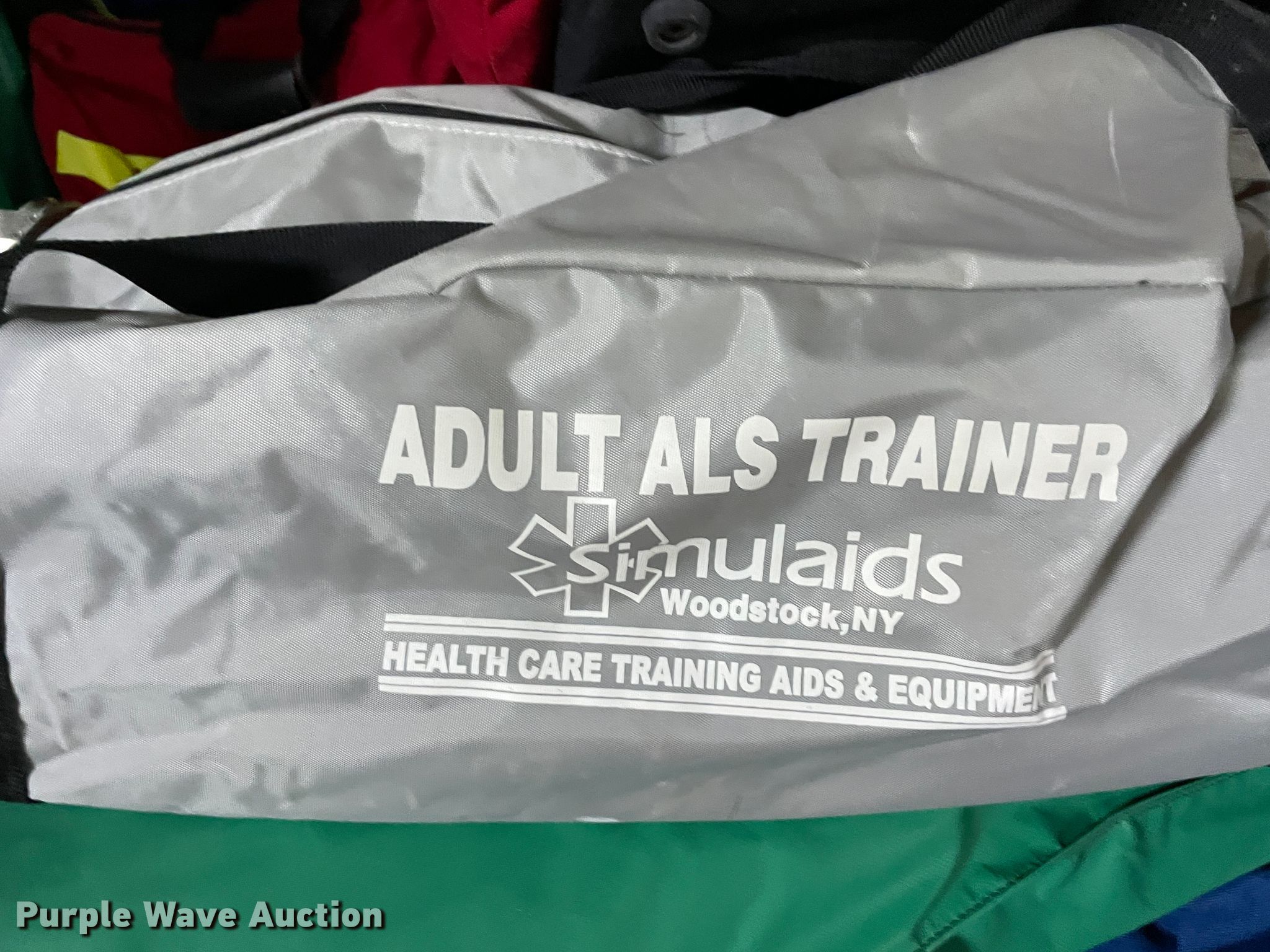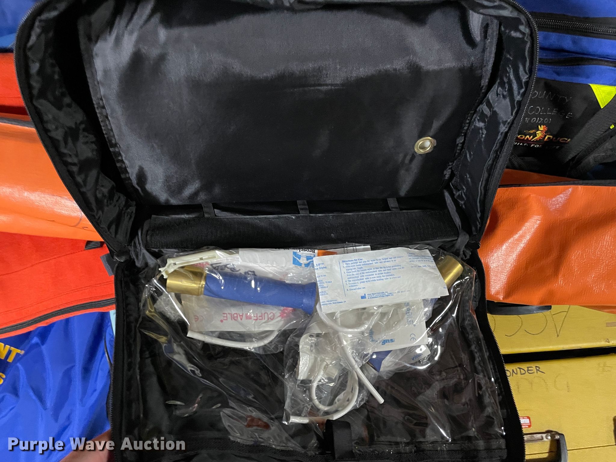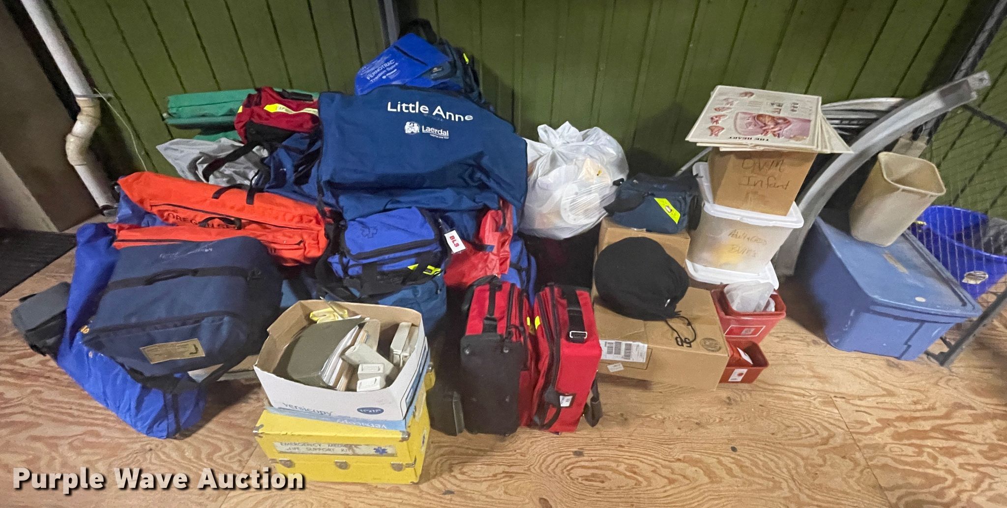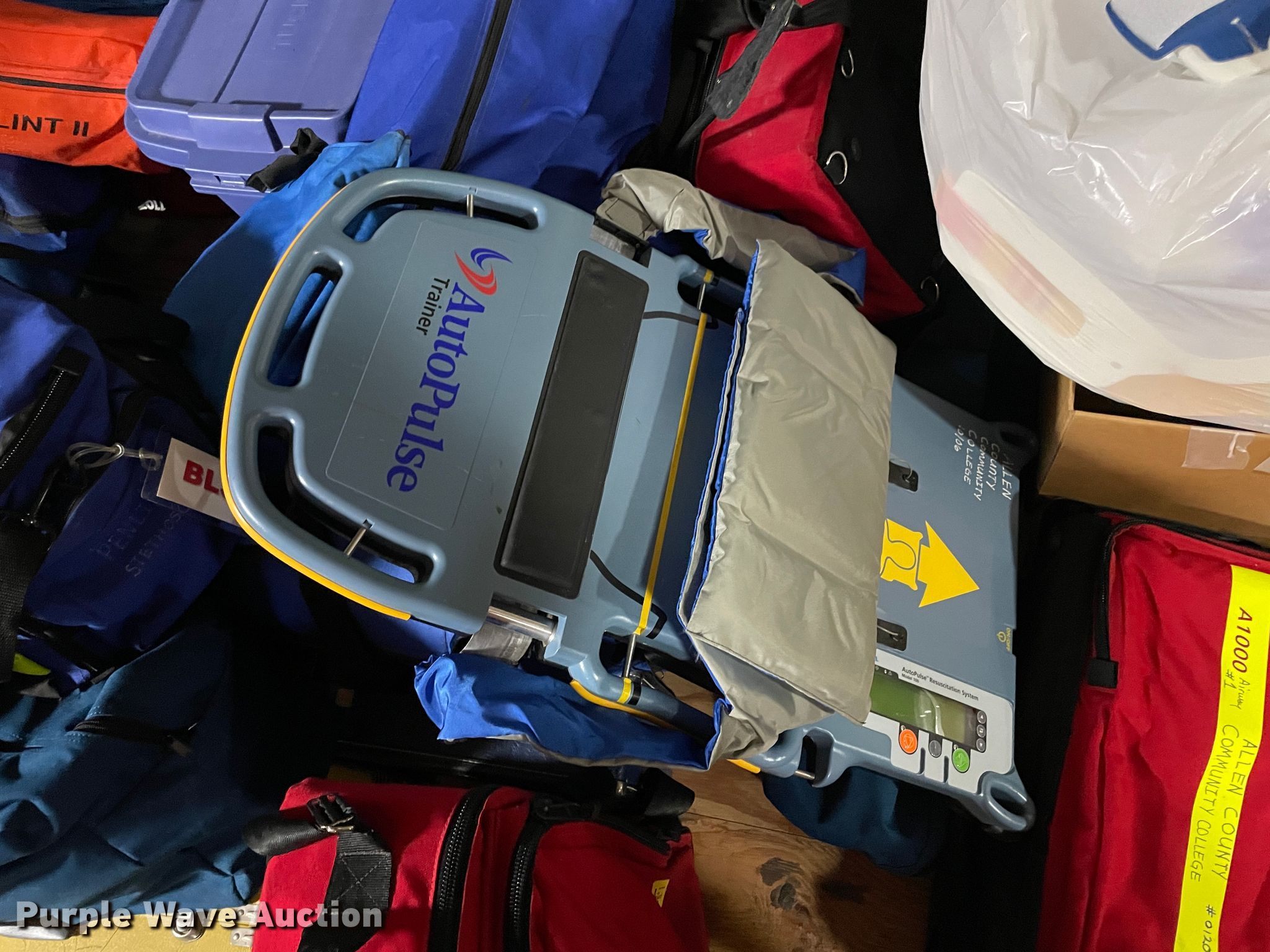 Purple Wave is selling a used Medical Equip. in Kansas. This item is a Medical training supplies with the following: (2) ALS drug bags, (2) extrication devices, (3) airway kits, (4) oxygen tanks, (5) body part signs, (6) back board, Adult and child B.V.M totes, Mattress, Aeronistic nebulizers, Airway management trainer, Auto pulse battery charger, B.V.M. infant tote bag, Bag of belt buckles, Bag of head baskets stretchers, Bix box of B.V.M parts, Blood pressure cuffs, Blood pressure meter, BLS bags, Body bag, Box of cords, Brace support tote, Bradycardia, Broselow / Hinkle pediatric ALS color coded organizer, (6) cases of Chris Clean and Armstrong CPR mannequins, Dula plane head drop, Empty traction splint bag, EMT bed with dummy, EVAC U-Splint, F.A.S.T. 1 training system, Face masks tote folding chair, Fracture pack, GRIPA, I.V. arm, I.V. kit, I.V. stand, Infectious waste bin, Intubation kit, Red bag, IV pump, (3) Jamar Hand dynamometer jobst anti-shock air pants, Laerdal bag, Laerdal vitalism vital sign simulator, Lange skinfold caliper LCSU laerdal compat suction units, Leg splints, Life form replica mannequin, Life support kits, Little Anne bags, One box of lungs, Mannequins, Mast 111-AT medical anti-shock, Medical bag, Mega code kid trauma laerdal, Motorcycle helmet, MX PRO EMT bed, Neck braces, Non-breathing bag, Long boars, Oregon Spine Spint II, PEDI-AIR align, Pulmonated compressor, Resusci Anne Torso, Resusci baby, S400 intubation, Sager emergency traction splints, S-Scort JR quickdraw, S-Scort machine, Stair chair, Stretcher, Traction splint, Vital signs, Zoll A.E.D. machine, Zoll autopulse resuscitation system, Zoll base power charger 17 battery