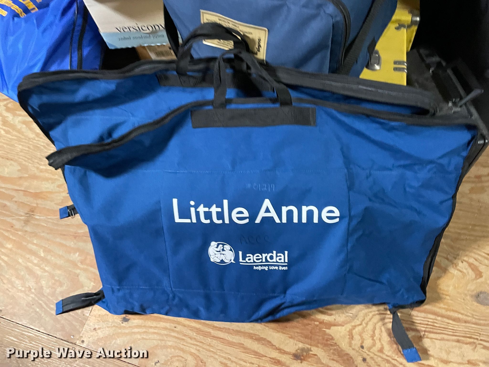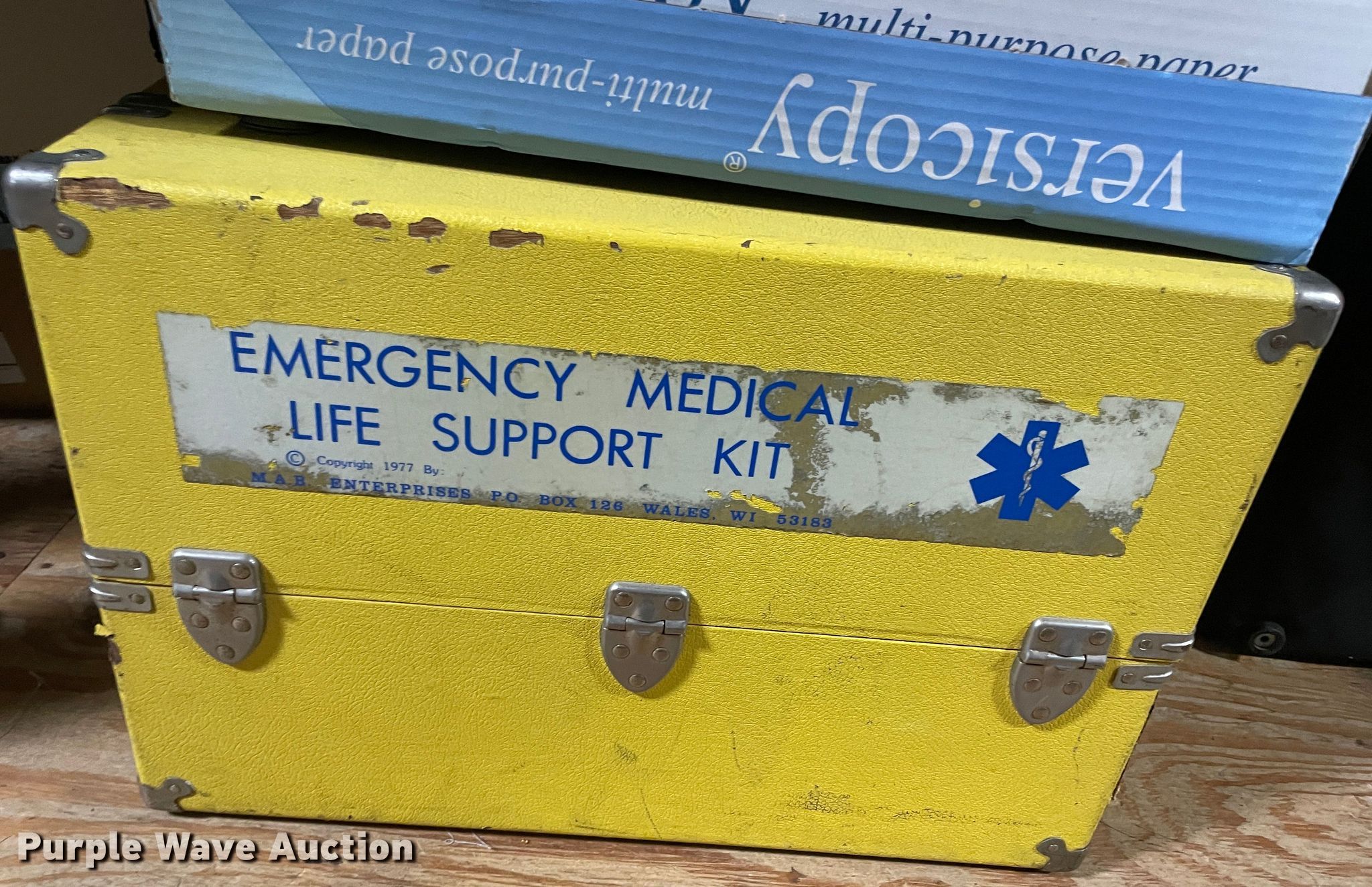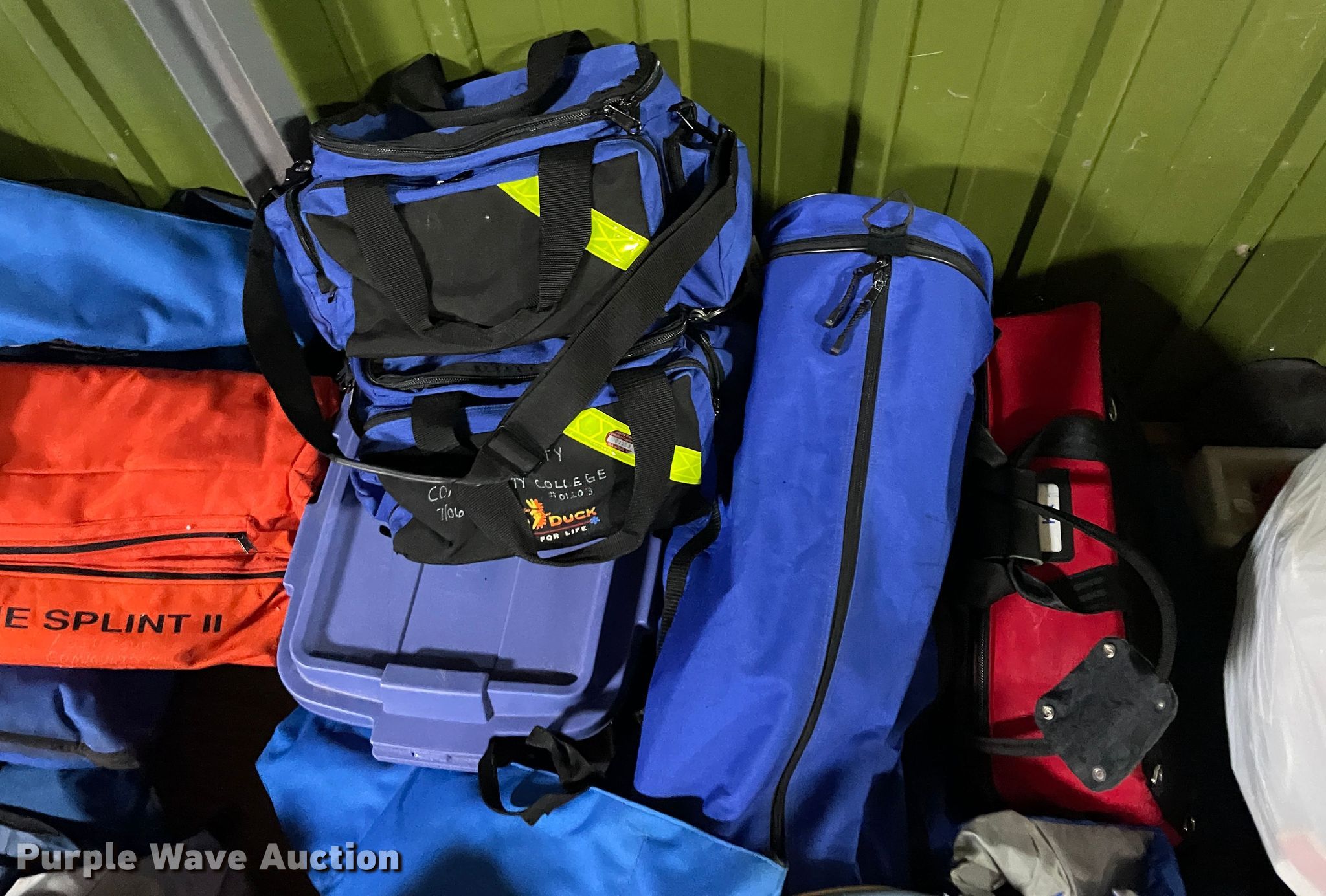 Purple Wave is selling a used Medical Equip. in Kansas. This item is a Medical training supplies with the following: (2) ALS drug bags, (2) extrication devices, (3) airway kits, (4) oxygen tanks, (5) body part signs, (6) back board, Adult and child B.V.M totes, Mattress, Aeronistic nebulizers, Airway management trainer, Auto pulse battery charger, B.V.M. infant tote bag, Bag of belt buckles, Bag of head baskets stretchers, Bix box of B.V.M parts, Blood pressure cuffs, Blood pressure meter, BLS bags, Body bag, Box of cords, Brace support tote, Bradycardia, Broselow / Hinkle pediatric ALS color coded organizer, (6) cases of Chris Clean and Armstrong CPR mannequins, Dula plane head drop, Empty traction splint bag, EMT bed with dummy, EVAC U-Splint, F.A.S.T. 1 training system, Face masks tote folding chair, Fracture pack, GRIPA, I.V. arm, I.V. kit, I.V. stand, Infectious waste bin, Intubation kit, Red bag, IV pump, (3) Jamar Hand dynamometer jobst anti-shock air pants, Laerdal bag, Laerdal vitalism vital sign simulator, Lange skinfold caliper LCSU laerdal compat suction units, Leg splints, Life form replica mannequin, Life support kits, Little Anne bags, One box of lungs, Mannequins, Mast 111-AT medical anti-shock, Medical bag, Mega code kid trauma laerdal, Motorcycle helmet, MX PRO EMT bed, Neck braces, Non-breathing bag, Long boars, Oregon Spine Spint II, PEDI-AIR align, Pulmonated compressor, Resusci Anne Torso, Resusci baby, S400 intubation, Sager emergency traction splints, S-Scort JR quickdraw, S-Scort machine, Stair chair, Stretcher, Traction splint, Vital signs, Zoll A.E.D. machine, Zoll autopulse resuscitation system, Zoll base power charger 17 battery