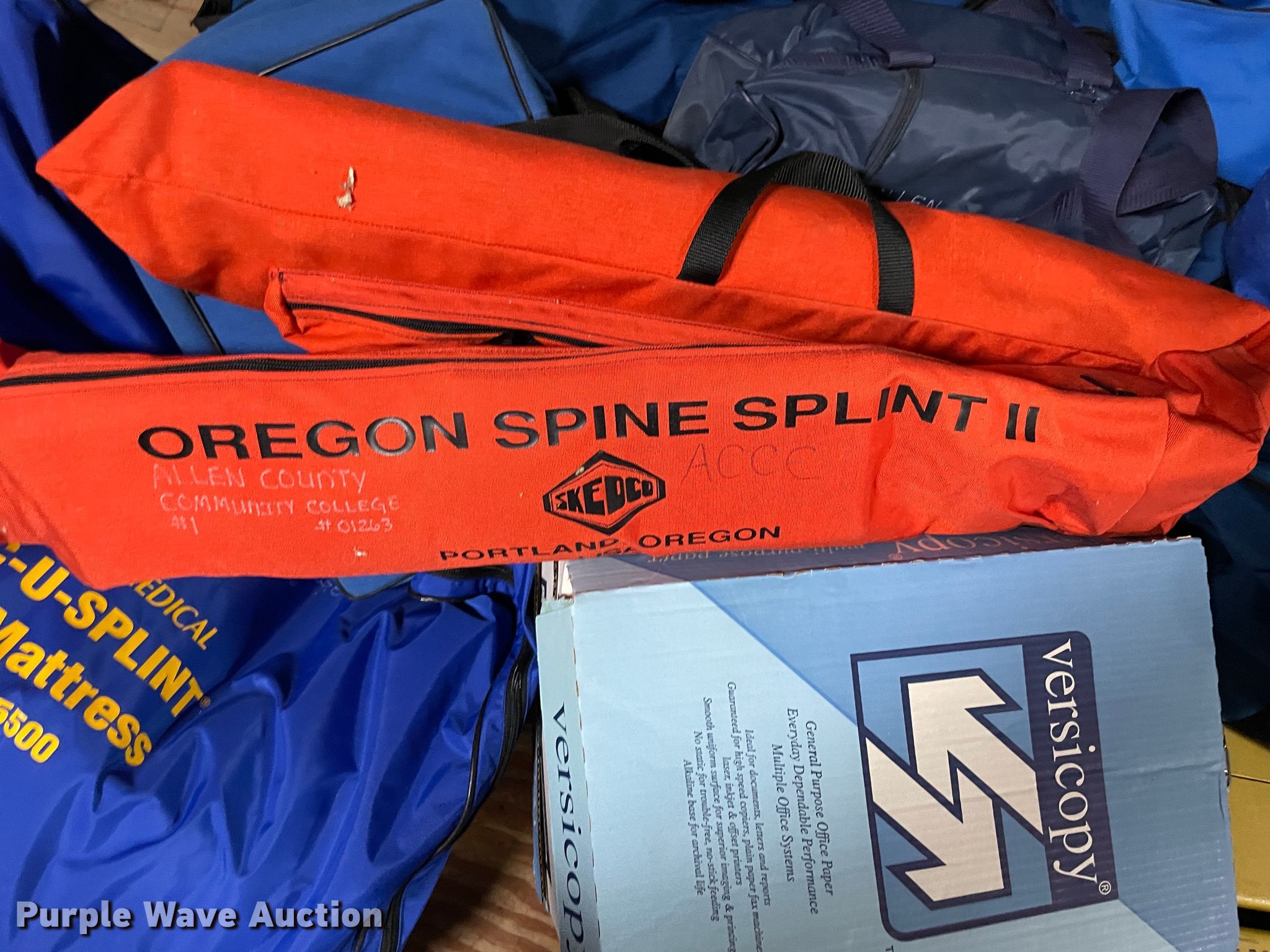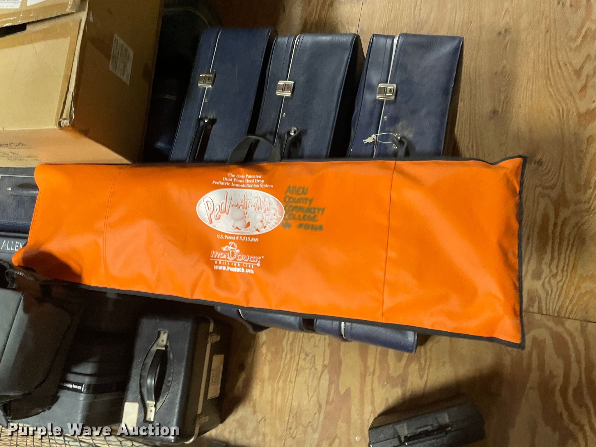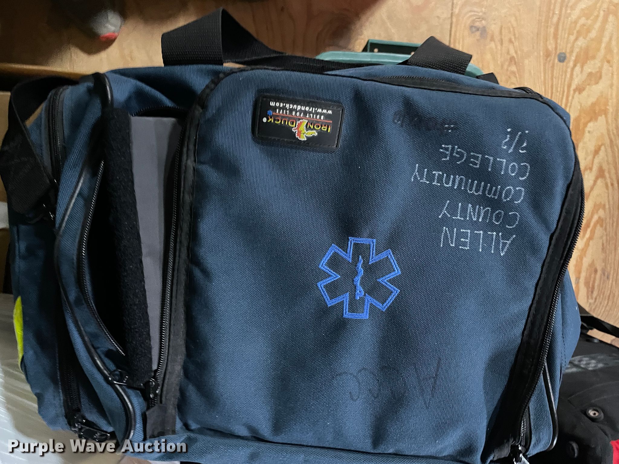 Medical training supplies. (2) ALS drug bags, (2) extrication devices, (3) airway kits, (4) oxygen tanks, (5) body part signs, (6) back board, Adult and child B.V.M totes, Mattress , Aeronistic nebulizers, Airway management trainer, Auto pulse battery charger, B.V.M. infant tote bag, Bag of belt buckles, Bag of head baskets stretchers, Bix box of B.V.M parts, Blood pressure cuffs, Blood pressure meter, BLS bags, Body bag, Box of cords, Brace support tote, Bradycardia , Broselow / Hinkle pediatric ALS color coded organizer, (6) cases of Chris Clean and Armstrong CPR mannequins, Dula plane head drop, Empty traction splint bag, EMT bed with dummy, EVAC U-Splint, F.A.S.T. 1 training system, Face masks tote folding chair, Fracture pack , GRIPA , I.V. arm, I.V. kit, I.V. stand, Infectious waste bin, Intubation kit Red bag, IV pump, (3) Jamar Hand dynamometer jobst anti-shock air pants, Laerdal bag, Laerdal vitalism vital sign simulator , Lange skinfold caliper LCSU laerdal compat suction units, Leg splints , Life form replica mannequin , Life support kits, Little Anne bags , One box of lungs , Mannequins , Mast 111-AT medical anti-shock, Medical bag, Mega code kid trauma laerdal , Motorcycle helmet, MX PRO EMT bed , Neck braces, Non-breathing bag , Long boars , Oregon Spine Spint II , PEDI-AIR align , Pulmonated compressor, Resusci Anne Torso, Resusci baby, S400 intubation , Sager emergency traction splints, S-Scort JR quickdraw, S-Scort machine , Stair chair, Stretcher , Traction splint, Vital signs, Zoll A.E.D. machine, Zoll autopulse resuscitation system , Zoll base power charger 17 battery. Allen Community College. 1801 N Cottonwood St. Iola, KS 66749