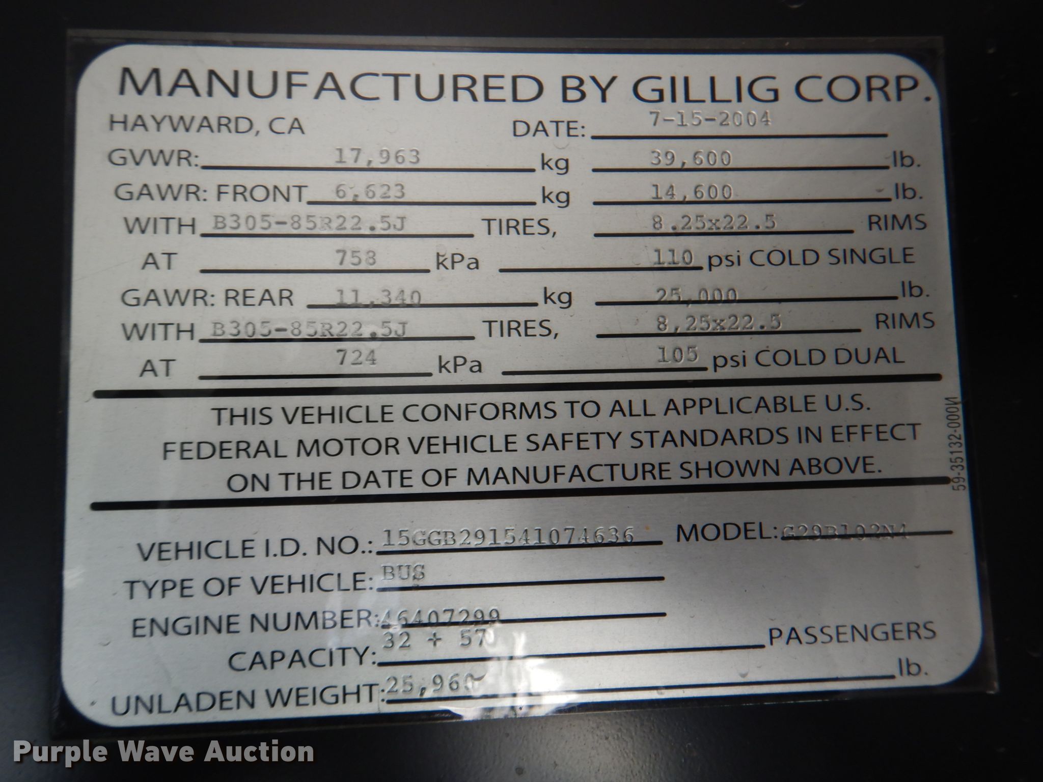 Purple Wave is selling a used Bus in Nebraska. This item is a 2004 Gillig shuttle bus with the following: Miles: 272,751 on hubometer, Estimated mileage: 523,650, VIN: 15GGB291541074636, Unit #: 674