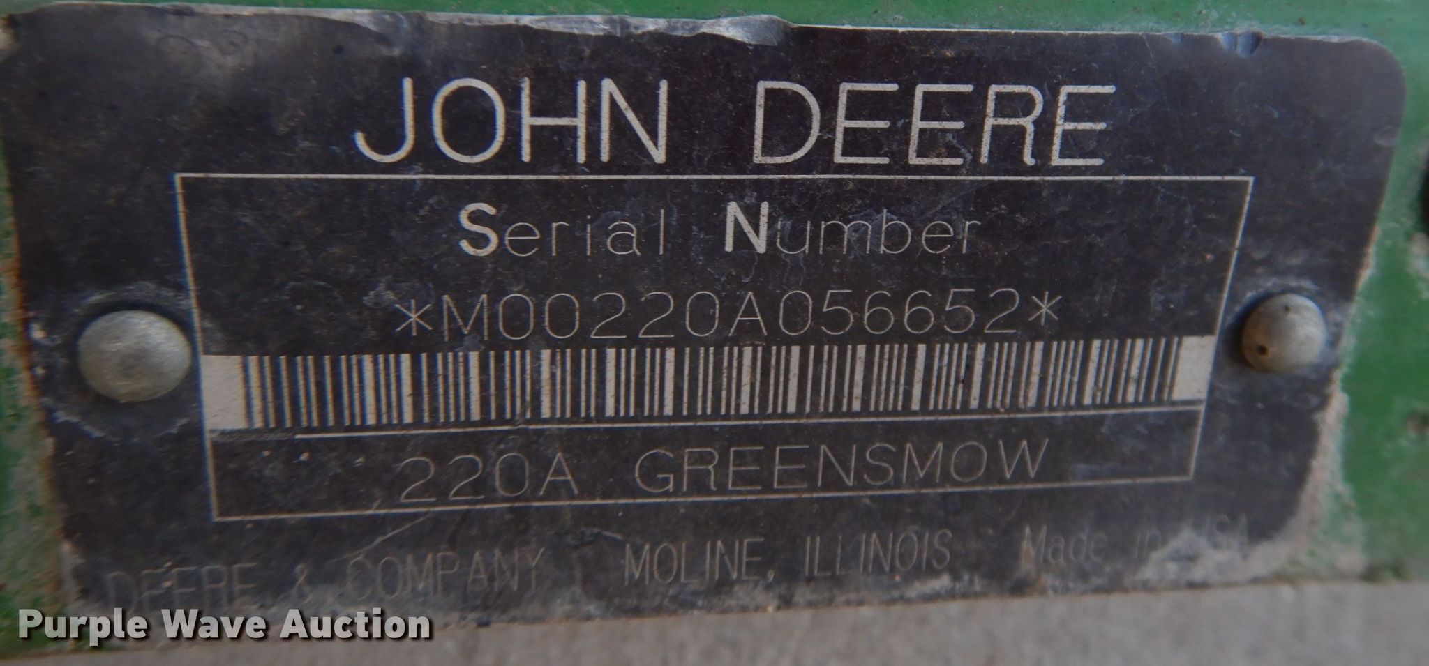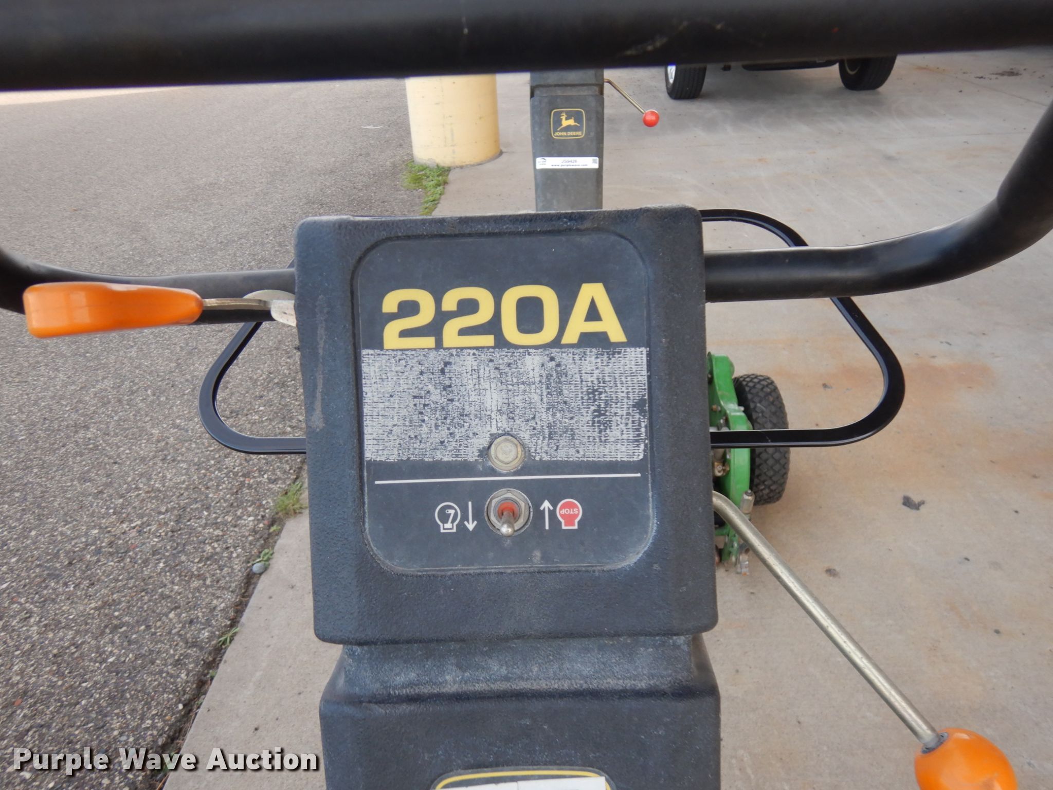 Purple Wave is selling a used Lawn and Garden in Minnesota. This item is a John Deere 220A reel mower with the following: 24"W, Single cylinder gas engine, Serial: M00220A056652