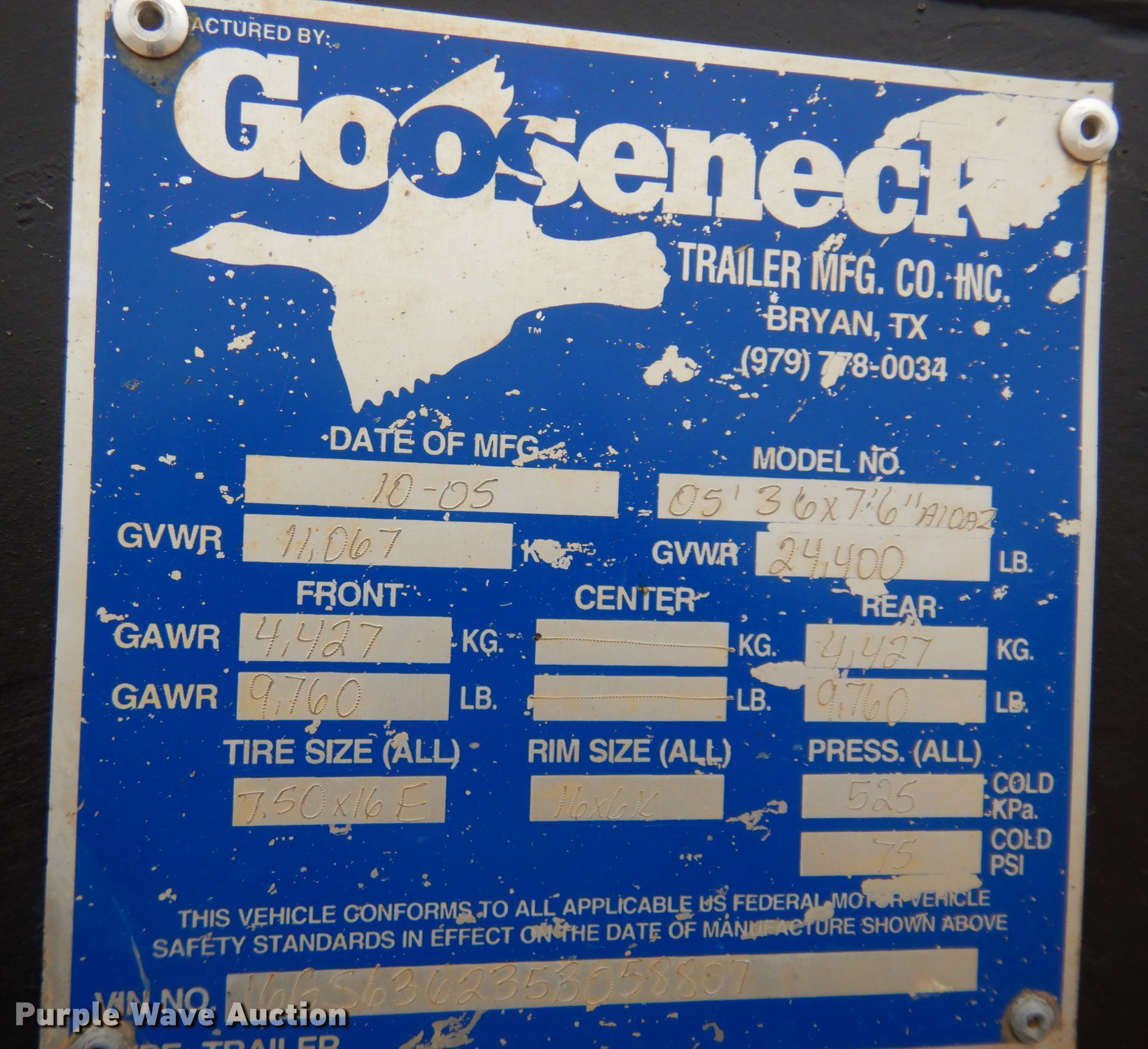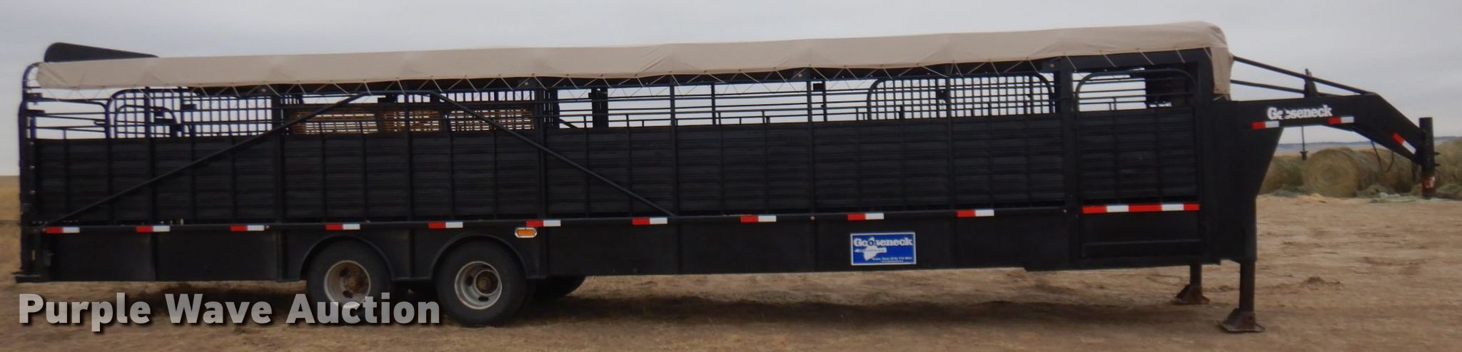 2006 Gooseneck A10A2 livestock trailer. VIN: 16GS636235B058807. Dimensions Overall: 43' L x 7' 9" W, Body: 36' L x 7' 9" W, Side height: 6'. Operational Center gates: 3. Chassis Hitch: Gooseneck, Landing gear: Dual, Suspension: Spring, Brakes: Hydraulic, Axles: Tandem, GVWR: 24,400 lbs, GAWR: 9,760 lbs. Tires Steel wheels, Size: ST235/85R16. Colorado title. Title distribution may be delayed up to 30 days from verification of funds. 365 Hay Company. 42687 County Rd 125. Deer Trail, CO 80105